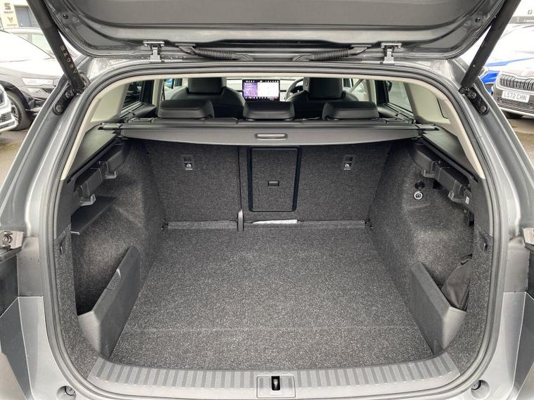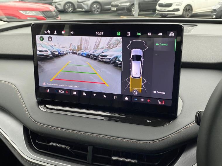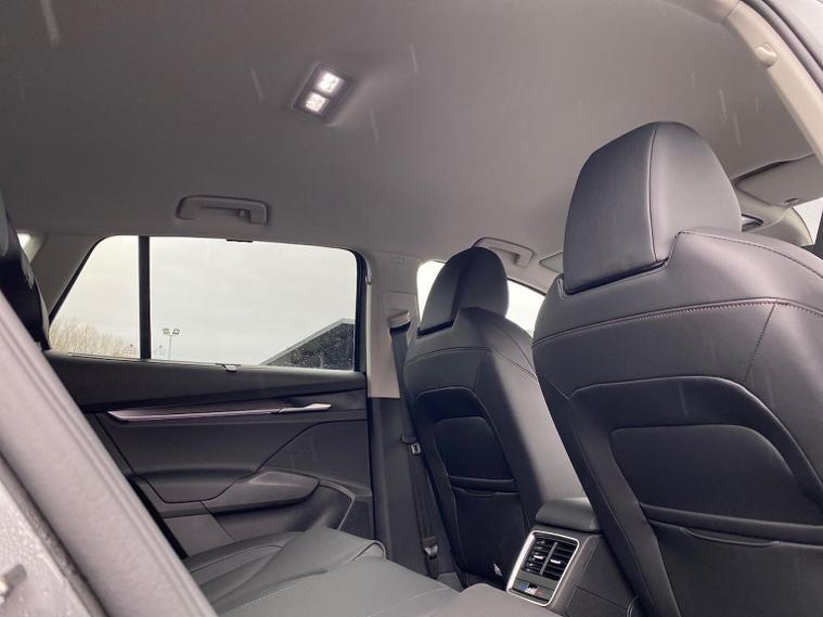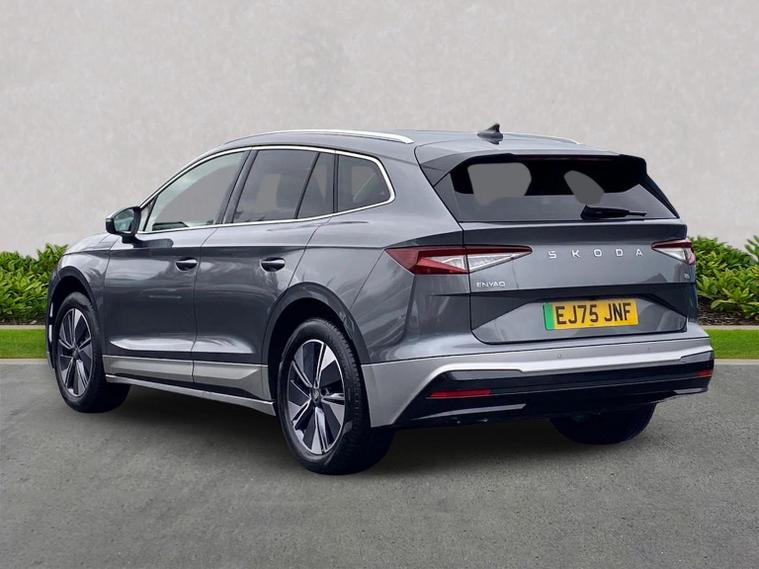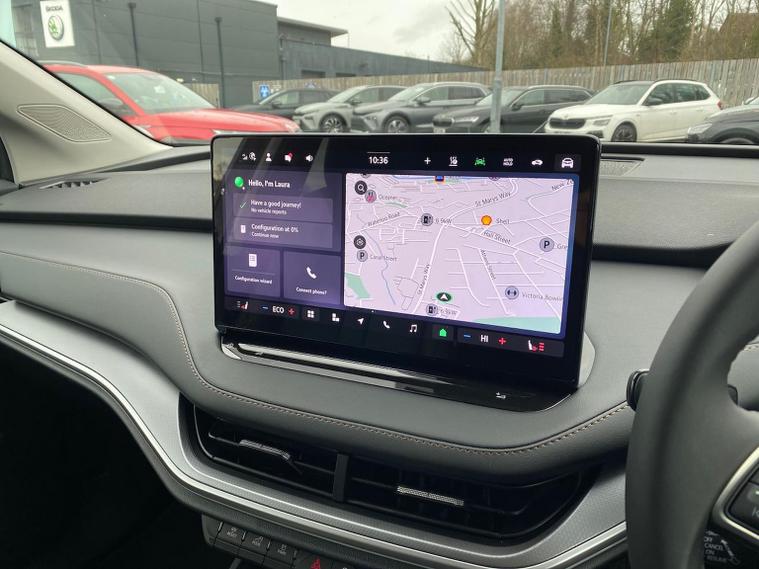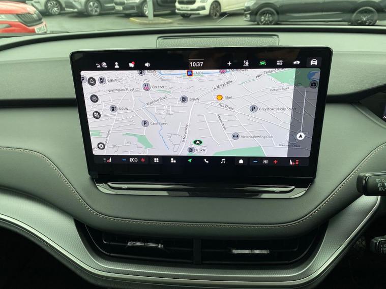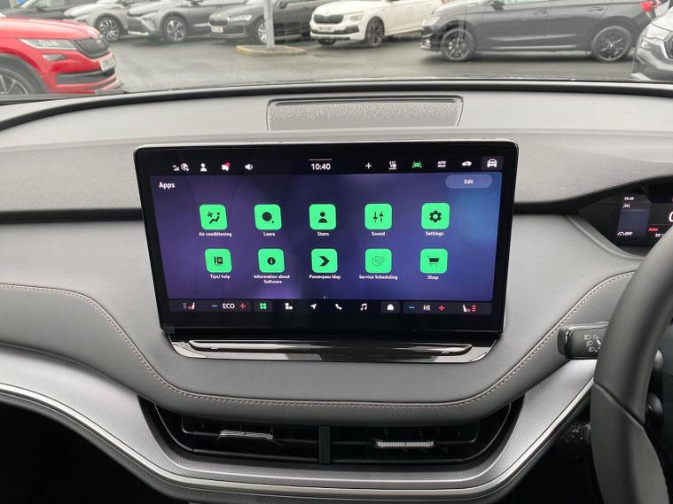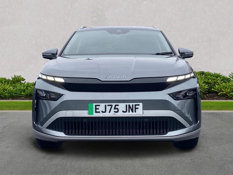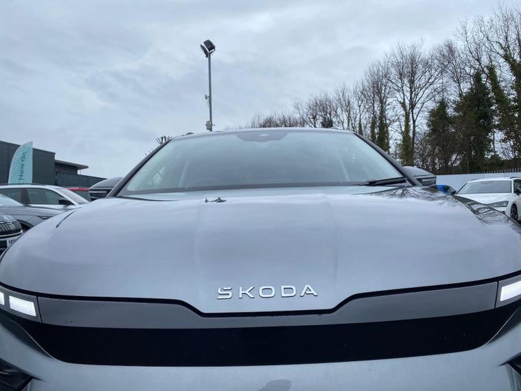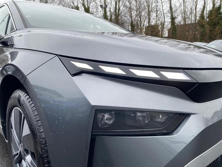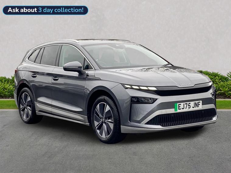 This Škoda Enyaq Edition 85 in Graphite Grey Metallic with the Suite Black interior includes the Suite Design Selection Package (PLB) which adds leather and artificial leather upholstery, LED ambient lighting, Diacut Cross decorative inserts, enhanced door and side trim, front and rear floor mats and footwell lighting. Standard equipment includes a 13" touchscreen with satellite navigation, DAB radio, Bluetooth, wireless Smartlink, wireless phone charging with cooling, USB-C ports in the front and rear, Wi-Fi hotspot capability, e-Call, towbar preparation and Skoda Connect services. Driver assistance features include Blind Spot Detection, Predictive Adaptive Cruise Control with Traffic Jam Assist, Drive Mode Select, front and rear parking sensors, rear view camera, Traffic Sign Recognition, Driver Alert, Voice Control and tyre pressure monitoring. Exterior features include 19" Regulus anthracite alloy wheels, heated, folding and auto-dimming mirrors with boarding spots and welcome logo, privacy glass with acoustic side windows, heat-insulating windscreen, dark chrome roof rails and window trim, rear spoiler and a tyre repair kit. Inside it offers heated front seats, tri-zone climate control, the two-spoke heated multifunction steering wheel, electrically operated tailgate with virtual pedal, sliding boot cover, LED ambient lighting, extended interior noise suppression, gesture control, boot lighting, a 5" digital cockpit and an umbrella. Safety equipment includes front, side, curtain and central interaction airbags, Crew Protect Assist, Front Assist with pedestrian and cyclist detection, Emergency Steering Support, ISOFIX mounts on the front passenger seat and outer rear seats with top tether, Anti-Theft alarm with interior monitoring and walk-away locking, Speed Assist and Travel Assist Plus. Charging features include the Mode 3 32A cable and up to 135kW DC rapid-charging capability. We offer in-person appointments, personal video appointments, test drives and finance options.