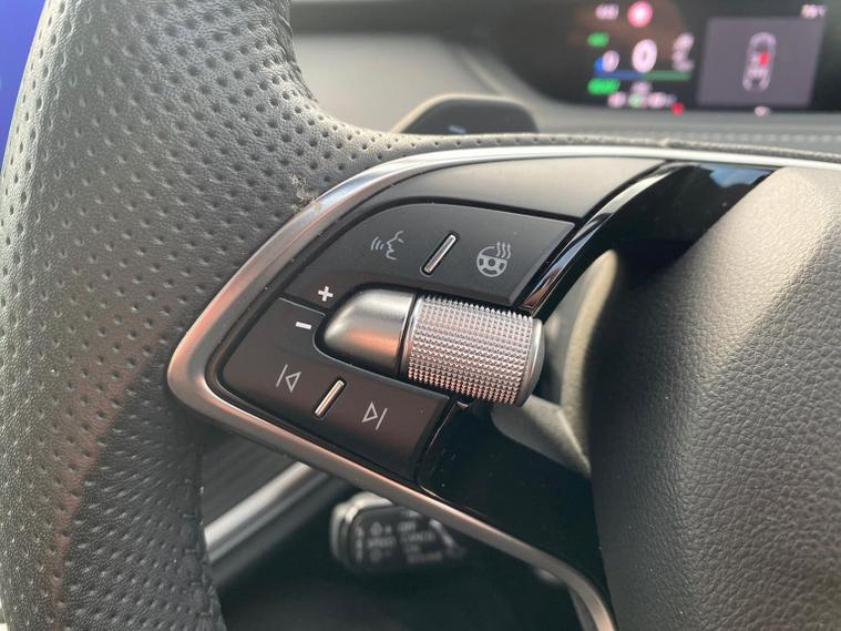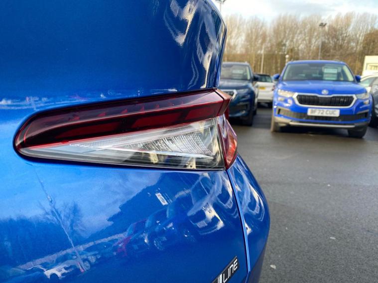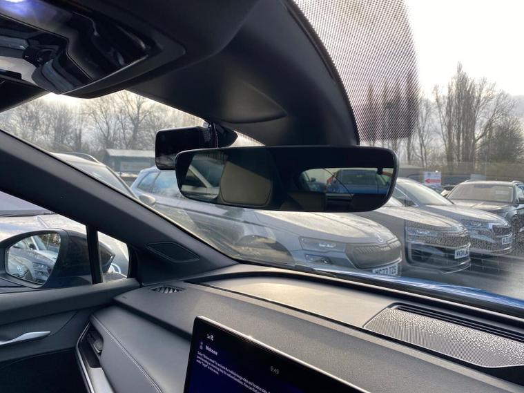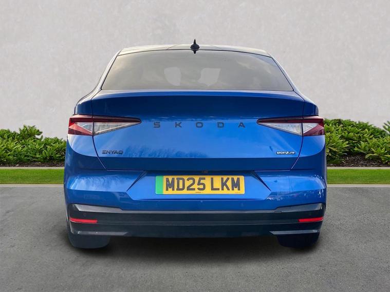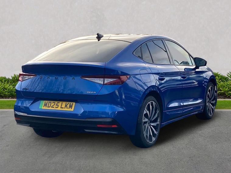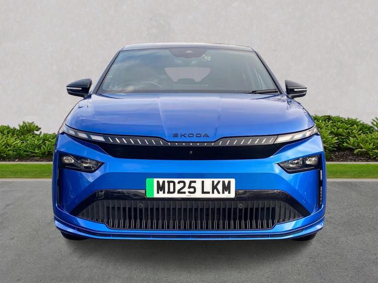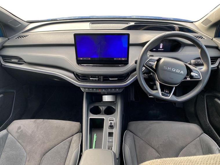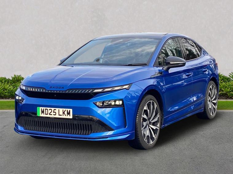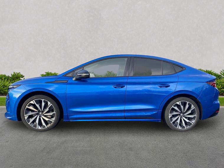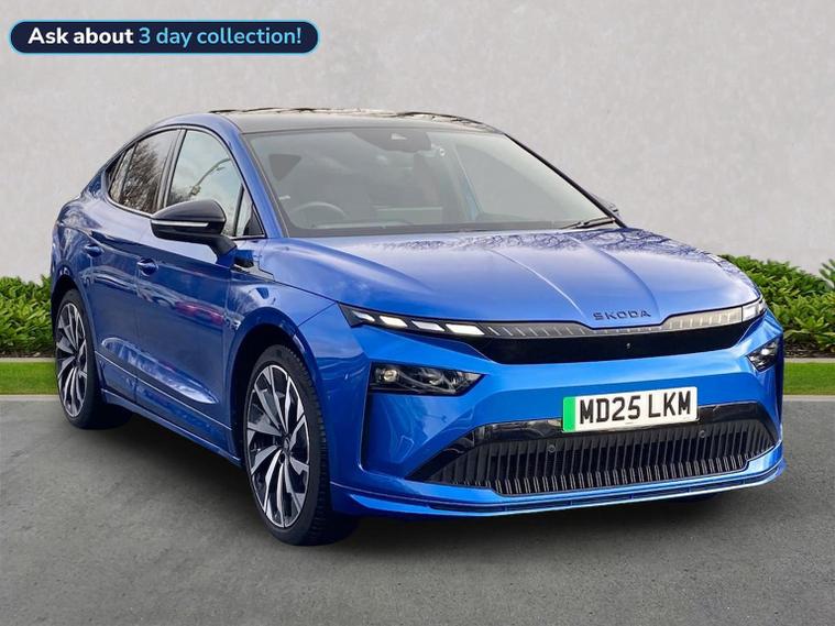 Skoda Enyaq Coupé Sportline 85x (82 kWh, 286 PS) finished in Race Blue Metallic with the SportLine Design Selection interior. Factory equipment includes a 13" touchscreen with satellite navigation, Bluetooth, DAB, wireless charging, WiFi hotspot, USB-C ports front and rear, SmartLink, e-Call, Skoda Connect services and towbar preparation, along with front and rear parking sensors, Predictive Adaptive Cruise Control with Traffic Jam Assist, Blind Spot Detection, Traffic Sign Recognition, Drive Mode Select, Driver Alert and a tyre pressure monitoring system. Exterior features include panoramic sunroof, privacy glass, acoustic side windows, heated and power-folding auto-dimming mirrors with boarding spots and welcome logo, gloss black window trim and lettering, sports bumpers, heat-insulating windscreen and 20" Vega Black alloy wheels, with optional 21" Supernova black alloy wheels and tool kit. Inside it offers front sports seats, heated 3-spoke sports steering wheel with recuperation paddles, tri-zone climate control, LED ambient lighting, gesture control, extended interior noise suppression, electrically operated tailgate with virtual pedal, folding boot cover, aluminium pedals, SportLine interior design, transport package and umbrella. Safety features include front, side, curtain and central airbags, Front Assist with automatic braking, Emergency Steering Support with Turn Assist, Crew Protect Assist, ISOFIX on the front passenger seat and outer rear seats with top tether, Keyless Entry with walk-away locking, alarm with interior monitoring and standard electronic engine sound. Performance highlights include all-wheel drive, sports suspension, progressive dynamic steering, Mode 3 cable and up to 175 kW DC charging capability. The vehicle is UK-spec, not imported, fixed service regime and emission status is not impacted. We offer appointments, personal video appointments, test drives and finance options—just let us know how you’d like to view the vehicle.