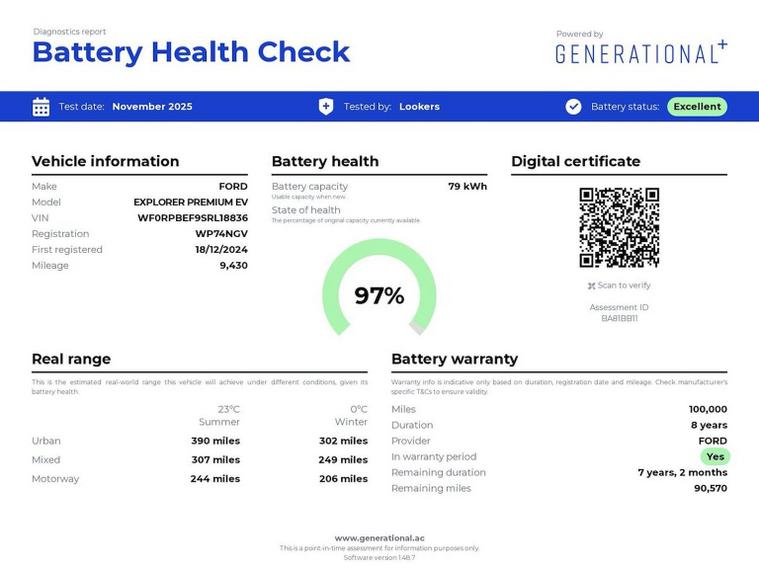Viewing available 7 days a week at Lookers Birmingham. Introducing the Ford Exporer in striking 'Blue my Mind' - ready to hit the road running. This electric vehicle boasts a full service history ann range of 325 miles, shouting luxury not only on the outside but inside too! All our Electric cars are independently Battery Tested by third party testing company 'Generational-ev' , with battery test certificates provided for transparency and your complete piece of mind. This Ford Explorer has resulted in a 'Excellent rating so you can be confident in your purchase. The Ford Explorer 210kW Premium 77kWh 5dr Auto is an all-electric SUV that blends cutting-edge technology, premium comfort, and adventure-ready capability into one striking package. Built to take on every journey with confidence, the Explorer offers an impressive all-electric range, making it a smart choice for drivers looking to embrace a greener future without compromising on power or practicality. With a sleek and muscular design, the Explorer has a bold front grille, dynamic LED lighting, and aerodynamic styling that commands attention on the road. Its spacious five-seat cabin is crafted for comfort, featuring high-quality materials, an intuitive digital cockpit, and ambient lighting to enhance the driving experience. Powered by a 210kW electric motor, the Explorer delivers instant acceleration and smooth, effortless performance, making every drive exhilarating. The 77kWh battery ensures a long range on a single charge, and with rapid-charging capability, you can top up the battery quickly at fast-charging stations, keeping you on the move with minimal downtime. The Explorer comes packed with advanced technology, including Ford’s state-of-the-art infotainment system, Apple CarPlay and Android Auto connectivity, and a fully digital driver display that keeps all your essential information right in front of you. Adaptive Cruise Control. Designed for both city driving and long-distance road trips, the Explorer offers generous interior space and a versatile boot, ensuring you have plenty of room for luggage, sports gear, or family essentials. Whether you're heading on a weekend getaway, an outdoor adventure, or just tackling the daily commute, this SUV is ready for anything. This car is Clean air zone compliant and does not attract any form of charge in Birmingham clean Air Zone. We understand that you rely on your car, so every car we sell is fully prepared to main dealer standard, for your peace of mind. All our vehicles pass a thorough 150 point check, are serviced and MOT’d as required by manufacturer trained technicians and are offered with up to 4 years warranty. Every car we sell is HPI clear so you can have the confidence that by choosing Lookers for your next purchase, you are choosing your perfect car. Competitive finance packages and nationwide delivery available. ESTABLISHED IN 1908, LOOKERS HAVE OVER 100 YEARS EXPERIENCE IN THE TRADE. BOOK YOUR TEST DRIVE NOW.