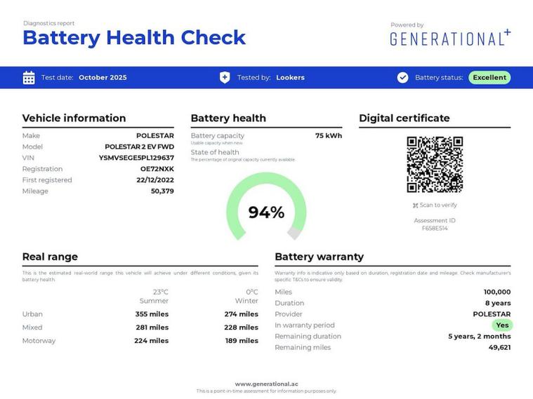Viewing available 7 days a week at Lookers Birmingham. Purchased from our most trusted supplier, this Polestar 2 has arrived in style. Boasting a one owner full service history title with fantastic looks, this purchase opportunity isn't to be missed! As luxury comes as standard with a advertised 240 mile range what isn't to love? We have also prepared and serviced to OEM standard ready for it's new owner to hit the road! All our Electric cars are independently Battery Tested by third party testing company 'Generational-ev' , with battery test certificates provided for transparency and your complete piece of mind. This Polestar has resulted in a 'Excellent' rating so you can be confident in your purchase, the vehicle also benefit from the balance of the Polestar battery warranty. Powered by a 170kW electric motor and a 78kWh long-range battery, this Polestar 2 delivers instant torque, smooth acceleration, and a serene driving experience. Offering excellent range and refined performance, it’s built for drivers who want both efficiency and excitement. Finished in special metallic paintwork called Jupiter, this Polestar 2 exudes understated elegance. The design is minimalist yet striking, enhanced by 19" diamond-cut alloy wheels, signature LED lighting, and the clean, sculpted lines that define the brand’s modern electric identity. Step inside the cabin and you’ll discover a premium, minimalist interior crafted from high-quality sustainable materials. The infotainment system powered by Google provides seamless access to Google Maps, Assistant, and Play Store, displayed on a crystal-clear touchscreen. Enjoy a wealth of features including heated seats, a digital driver display, wireless smartphone charging, and dual-zone climate control, ensuring comfort and connectivity throughout every journey. This car is Clean Air Zone compliant and does not attract any form of charge in Birmingham’s Clean Air Zone. We understand that you rely on your car, so every vehicle we sell is fully prepared to main dealer standards for your peace of mind. All our cars pass a thorough 150-point check, are serviced and MOT’d as required by manufacturer-trained technicians, and are offered with up to 4 years’ warranty. Every car we sell is HPI clear, so you can have full confidence that by choosing Lookers for your next purchase, you’re choosing your perfect car. Competitive finance packages and nationwide delivery are available. ESTABLISHED IN 1908, LOOKERS HAVE OVER 100 YEARS EXPERIENCE IN THE TRADE. BOOK YOUR TEST DRIVE NOW.