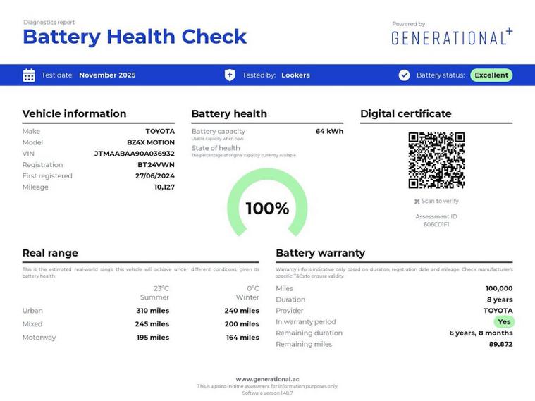 Viewing available 7 days a week at Lookers Birmingham. This stunning Toyota BZ4X is part of one of our many motability fleet purchases and boasts a one owner full service history title. We are extremely excited to stock such a rare vehicle and have the opportuntiy to pass the privilege onto it's next owner. This vehicle has also been prepared here at Lookers Birmingham to give it the care and attention it deserves! If you are in the market for a BZ4X - this one isn't to be missed! All our Electric cars are independently Battery Tested by third party testing company 'Generational-ev' , with battery test certificates provided for transparency and your complete piece of mind. This Toyota has resulted in a 'Excellent' rating so you can be confident in your purchase, the vehicle also benefit from the balance of the Toyota battery warranty. Experience the future of electric driving with the Toyota bZ4X Motion, a cutting-edge all-electric SUV that combines bold design, advanced technology, and Toyota’s legendary reliability. This sleek, modern EV offers exceptional refinement and impressive performance, making it the perfect choice for those seeking efficiency, comfort, and innovation in one stylish package. Finished in a striking, contemporary design, the bZ4X Motion features aerodynamic body lines, LED lighting, and distinctive alloy wheels, giving it a commanding and futuristic presence on the road. Powered by a 150kW electric motor and a 71.4kWh battery, it delivers smooth, instant acceleration with zero emissions. The efficient electric powertrain, paired with Toyota’s advanced engineering, ensures an enjoyable, quiet drive with an impressive range and quick charging capability — including 11kW AC charging for added convenience. Inside, the Motion trim offers a premium, spacious, and technology-focused cabin. Highlights include a large touchscreen infotainment system, Apple CarPlay and Android Auto, satellite navigation, heated front seats, dual-zone climate control, a digital driver’s display, and a reversing camera, all designed to make every journey as comfortable and connected as possible. This car is Clean Air Zone compliant and does not attract any form of charge in Birmingham’s Clean Air Zone. We understand that you rely on your car, so every vehicle we sell is fully prepared to main dealer standards for your peace of mind. All our cars pass a thorough 150-point check, are serviced and MOT’d as required by manufacturer-trained technicians, and are offered with up to 4 years’ warranty. Every car we sell is HPI clear, so you can have full confidence that by choosing Lookers for your next purchase, you’re choosing your perfect car. Competitive finance packages and nationwide delivery are available. ESTABLISHED IN 1908, LOOKERS HAVE OVER 100 YEARS EXPERIENCE IN THE TRADE. BOOK YOUR TEST DRIVE NOW.12