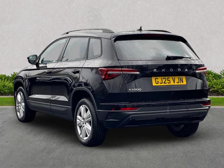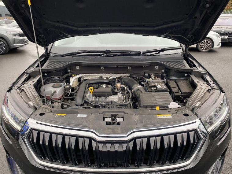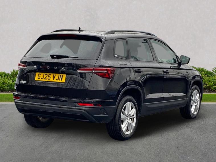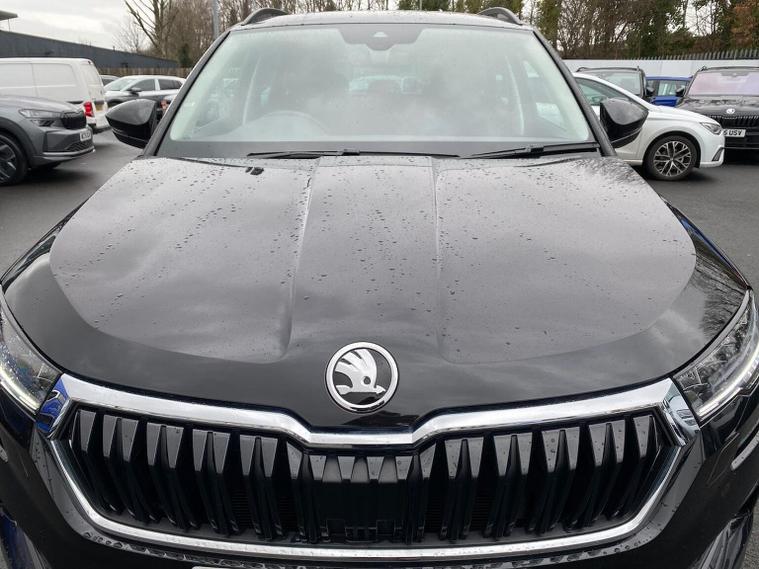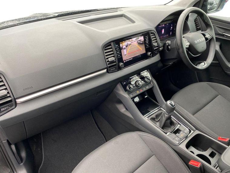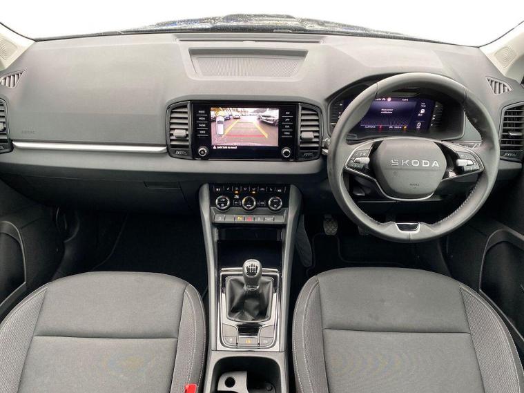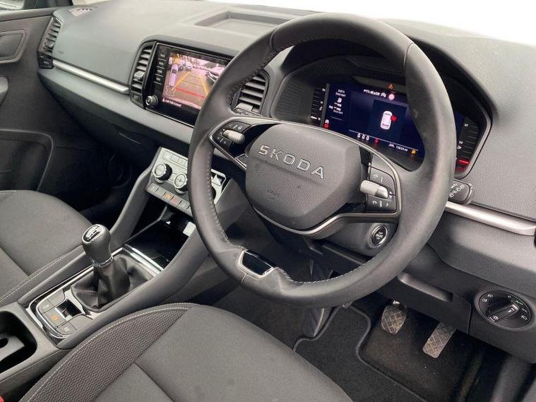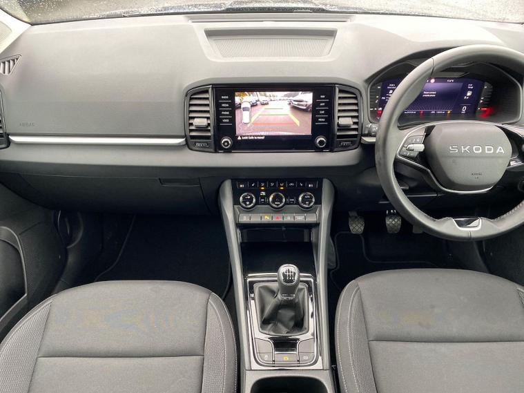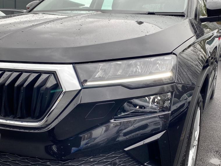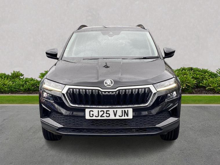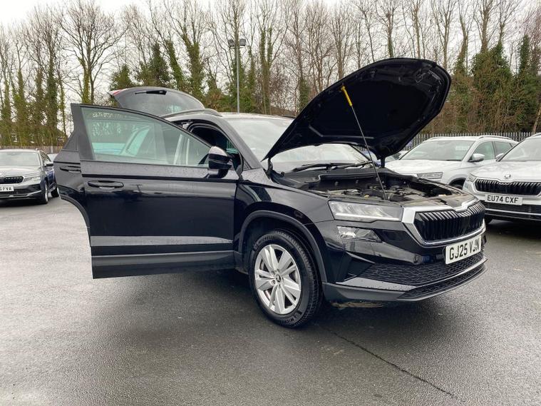This Škoda Karoq SE Edition 1.0 TSI 116PS manual in Black Magic Pearl Effect with Loft interior includes the AM Edition SE/SL package, adding an alarm with interior monitoring, backup horn, tilt sensor and SAFE function, front and rear parking sensors, rear view camera, heated front seats, headlight washers, keyless entry and start/stop and a two-spoke heated multifunction leather steering wheel. Standard SE Edition equipment includes the 9.2" Škoda navigation system, wireless SmartLink, DAB radio, Bluetooth, Care Connect services, 8 speakers, web radio, virtual cockpit with 10.25" display, cruise control with speed limiter, Driver Alert, Traffic Sign Recognition, TPMS, rear parking sensors, LED headlights, LED rear lights, fog lights, black roof rails, electrically adjustable and heated door mirrors, front and rear electric windows, heated rear screen and a tyre repair kit. Inside it offers dual-zone climate control, height-adjustable front seats with lumbar support, front centre armrest, illuminated glovebox, textile floor mats, overhead glasses holder, rear seat pockets, cargo elements, net package with top tether hooks and a ticket holder on the windscreen. Safety equipment includes front, side and curtain airbags, passenger airbag deactivation, Front Assist, Lane Assist, Hill Hold Control, ISOFIX on the front passenger seat and rear seats, disc brakes and seatbelt reminders. We offer in-person appointments, personal video appointments, test drives and finance options.