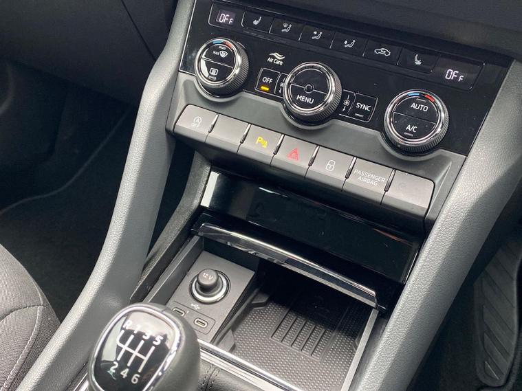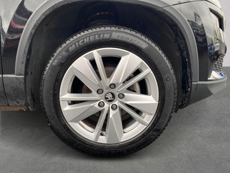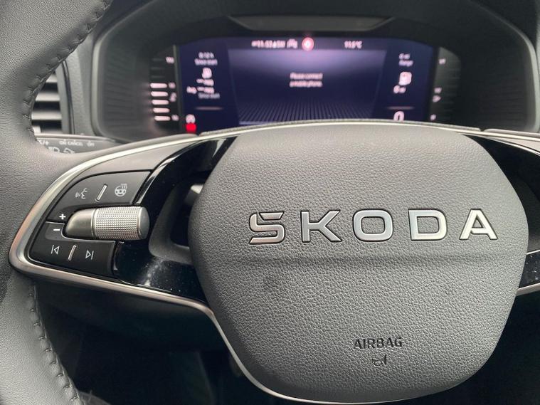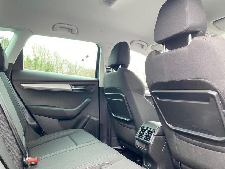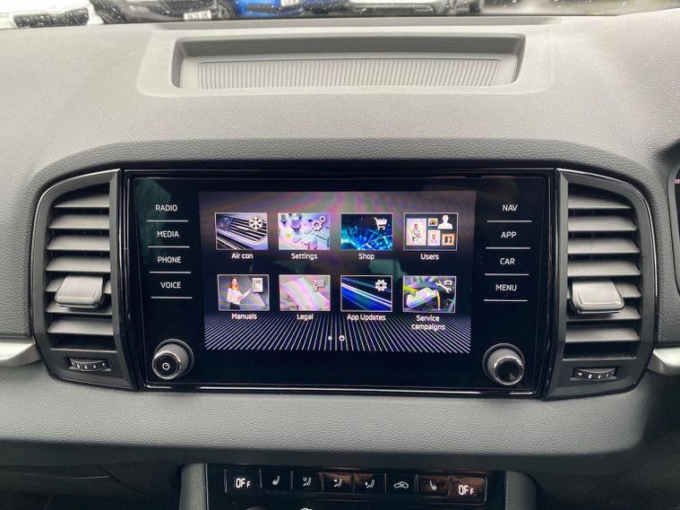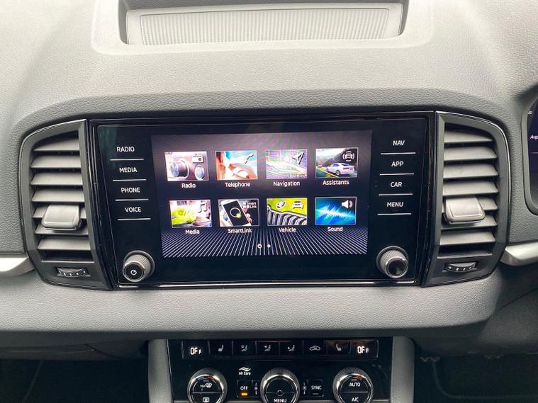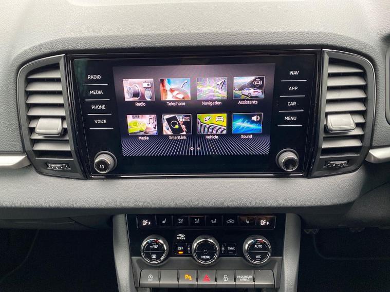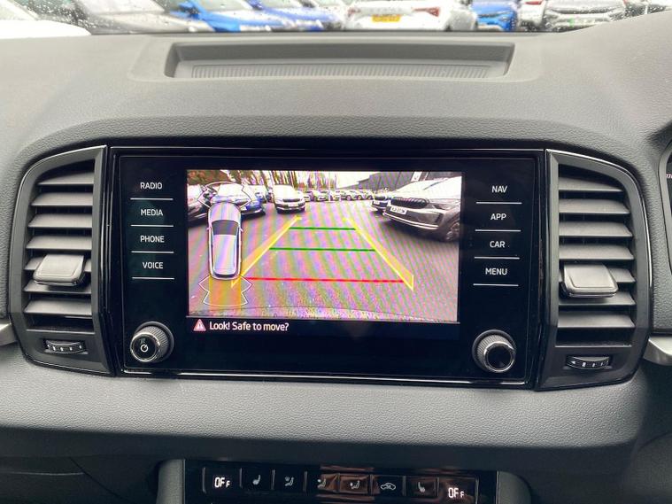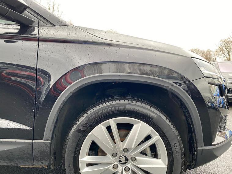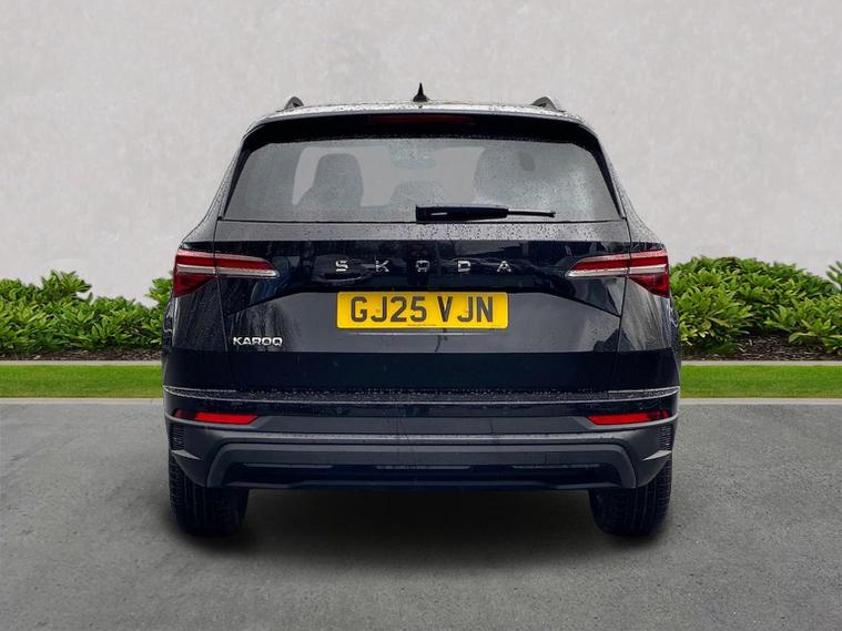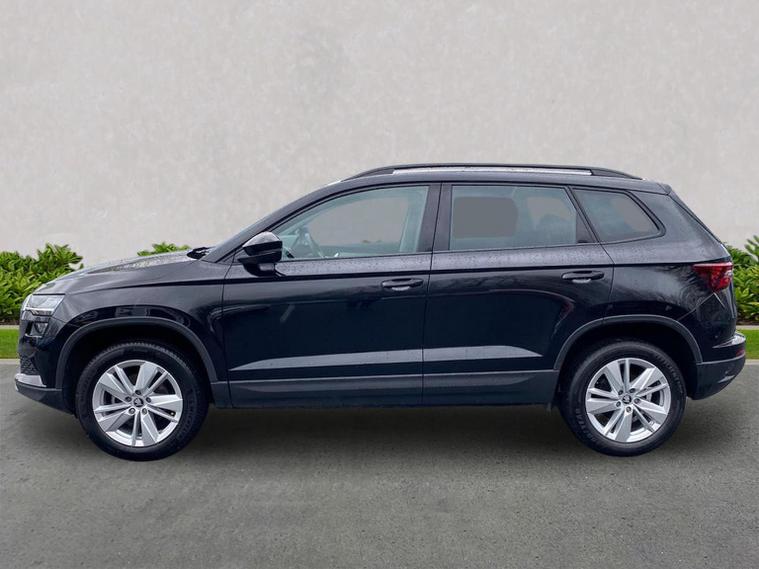 This Škoda Karoq SE Edition 1.0 TSI 116PS manual in Black Magic Pearl Effect with Loft interior includes the AM Edition SE/SL package, adding an alarm with interior monitoring, backup horn, tilt sensor and SAFE function, front and rear parking sensors, rear view camera, heated front seats, headlight washers, keyless entry and start/stop and a two-spoke heated multifunction leather steering wheel. Standard SE Edition equipment includes the 9.2" Škoda navigation system, wireless SmartLink, DAB radio, Bluetooth, Care Connect services, 8 speakers, web radio, virtual cockpit with 10.25" display, cruise control with speed limiter, Driver Alert, Traffic Sign Recognition, TPMS, rear parking sensors, LED headlights, LED rear lights, fog lights, black roof rails, electrically adjustable and heated door mirrors, front and rear electric windows, heated rear screen and a tyre repair kit. Inside it offers dual-zone climate control, height-adjustable front seats with lumbar support, front centre armrest, illuminated glovebox, textile floor mats, overhead glasses holder, rear seat pockets, cargo elements, net package with top tether hooks and a ticket holder on the windscreen. Safety equipment includes front, side and curtain airbags, passenger airbag deactivation, Front Assist, Lane Assist, Hill Hold Control, ISOFIX on the front passenger seat and rear seats, disc brakes and seatbelt reminders. We offer in-person appointments, personal video appointments, test drives and finance options.