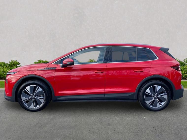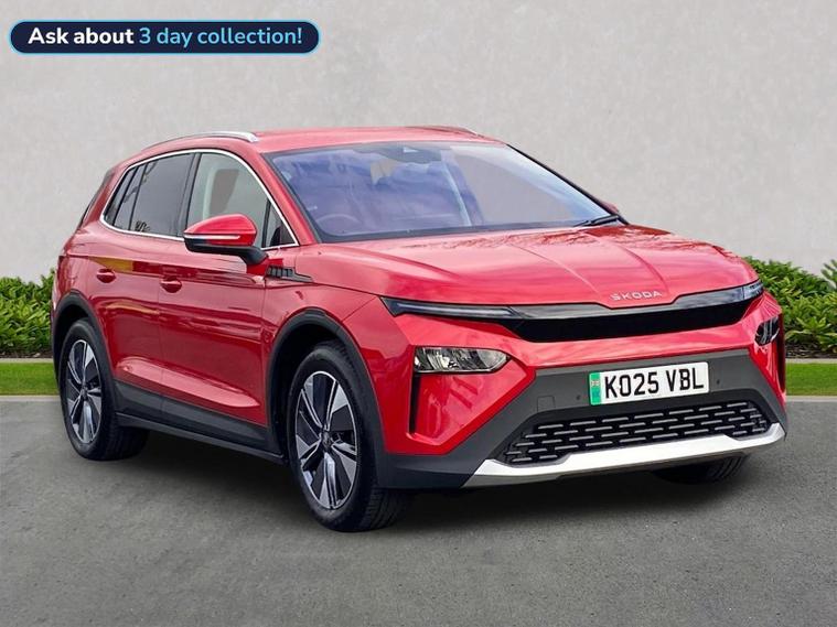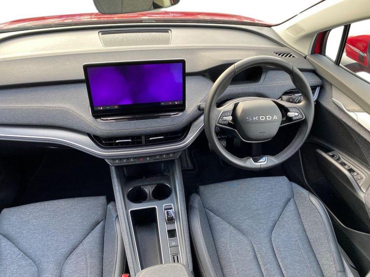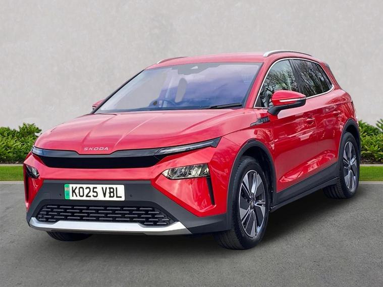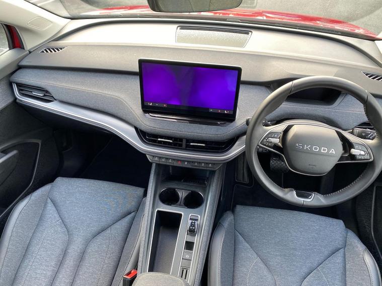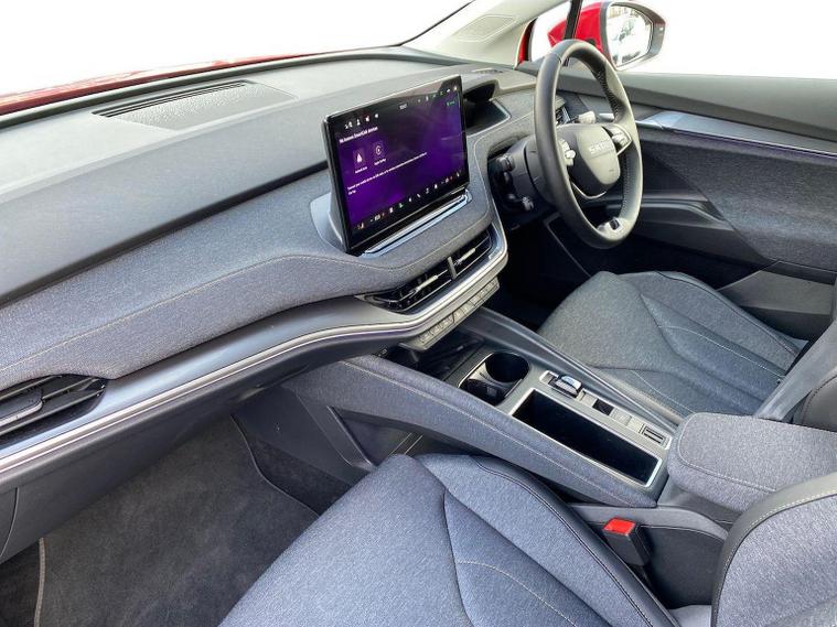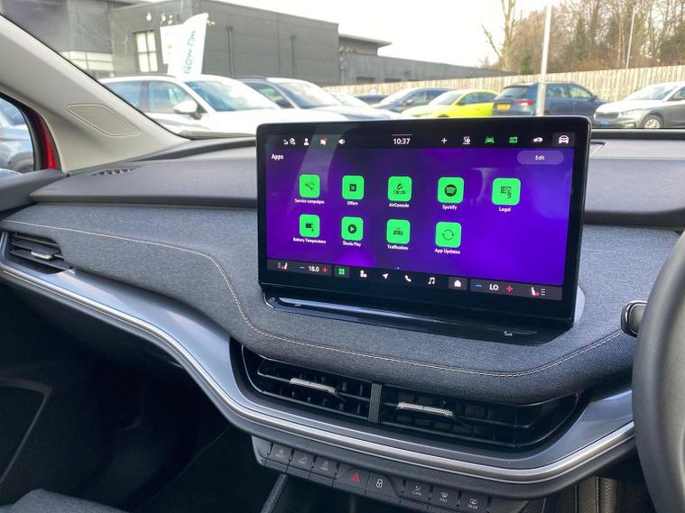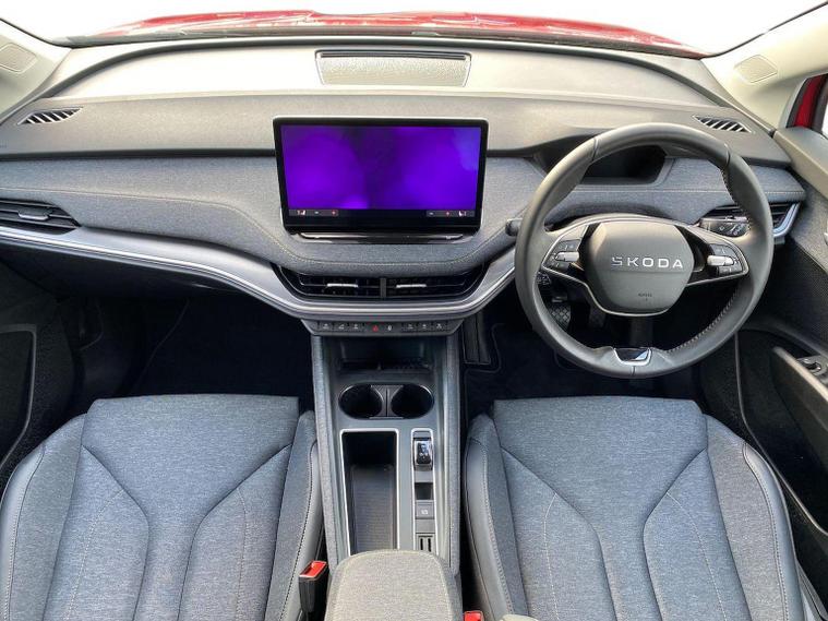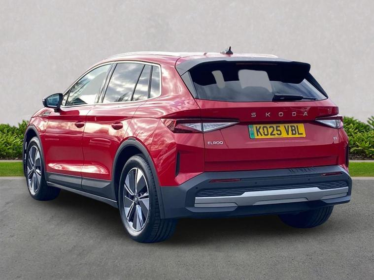 This Škoda Elroq Edition 85 in Velvet Red Metallic with the Loft interior includes the Winter Package, adding tri-zone climate control, heated front and rear seats and a heated windscreen. Standard equipment includes a 13" touchscreen with satellite navigation, DAB radio, Bluetooth, wireless Smartlink, wireless charging with cooling, USB-C ports front and rear, Wi-Fi hotspot, e-Call and Skoda Connect services. It also features Blind Spot Detection, Predictive Adaptive Cruise Control with Traffic Jam Assist, Drive Mode Select, front and rear parking sensors, a rear view camera, Traffic Sign Recognition, Driver Alert, Voice Control and tyre pressure monitoring. Exterior equipment includes 19" Regulus anthracite alloy wheels, heated, folding and auto-dimming mirrors with boarding spots and welcome logo, privacy glass with acoustic side windows, heat-insulating glass, tow bar preparation, dark chrome roof rails and window trim, rear spoiler, manually operated tailgate and a tyre repair kit. Inside, the car has a two-spoke heated multifunction steering wheel with recuperation paddles, digital cockpit, LED ambient lighting, gesture control, dual-zone climate control when Winter Pack isn’t active, extended interior noise suppression, boot lighting, folding boot cover, manual height adjustment and lumbar support for the front seats, three rear headrests and an umbrella. Safety features include front, side, curtain and central interaction airbags, Crew Protect Assist, Front Assist with pedestrian and cyclist detection, Emergency Steering Support, ISOFIX on the front passenger seat and outer rear seats with top tether, Anti-Theft alarm with interior monitoring and walk-away locking, Lane Assist, Speed Assist and Travel Assist Plus. Charging equipment includes the Mode 3 32A cable and up to 175kW DC rapid-charging capability. We offer in-person appointments, personal video appointments, test drives and finance options.