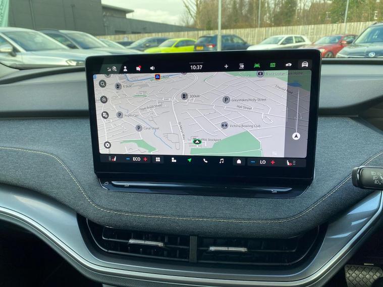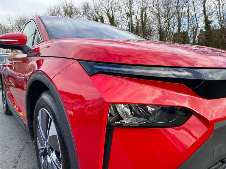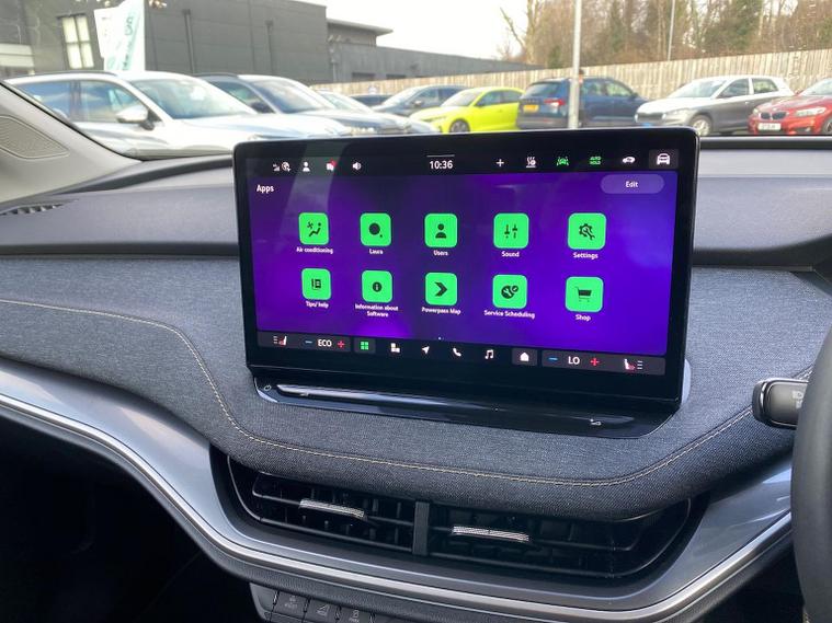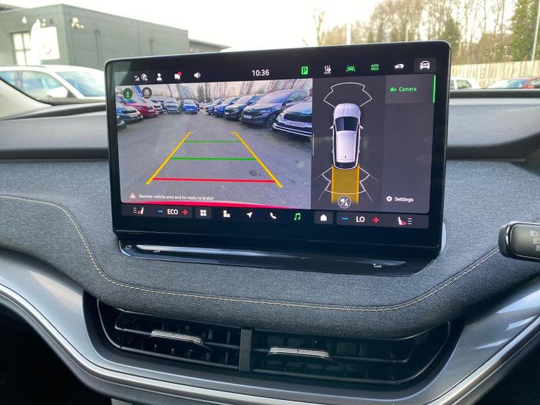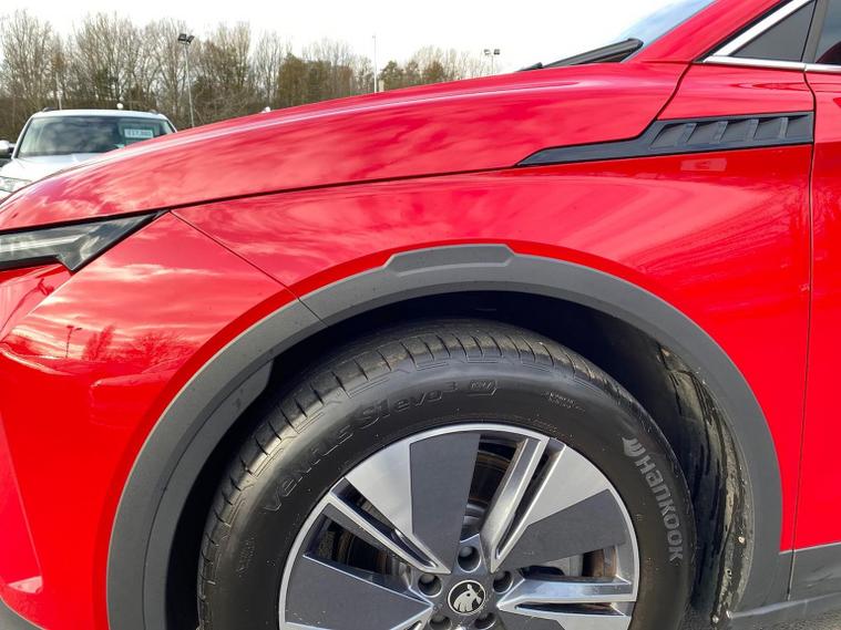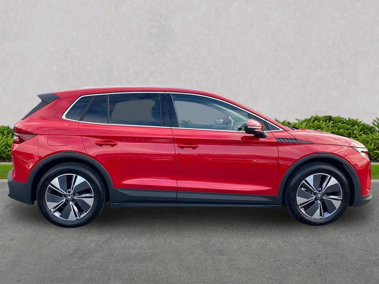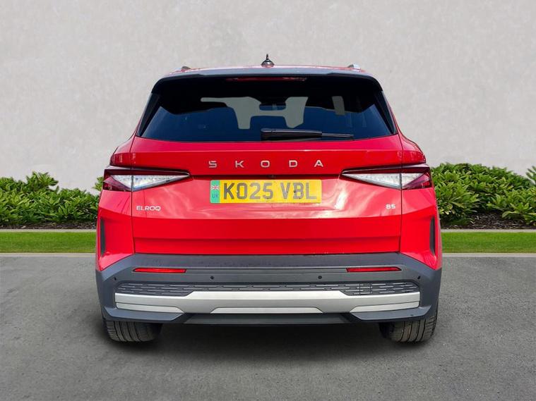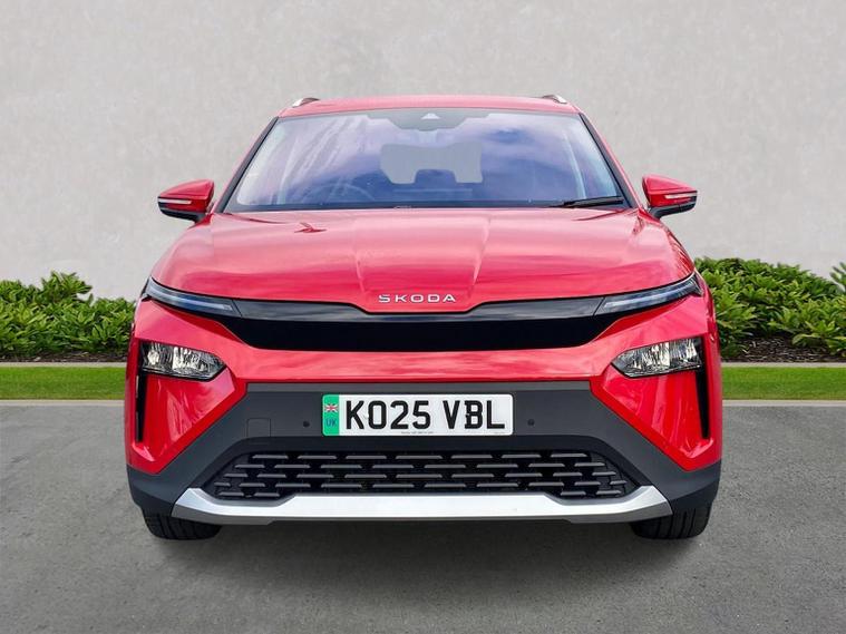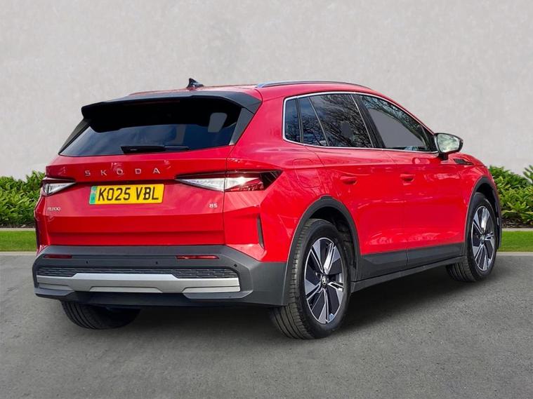 This Škoda Elroq Edition 85 in Velvet Red Metallic with the Loft interior includes the Winter Package, adding tri-zone climate control, heated front and rear seats and a heated windscreen. Standard equipment includes a 13" touchscreen with satellite navigation, DAB radio, Bluetooth, wireless Smartlink, wireless charging with cooling, USB-C ports front and rear, Wi-Fi hotspot, e-Call and Skoda Connect services. It also features Blind Spot Detection, Predictive Adaptive Cruise Control with Traffic Jam Assist, Drive Mode Select, front and rear parking sensors, a rear view camera, Traffic Sign Recognition, Driver Alert, Voice Control and tyre pressure monitoring. Exterior equipment includes 19" Regulus anthracite alloy wheels, heated, folding and auto-dimming mirrors with boarding spots and welcome logo, privacy glass with acoustic side windows, heat-insulating glass, tow bar preparation, dark chrome roof rails and window trim, rear spoiler, manually operated tailgate and a tyre repair kit. Inside, the car has a two-spoke heated multifunction steering wheel with recuperation paddles, digital cockpit, LED ambient lighting, gesture control, dual-zone climate control when Winter Pack isn’t active, extended interior noise suppression, boot lighting, folding boot cover, manual height adjustment and lumbar support for the front seats, three rear headrests and an umbrella. Safety features include front, side, curtain and central interaction airbags, Crew Protect Assist, Front Assist with pedestrian and cyclist detection, Emergency Steering Support, ISOFIX on the front passenger seat and outer rear seats with top tether, Anti-Theft alarm with interior monitoring and walk-away locking, Lane Assist, Speed Assist and Travel Assist Plus. Charging equipment includes the Mode 3 32A cable and up to 175kW DC rapid-charging capability. We offer in-person appointments, personal video appointments, test drives and finance options.