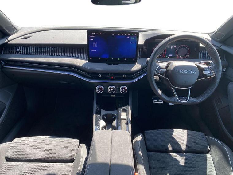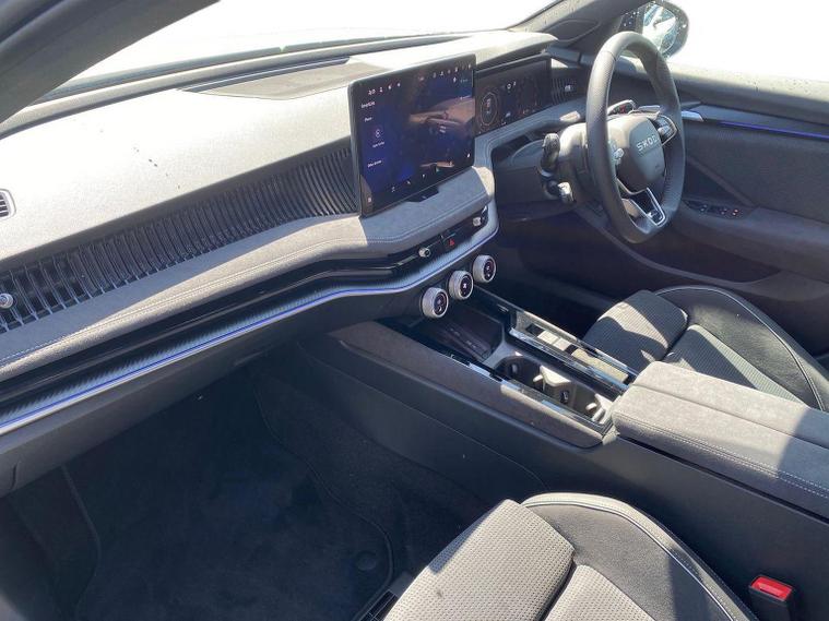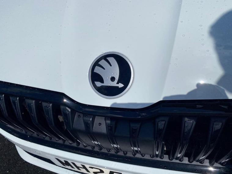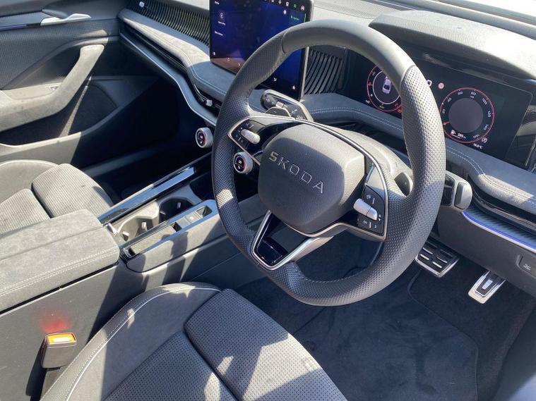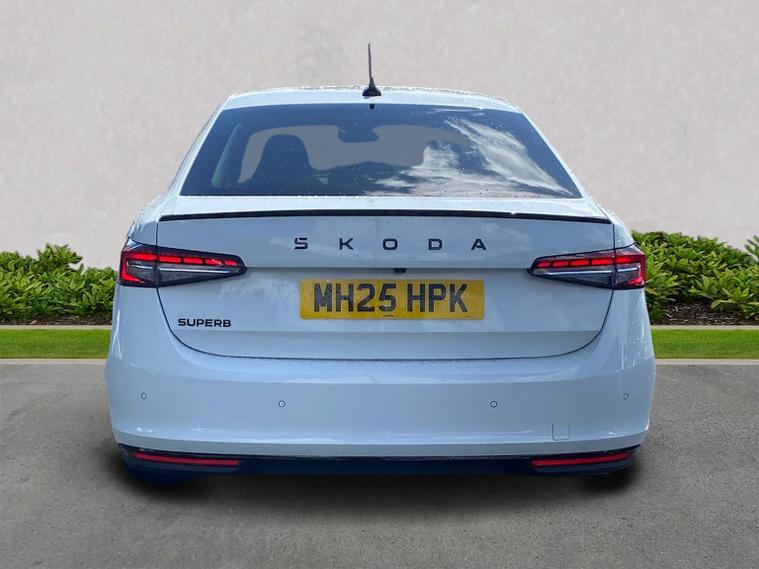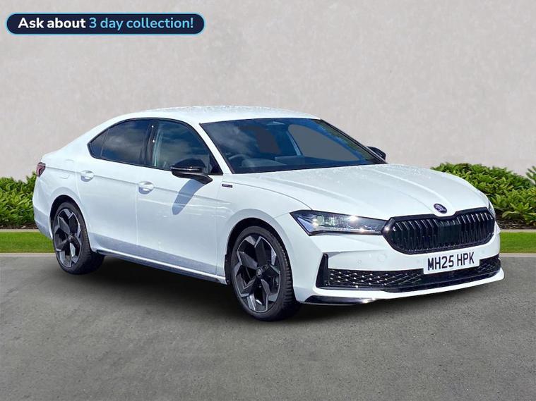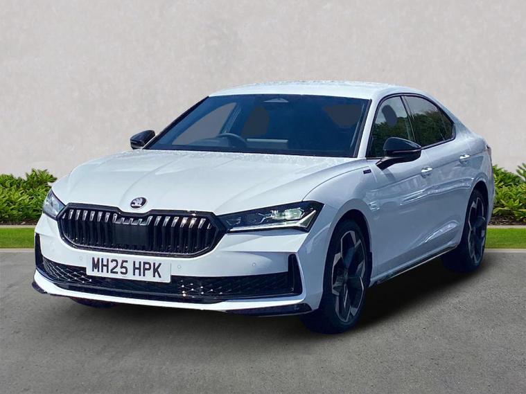 This Škoda Superb SportLine 1.5 TSI e-TEC 150PS DSG in Pure White with the Sports microsuede interior includes 19" Torcular black-polished alloy wheels, black exterior styling, privacy glass, acoustic side windows, heat-insulating windscreen, gloss black mirrors with heating, folding, auto-dimming and memory functions plus logo projection, towbar preparation and tyre repair kit. It features LED Matrix headlights with dynamic range control, cornering and poor-weather light, integrated fog lamps, animated LED rear indicators and Light Assist. Inside, it offers 14-way electrically adjustable front seats with memory, pneumatic lumbar support, extendable thigh support, Smart Comfort entry aid and massage functions, along with heated and ventilated front seats, multi-colour ambient lighting, tri-zone climate control, virtual cockpit, illuminated footwells, storage package with cargo elements, electrically operated boot with virtual pedal and Easy Close, aluminium pedals, fabric headlining, front armrest with storage, illuminated glovebox, front and rear floor mats, sports steering wheel with tiptronic. Technology includes a 13" touchscreen satellite navigation system, wireless SmartLink, wireless charging, four USB-C ports, DAB and FM radio, Bluetooth, CareConnect with emergency call, Remote Access and Infotainment Online, web radio and towbar prep. Driver assistance features include Adaptive Cruise Control with Speed Assist, Lane Assist Plus, Traffic Jam Assist, Blind Spot Detection with exit warning, Driver Alert, front and rear parking sensors, rear view camera with washer, Traffic Sign Recognition and TPMS. Safety equipment includes eight airbags including centre and knee airbags, Crew Protect Assist, Front Assist with extended predictive pedestrian protection, Cross Traffic Assist, Turn Assist with evasive support, ISOFIX on front passenger and outer rear seats, electronic parking brake, alarm with interior monitoring and three keys. We offer in-person appointments, personal video appointments, test drives and finance options.