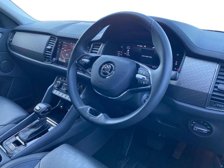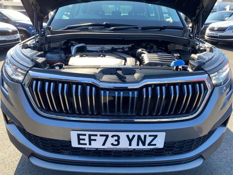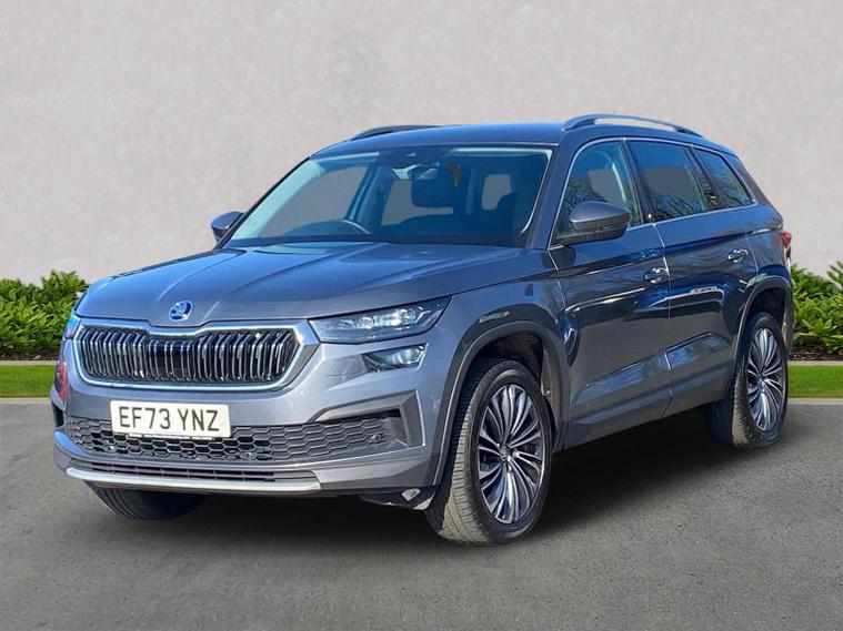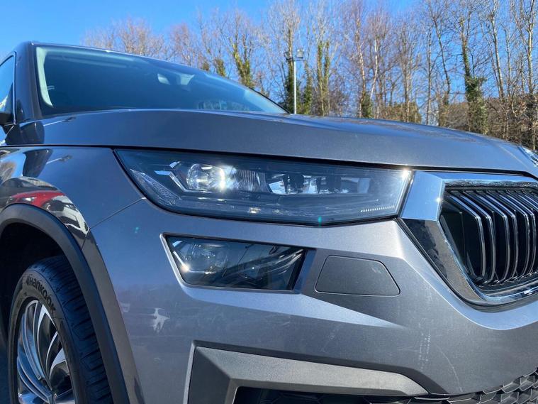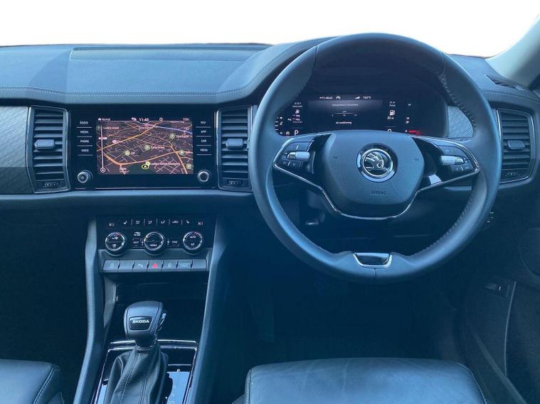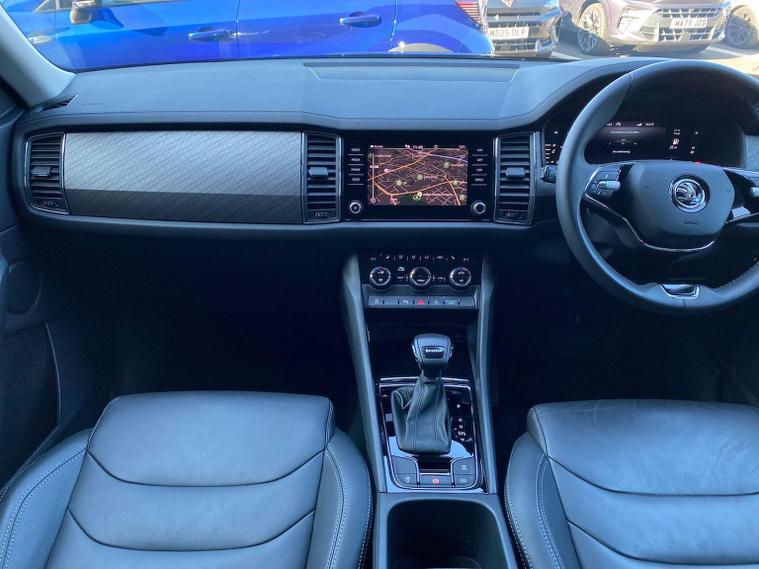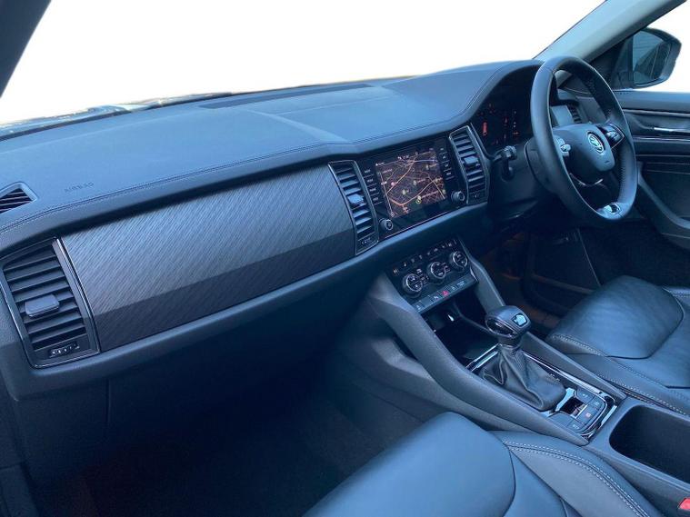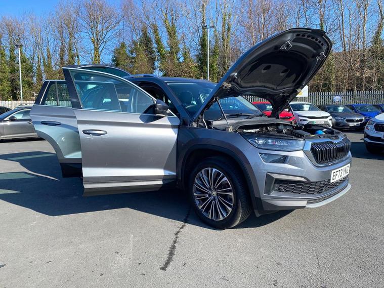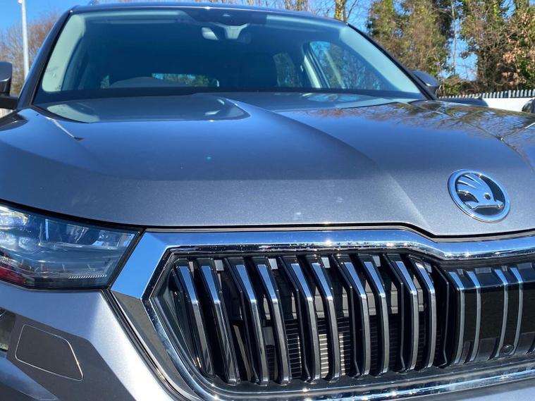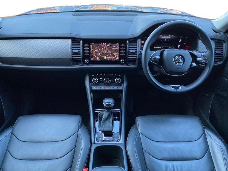 This Škoda Kodiaq SE L Executive 1.5 TSI 150PS DSG (7 seats) in Graphite Grey Metallic with black leather upholstery includes the SE L Executive package, adding 19" Cursa anthracite alloy wheels, Light Assistant, auto-dimming rear view mirror, electrically adjustable heated folding mirrors with auto-dimming and memory plus boarding spots, aero wipers with light and rain sensor, rear view camera, power-adjustable driver’s seat with memory, driver’s lumbar support and a drawer under the front passenger seat. It is also fitted with the optional 2-spoke leather multifunction steering wheel. Standard equipment includes DAB radio, Bluetooth, Amundsen navigation, SmartLink, Care Connect services, front and rear parking sensors, cruise control, dual-zone climate control, front and rear electric windows, privacy glass, chrome exterior styling, heated rear window, roof rails, LED headlights, LED rear lights, textile floor mats, height-adjustable front seats, folding and sliding second row, third-row seating, illuminated glovebox, centre armrest, umbrella, rear air vents, boot nets and storage features. Safety features include front, side and curtain airbags, passenger airbag deactivation, Front Assist, Lane Assist, Hill Hold Control, alarm with interior monitoring and SAFE function, ISOFIX mounts on outer rear seats, ABS, ESC, tyre pressure monitoring and remote central locking with two keys. We offer in-person appointments, personal video appointments, test drives and finance options.