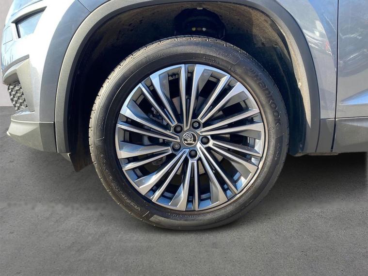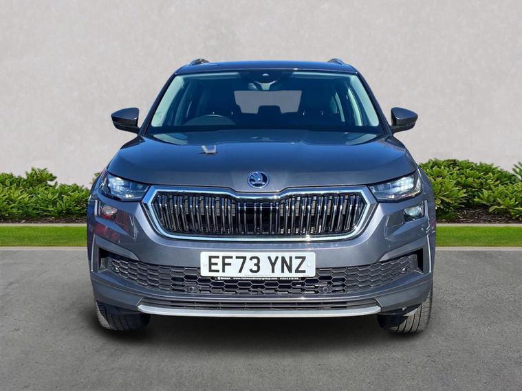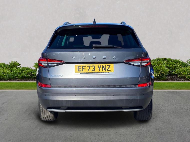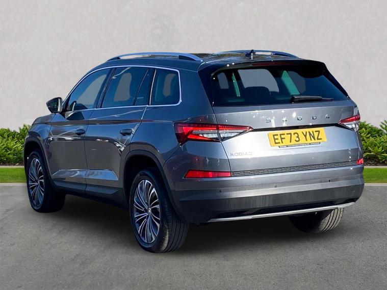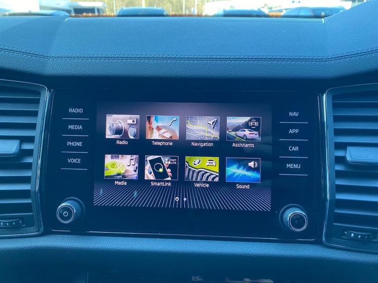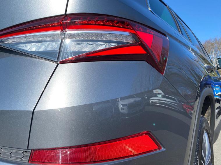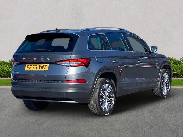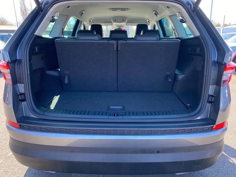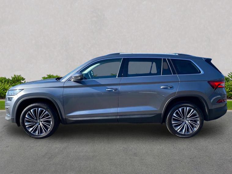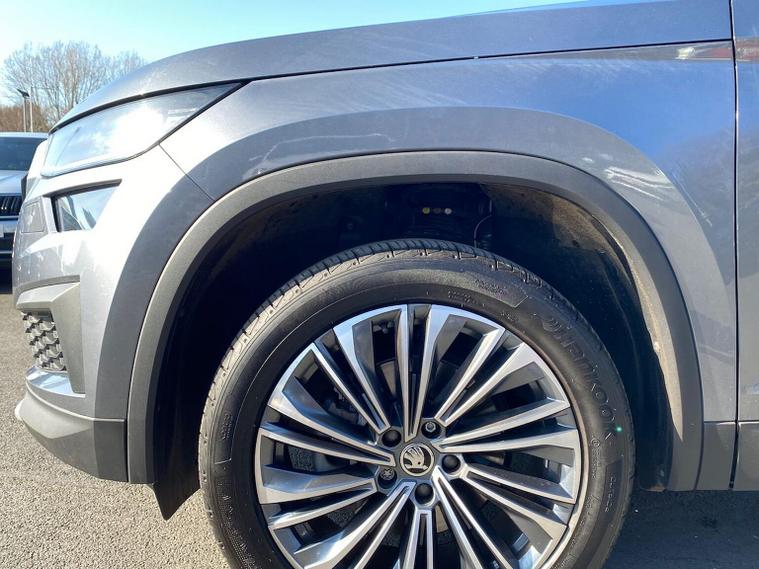This Škoda Kodiaq SE L Executive 1.5 TSI 150PS DSG (7 seats) in Graphite Grey Metallic with black leather upholstery includes the SE L Executive package, adding 19" Cursa anthracite alloy wheels, Light Assistant, auto-dimming rear view mirror, electrically adjustable heated folding mirrors with auto-dimming and memory plus boarding spots, aero wipers with light and rain sensor, rear view camera, power-adjustable driver’s seat with memory, driver’s lumbar support and a drawer under the front passenger seat. It is also fitted with the optional 2-spoke leather multifunction steering wheel. Standard equipment includes DAB radio, Bluetooth, Amundsen navigation, SmartLink, Care Connect services, front and rear parking sensors, cruise control, dual-zone climate control, front and rear electric windows, privacy glass, chrome exterior styling, heated rear window, roof rails, LED headlights, LED rear lights, textile floor mats, height-adjustable front seats, folding and sliding second row, third-row seating, illuminated glovebox, centre armrest, umbrella, rear air vents, boot nets and storage features. Safety features include front, side and curtain airbags, passenger airbag deactivation, Front Assist, Lane Assist, Hill Hold Control, alarm with interior monitoring and SAFE function, ISOFIX mounts on outer rear seats, ABS, ESC, tyre pressure monitoring and remote central locking with two keys. We offer in-person appointments, personal video appointments, test drives and finance options.