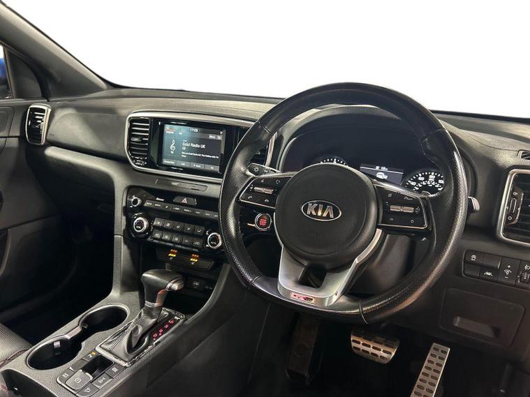 Here at Lookers Liverpoolwe have this lovely example of the Kia Sportage GT-Line finished in Ultra Blue which is the All Wheel Drive model capable of delivering superb traction control in adverse weather conditions. Contrasting with the brushed metal trim finish to compliment the sporty looking exterior premium finish. The GT-Line has a fantastic specification, Built in navigation system, front and rear parking sensors incorporating a reversing camera and parking control distance sensors displayed on the infotainment screen. The GT-Line has front and rear heated outer seats with superb black & ivory two tone leather. With a fantastic combined Miles per Gallon figure of over 45MPG it truly is a superb SUV, this is achievable via the intelligent Mild Hybrid system. If you should wish to ask any further questions regarding specification or anything else, please contact our dedicated sales team on 01512976256