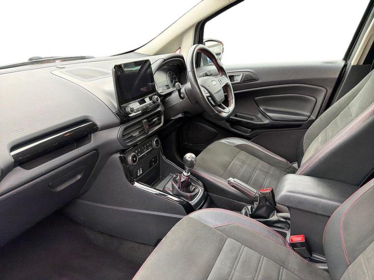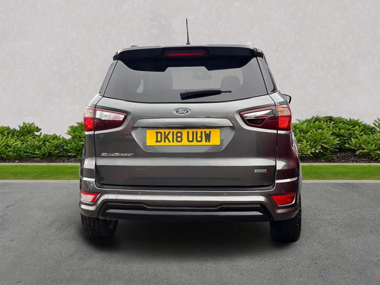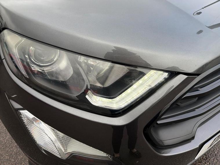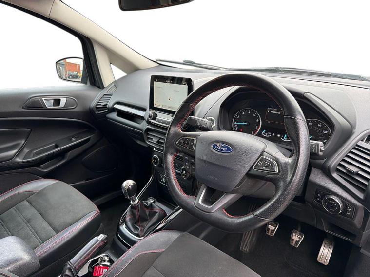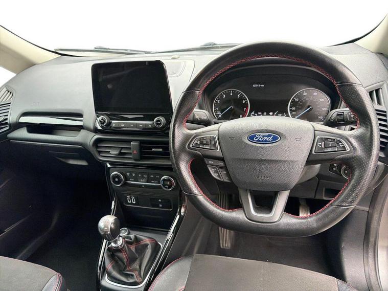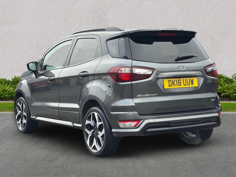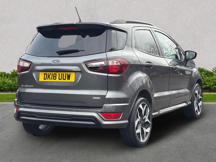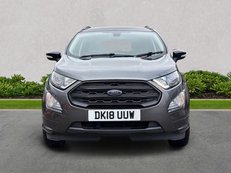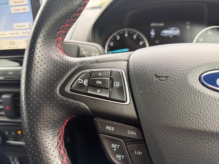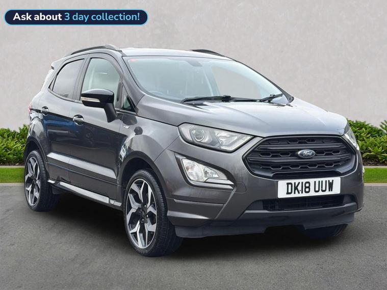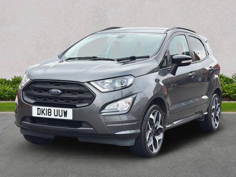 The 2018 Ford EcoSport 1.0T EcoBoost ST-Line is a compact 5-door SUV featuring a sporty, Fiesta-inspired redesign. It combines the efficient 999cc, 3-cylinder turbocharged petrol engine (available in 123bhp or 138bhp) with a 6-speed manual transmission. As a 2018 model, it benefits from a significantly updated interior with improved materials and a better-weighted, sporty driving experience compared to earlier versions. Engine and Performance Engine: 1.0-litre EcoBoost turbocharged 3-cylinder petrol. Power: 123 bhp (125 PS) or 138 bhp (140 PS) variants. Performance (123 bhp): 0-62 mph in approximately 11.0 seconds, with a top speed of 111 mph. Driving Dynamics: The ST-Line features specially tuned sports suspension, making it feel more engaged, though the ride can be firm over bumps. Fuel Economy: Real-world combined, it often achieves around 45 mpg. Key Features and Technology (ST-Line Trim) Exterior: Unique ST-Line bumpers and side skirts, 17-inch "Dark Tarnish" alloy wheels, large rear spoiler, contrast painted roof, and LED daytime running lights. Interior: Part-leather "Sensico" seats with red stitching, leather-trimmed flat-bottom steering wheel, and stainless steel sports pedals. Infotainment: 8-inch touchscreen with SYNC 3, Apple CarPlay, Android Auto, and Satellite Navigation. Comfort/Convenience: Climate control, heated windscreen (Quickclear), rear-view camera with parking sensors, and power-folding mirrors.