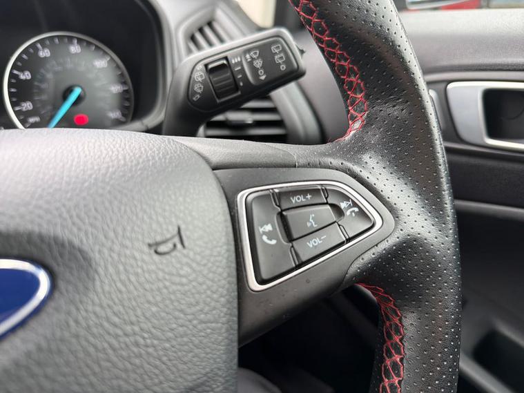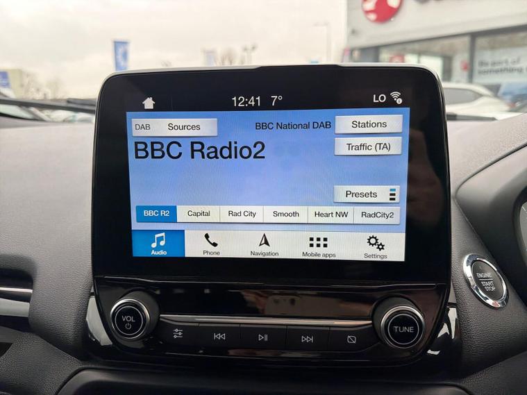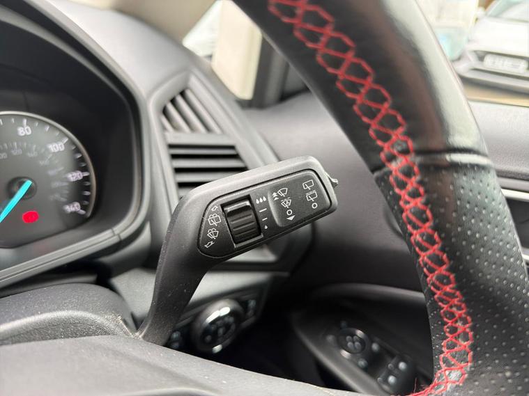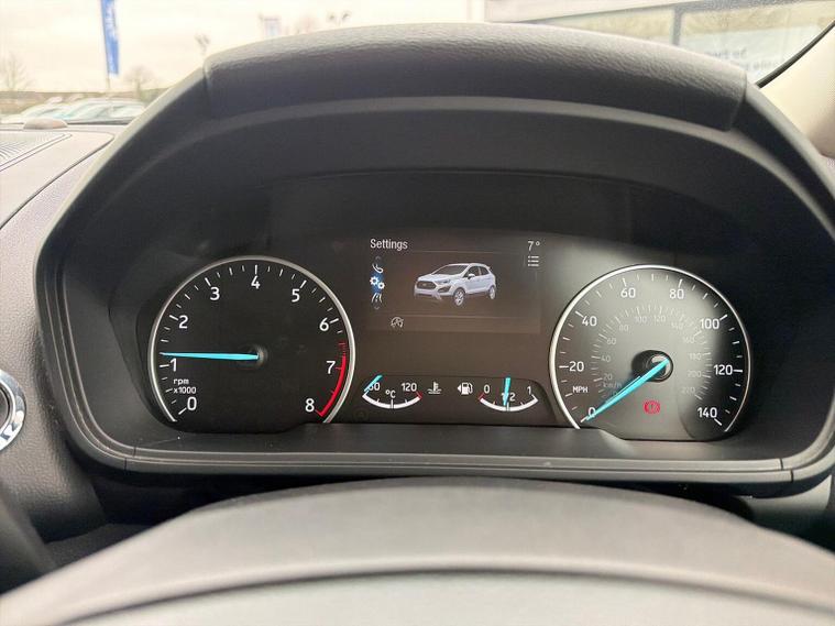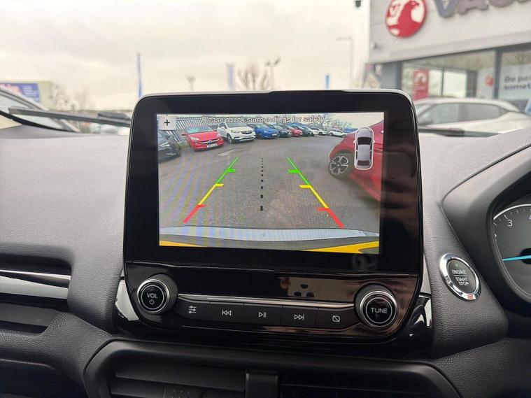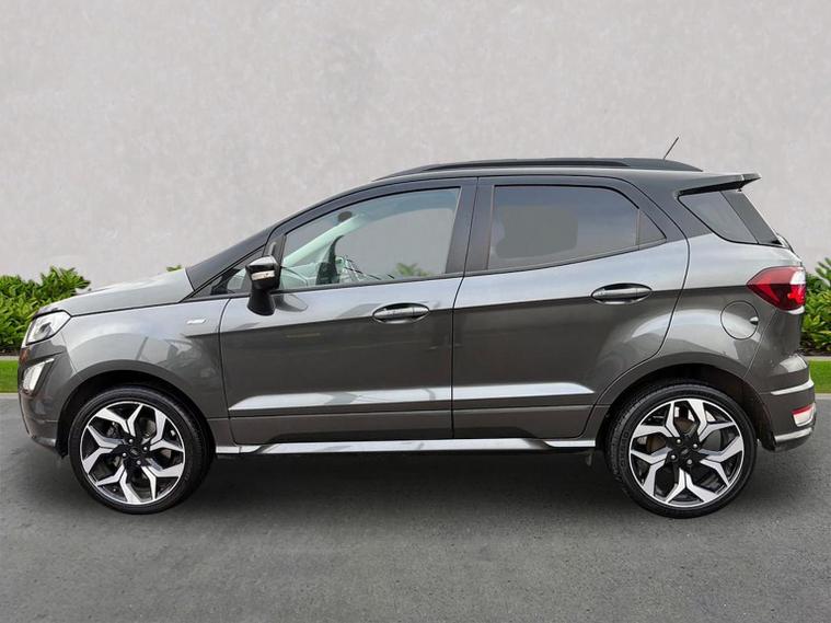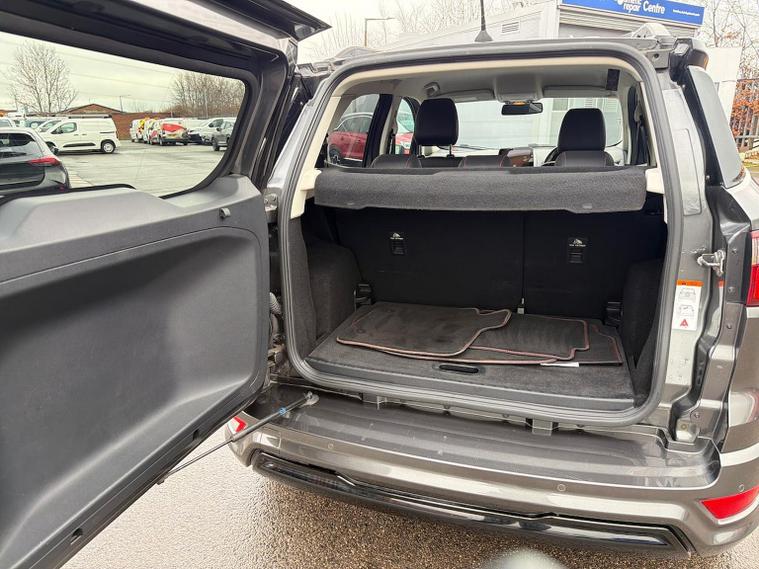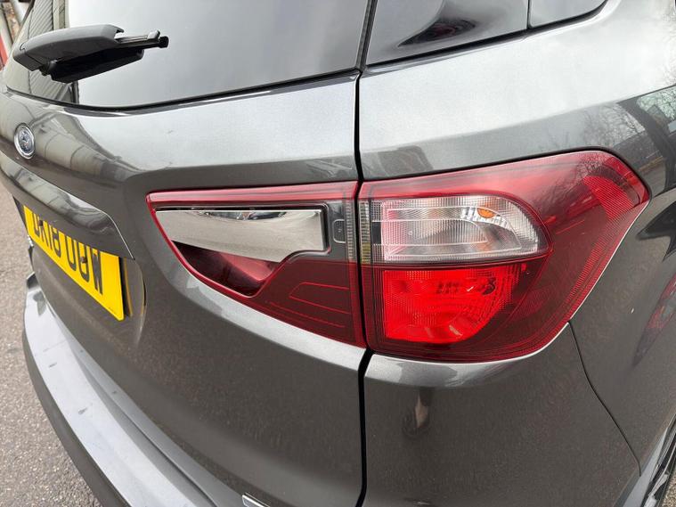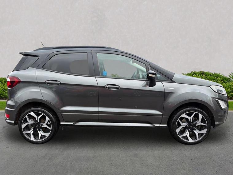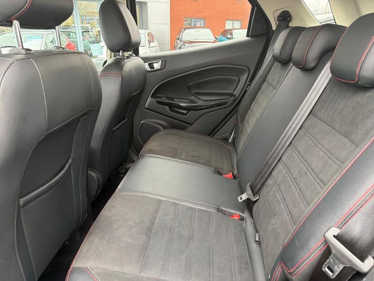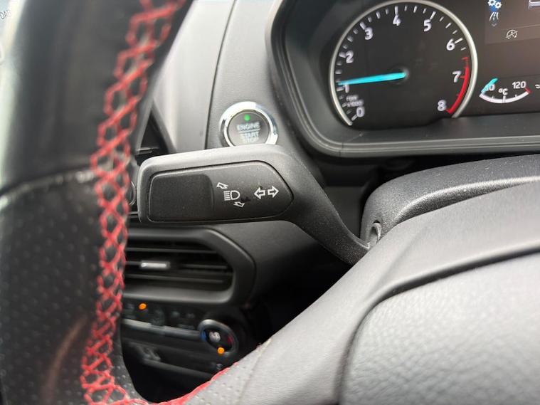 The 2018 Ford EcoSport 1.0T EcoBoost ST-Line is a compact 5-door SUV featuring a sporty, Fiesta-inspired redesign. It combines the efficient 999cc, 3-cylinder turbocharged petrol engine (available in 123bhp or 138bhp) with a 6-speed manual transmission. As a 2018 model, it benefits from a significantly updated interior with improved materials and a better-weighted, sporty driving experience compared to earlier versions. Engine and Performance Engine: 1.0-litre EcoBoost turbocharged 3-cylinder petrol. Power: 123 bhp (125 PS) or 138 bhp (140 PS) variants. Performance (123 bhp): 0-62 mph in approximately 11.0 seconds, with a top speed of 111 mph. Driving Dynamics: The ST-Line features specially tuned sports suspension, making it feel more engaged, though the ride can be firm over bumps. Fuel Economy: Real-world combined, it often achieves around 45 mpg. Key Features and Technology (ST-Line Trim) Exterior: Unique ST-Line bumpers and side skirts, 17-inch "Dark Tarnish" alloy wheels, large rear spoiler, contrast painted roof, and LED daytime running lights. Interior: Part-leather "Sensico" seats with red stitching, leather-trimmed flat-bottom steering wheel, and stainless steel sports pedals. Infotainment: 8-inch touchscreen with SYNC 3, Apple CarPlay, Android Auto, and Satellite Navigation. Comfort/Convenience: Climate control, heated windscreen (Quickclear), rear-view camera with parking sensors, and power-folding mirrors.