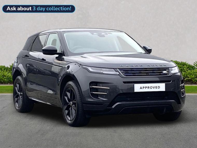 Introducing this beautifully specified Range Rover Evoque 2.0 D200 Dynamic SE, a low-mileage example showing just 5, 465 miles and presented in a striking, contemporary configuration. Finished with a bold Black Contrast Roof and enhanced by the sleek 19" Gloss Black Style 5136 alloy wheels, it delivers a confident, modern presence that perfectly complements the Evoque’s distinctive silhouette. Powered by the refined 2.0-litre D200 diesel engine, this Evoque offers 204 PS of smooth, responsive performance, paired with an intelligent all-wheel-drive system and a seamless automatic transmission. The result is composed, assured progress in all conditions, whether navigating tight city streets or covering long motorway journeys with ease. The exterior specification is elevated further by privacy glass, adding both sophistication and comfort, while the fixed panoramic roof floods the cabin with natural light, enhancing the sense of space and refinement. A discreet dash camera has also been fitted, offering additional reassurance on every journey. Inside, the Dynamic SE cabin blends premium materials with a clean, modern design. Supportive seating, high-quality finishes and thoughtful detailing create an inviting environment, complemented by features such as Pivi Pro infotainment, crisp digital displays, dual-zone climate control and a suite of advanced driver-assistance technologies. The elevated driving position and excellent visibility contribute to a relaxed, confident feel behind the wheel, while the Evoque’s compact footprint ensures effortless manoeuvrability. Everyday usability is enhanced by keyless entry, a powered tailgate, front and rear parking sensors, a rear-view camera and intelligent safety systems designed to support you in a wide range of driving situations. The Evoque’s versatile interior layout and practical load space make it perfectly suited to both daily life and weekend adventures, all delivered with the unmistakable refinement of the Range Rover brand. As a Land Rover Approved vehicle, this example has undergone a comprehensive 165-point inspection along with full mileage and history verification, ensuring complete confidence in its condition and provenance. We offer tailored part-exchange valuations, competitive finance options and flexible purchasing solutions including Click & Collect and Home Delivery, supported by our dedicated aftersales team throughout your ownership.