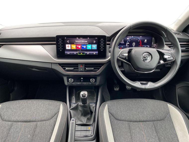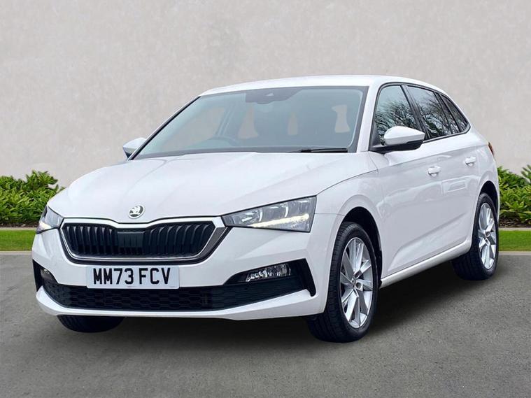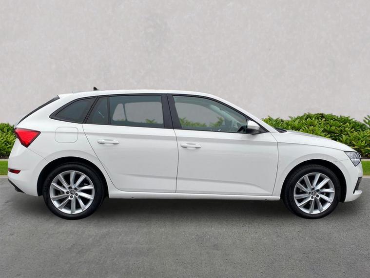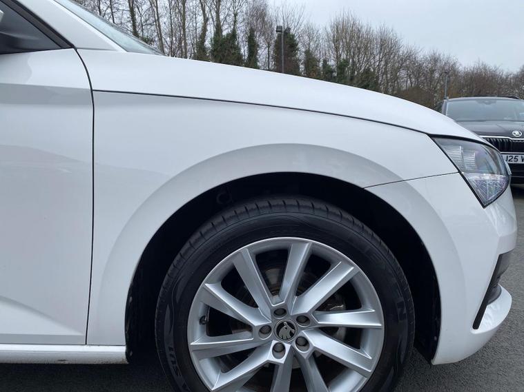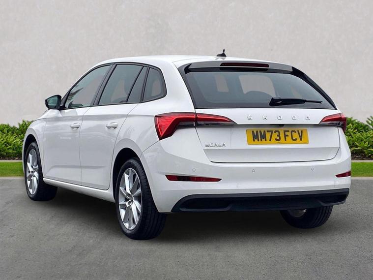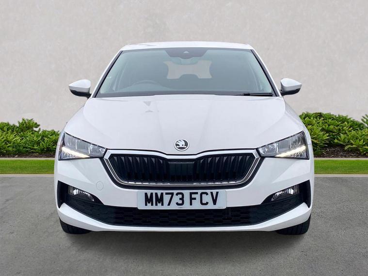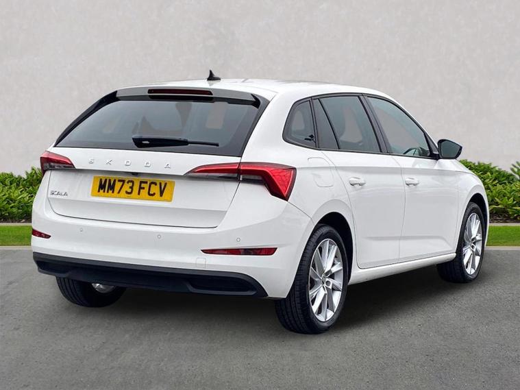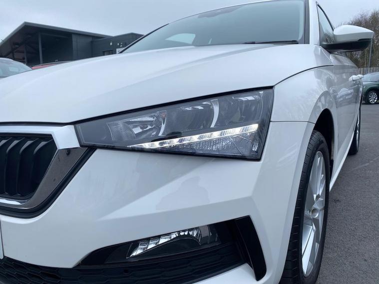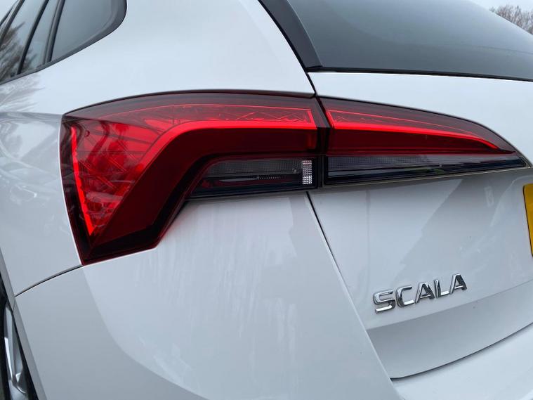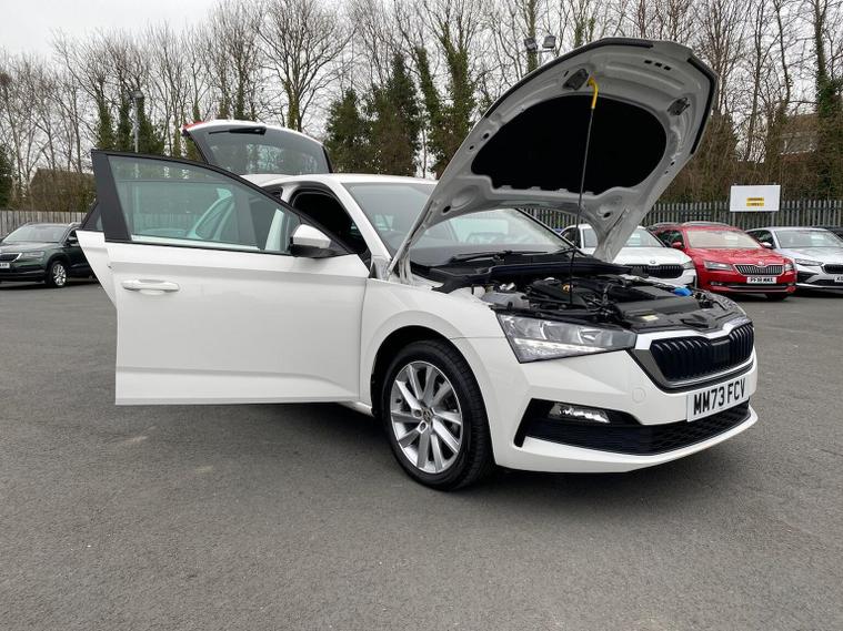 Skoda Scala SE L 1.0 TSI 110 PS manual in Candy White with black and grey interior includes Amundsen satellite navigation with 9.2 inch touchscreen virtual cockpit Bolero 8 inch display DAB radio Bluetooth SmartLink wireless SmartLink Care Connect Infotainment Online two USB C ports emergency call and proactive services and eight speakers. Standard specification includes cruise control rear parking sensors rear view camera 17 inch Stratos alloy wheels electrically adjustable heated and folding door mirrors body coloured trim chrome grille privacy glass tinted windows temporary steel space saver spare wheel automatic headlight control LED headlights LED daytime running lights LED rear lights and front fog lights with corner function. Inside it offers dual zone climate control ambient lighting white grained black decorative inserts chrome detailing height adjustable front seats manual lumbar support leather gear and handbrake trim two spoke leather multifunction steering wheel front centre armrest overhead glasses storage rear centre armrest virtual cockpit reading lights umbrella and textile floor mats. Safety features include ABS front side head and curtain airbags passenger airbag switch off function front assist lane assist hill hold control ISOFIX on rear seats alarm with SAFE locking remote central locking seatbelt reminders and keyless entry and start. We offer personal video appointments test drives and can arrange finance.