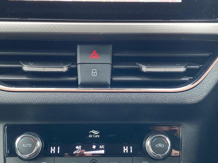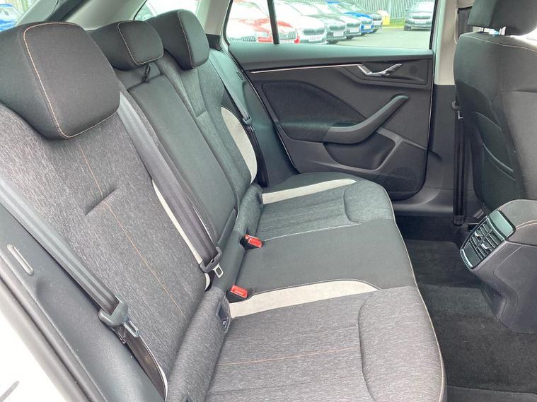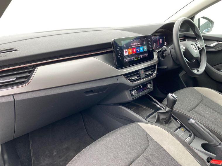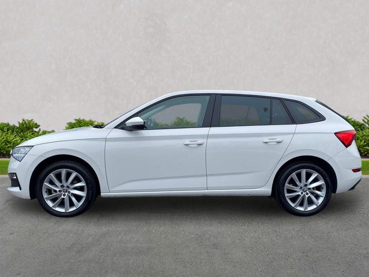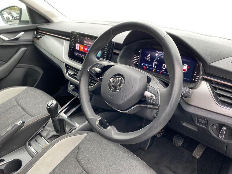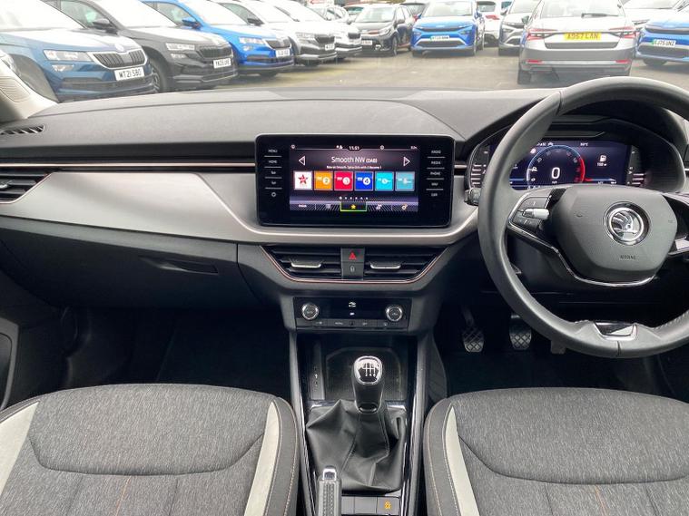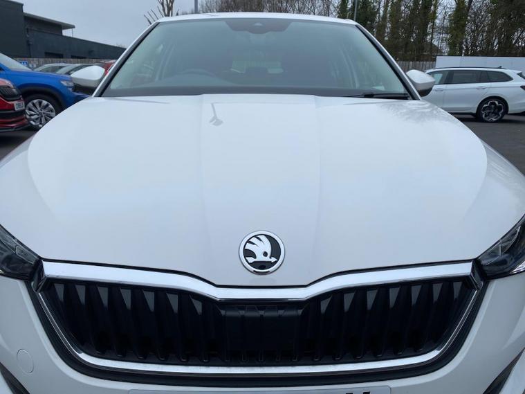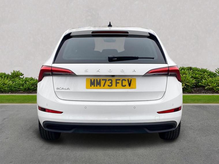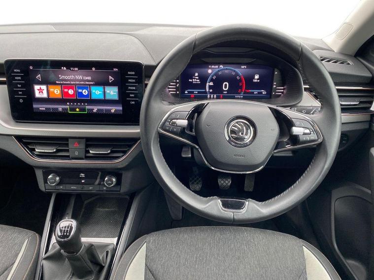 Skoda Scala SE L 1.0 TSI 110 PS manual in Candy White with black and grey interior includes Amundsen satellite navigation with 9.2 inch touchscreen virtual cockpit Bolero 8 inch display DAB radio Bluetooth SmartLink wireless SmartLink Care Connect Infotainment Online two USB C ports emergency call and proactive services and eight speakers. Standard specification includes cruise control rear parking sensors rear view camera 17 inch Stratos alloy wheels electrically adjustable heated and folding door mirrors body coloured trim chrome grille privacy glass tinted windows temporary steel space saver spare wheel automatic headlight control LED headlights LED daytime running lights LED rear lights and front fog lights with corner function. Inside it offers dual zone climate control ambient lighting white grained black decorative inserts chrome detailing height adjustable front seats manual lumbar support leather gear and handbrake trim two spoke leather multifunction steering wheel front centre armrest overhead glasses storage rear centre armrest virtual cockpit reading lights umbrella and textile floor mats. Safety features include ABS front side head and curtain airbags passenger airbag switch off function front assist lane assist hill hold control ISOFIX on rear seats alarm with SAFE locking remote central locking seatbelt reminders and keyless entry and start. We offer personal video appointments test drives and can arrange finance.