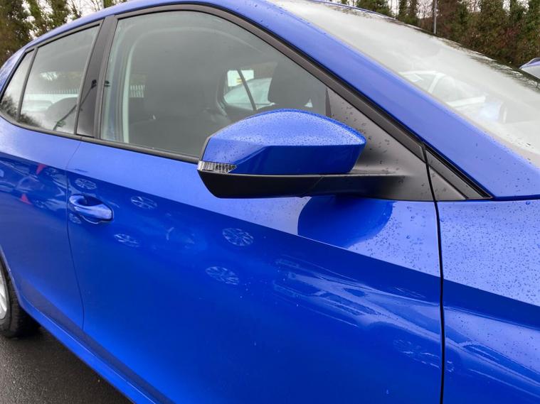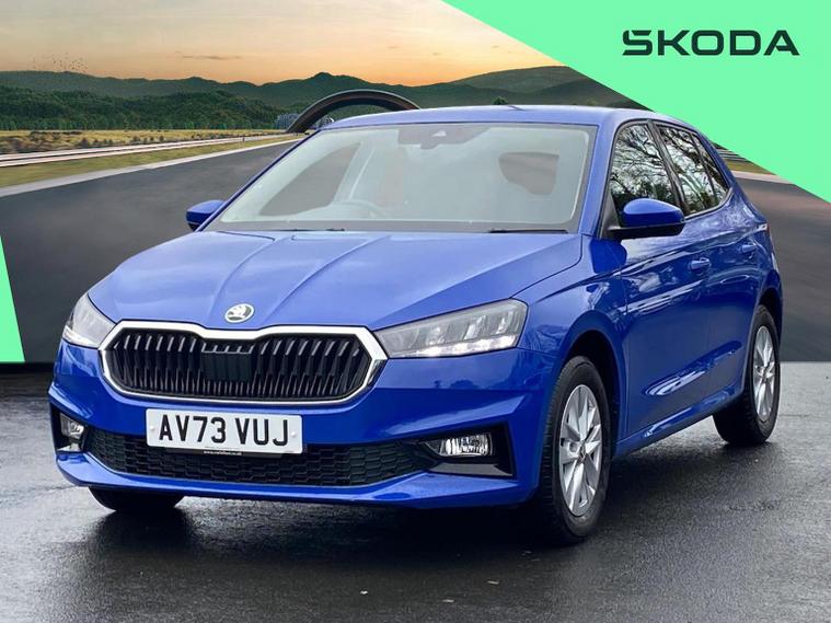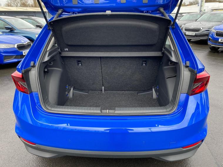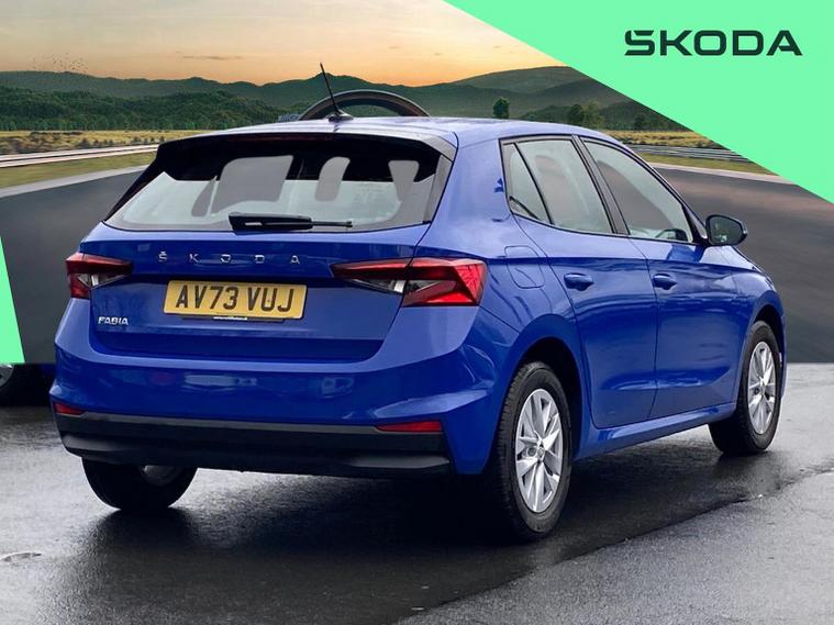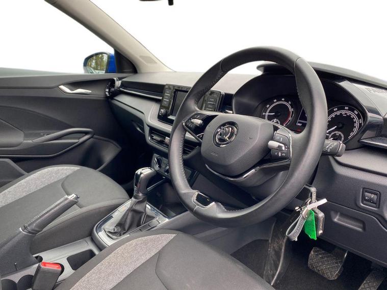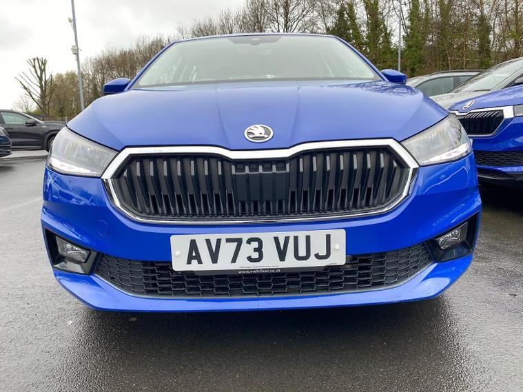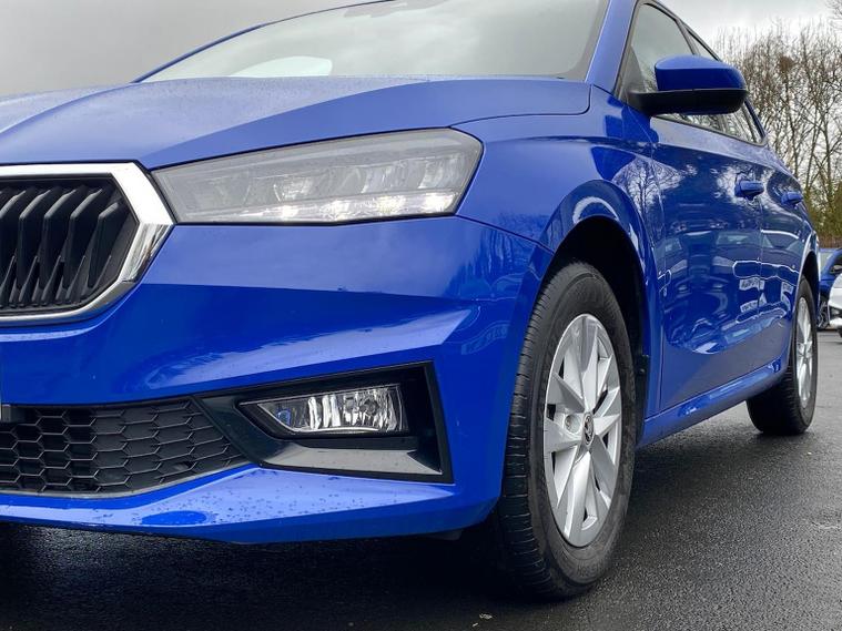 koda Fabia SE Comfort 1.0 TSI 110 PS DSG in Energy Blue with standard interior package includes cooling shutters. Standard equipment includes Swing radio with 6.5 inch touchscreen DAB radio Bluetooth SmartLink two USB C ports eCall driver alert multifunction trip computer tyre pressure monitoring 15 inch Rotare alloy wheels body coloured bumpers and mirrors electrically adjustable heated door mirrors front electric windows rear spoiler chrome Skoda lettering basic rear lights LED headlights with daytime running lights LED rear fog lights and automatic headlight range control. Inside it offers manual air conditioning height adjustable front seats height adjustable front headrests three rear headrests two spoke leather multifunction steering wheel black painted air vents glossy black trim satin black trim dimming rear view mirror leather gear knob and handbrake luggage compartment lighting central console storage fixed cupholder two front and two rear reading lights sun visor mirror and split folding rear backrest. Safety equipment includes front side and head airbags passenger airbag deactivation ESC ABS MSR ASR EDS HBA XDS hill hold control front assist lane assist pedestrian protection isofix and top tether on front passenger seat isofix with top tether on rear seats seatbelt reminders alarm with interior monitoring backup horn and towing protection remote central locking with two keys and rear wash wipe. We offer personal video appointments test drives and can arrange finance.