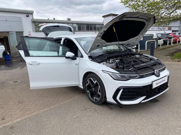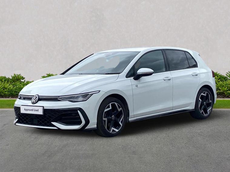 VOLKSWAGEN GOLF 1.5 eTSI MHEV R-Line DSG (150 PS) Registration: YE25TZW Mileage: 12, 390 miles Overview A great example of the ever-popular Golf R-Line, finished in Pure White with an Anthracite / Titanium Black interior. This model combines sporty styling with mild-hybrid efficiency, smooth DSG performance, and a fantastic level of tech — including the latest 12.9" infotainment system with built-in online connectivity and voice assistant. Colour & Interior Pure White solid paint Anthracite / Titanium Black interior Black carpets and roof lining Key Features & Equipment Driver Assistance Adaptive Cruise Control (ACC) with speed limiter Front Assist with Emergency Braking Pedestrian & cyclist monitoring Comfort & Convenience Light & Sight Pack: Auto-dimming rear-view mirror Rain sensor Infotainment & Connectivity Discover Navigation system 12.9" high-resolution infotainment display e-SIM for online connectivity IDA intelligent voice assistant with ChatGPT integration 6-speaker audio system 2026 Volkswagen Approved Used Benefits 12-month Volkswagen Approved Used Warranty (or remaining manufacturer warranty if greater) 12-month UK & European Roadside Assistance Comprehensive multi-point vehicle inspection Vehicle history & mileage verification MOT cover (where applicable) 5-day Volkswagen Drive-Away Insurance 30-day / 1, 000-mile exchange promise Flexible finance options via Volkswagen Financial Services