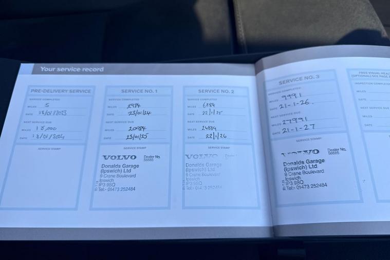 Sculpted gear shift Charcoal headlining Door mirror covers. Black Stone Cutting Edge aluminium decor Connect Suede textile/Microtech upholstery Tailored sport steering wheel. Charcoal 7-speed Dual Clutch transmission 2-Zone Electronic Climate Control Afterrun parking climate Passenger Airbag Cut Off Switch Dual Stage Driver and Passenger Airbags Driver Knee Airbag Panoramic roof Charcoal interior inserts Road Sign Information Driver Alert Control with Lane Keeping Aid Front grille with high-gloss black insert Heated grill emblem LED headlights Headlight Cleaning System Rear fog lights switched off when trailer fog lights are running Front LED Foglights 12-inch driver display Google Assistant. Google Maps and Google Play Store – included for 4 years Pilot Assist (up to 80mph) Adaptive Cruise Control with Distance Alert & Queue Assist Pilot Assist Adjustable Speed Limiter Volvo Cars App remote functions - included for 4 years Fresh Air Subwoofer DAB (Digital Audio Broadcasting) Radio Premium Sound by Harman Kardon Autofolding Heated Power Door Mirrors Wireless/Inductive Mobile Phone Charging Automatic door locking Remote key Small storage. front Double locking Tinted rear windows BLIS™ and Cross Traffic Alert Anti-theft Alarm including Immobiliser. Volume Sensor and Level Sensor Power Child Locks Power Operated Tailgate Keyless Drive (includes Keyless Entry and Keyless Start) "CleanZone" Air Quality System and Pollen Filter GloveBox Bag Hook Digital owners manual Power Driver's Seat with Memory Power Passenger Seat Heated front seats Heated Rear Seats - Outer Positions Power Folding Rear Seat Headrests 5 seats Mechanical release second seat row Manual cushion extensions. driver and passenger 4-Way Lumbar Support Sport Textile Mats. Charcoal Load Protection Net Foldable load floor with cargo divider and grocery bag holder Rear centre armrest Illuminated Vanity Mirrors Rear Footwell and Side Step Illumination 12v Socket - Cargo Area Automatically dimmed inner and outer rear view mirrors Front and 2nd Row Centre Armrest with Cupholders Glossy black tunnel console Chassis Hill Start Assist Indirect Tyre Pressure Monitoring System (iTPMS) Oncoming Lane Mitigation Rear Collision Warning and Mitigation Support Hill Descent Control EBL. Flashing Brake Light and Hazard Warning Heated Steering Wheel Adaptive power steering 19? 5-Y Spoke Matt Graphite Diamond Cut Temporary mobility kit Locking Wheel Nuts Hidden tail pipes Heated Front Windscreen Body-coloured door handles with ground lighting Glossy Black Window Trim Roof Rails - Integrated. High Gloss Black Volvo tread plates. aluminium Tempered side windows Rain Sensor - Automatic Windscreen Wiper Activation Park assist. front. rear and sides Ticket hold