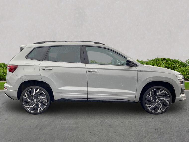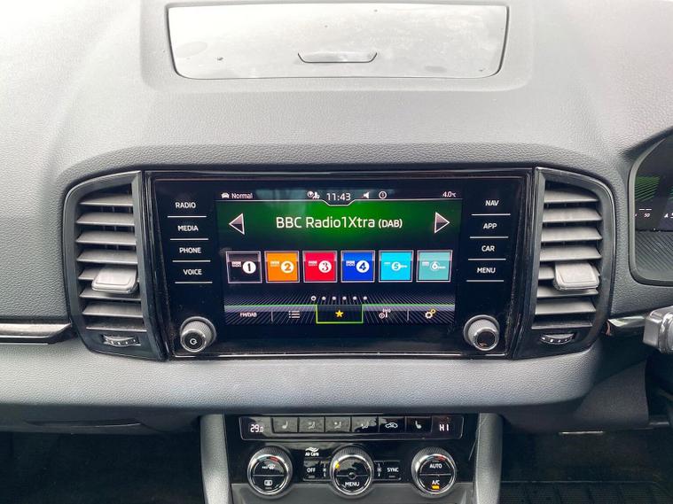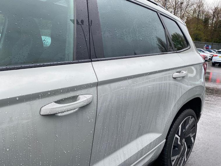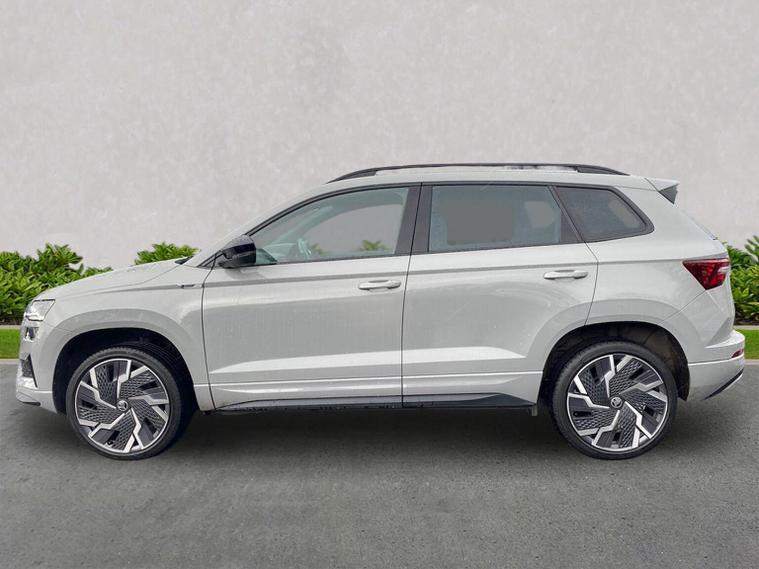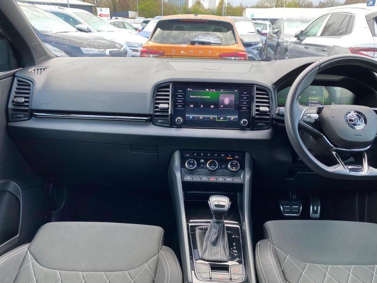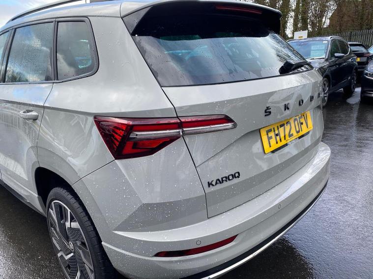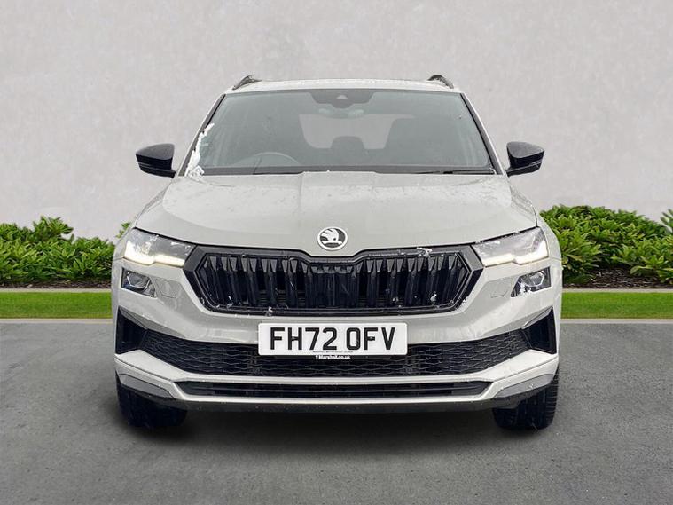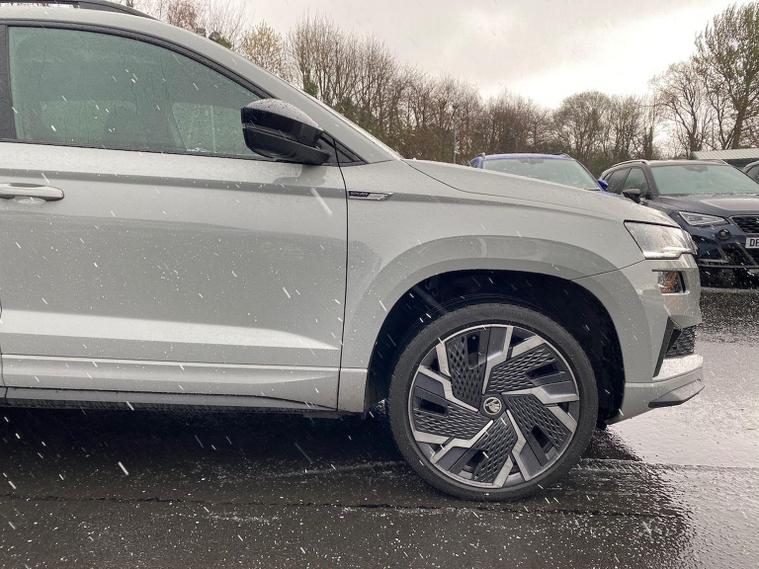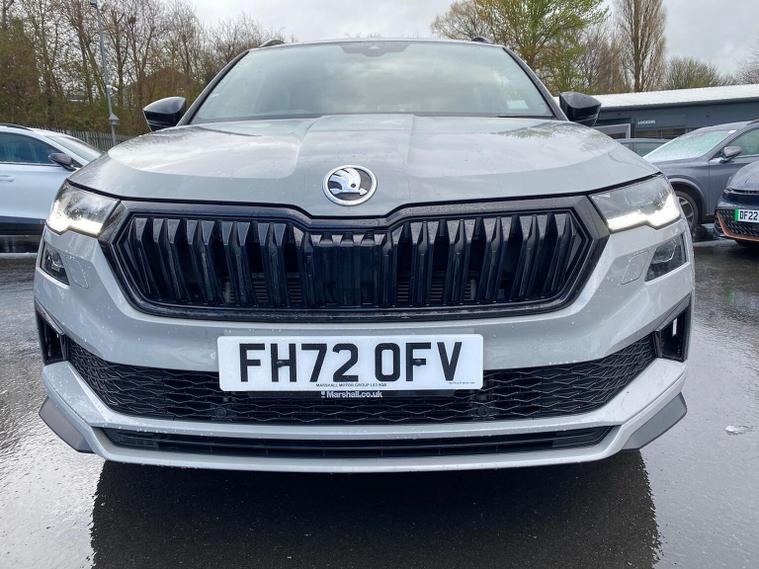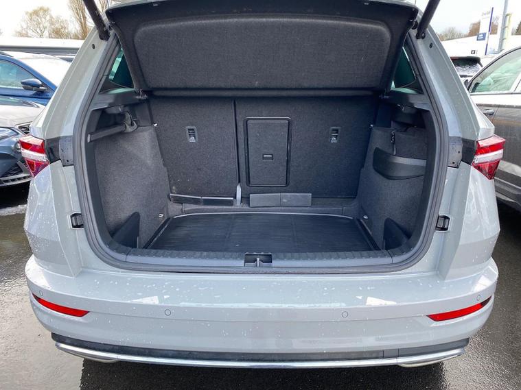 Skoda Karoq SportLine 1.5 TSI 150 PS DSG in Meteor Grey with black upholstery includes Bolero 8 inch touchscreen DAB radio Bluetooth SmartLink USB ports wireless Apple CarPlay CareConnect and emergency call. Driver assistance features include cruise control with speed limiter drive mode selection driver fatigue sensor front and rear parking sensors tyre pressure monitoring and voice control. Exterior equipment includes 17 inch Stratos alloy wheels chrome grille chrome window surrounds body coloured trim electrically adjustable heated folding mirrors with auto dimming on driver side illuminated boarding spots front and rear electric windows silver roof rails heated rear window LED headlights with daytime running lights front fog lights rear LED lights and a tyre repair kit. Inside it offers dual zone climate control height adjustable front seats manual lumbar support virtual cockpit two spoke leather multifunction steering wheel illuminated glovebox front centre armrest rear armrest split folding rear seats illuminated footwells overhead glasses holder reading lights textile floor mats sun visor with illuminated mirror and an umbrella in the drivers door. Safety equipment includes seven airbags including drivers knee airbag passenger airbag deactivation ESC ABS XDS plus hill start assist front assist with predictive pedestrian protection ISOFIX on outer rear seats child locks alarm with interior monitoring tilt sensor SAFE locking remote central locking with two keys and seatbelt reminders. We offer personal video appointments test drives and can arrange finance.