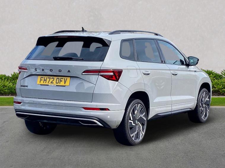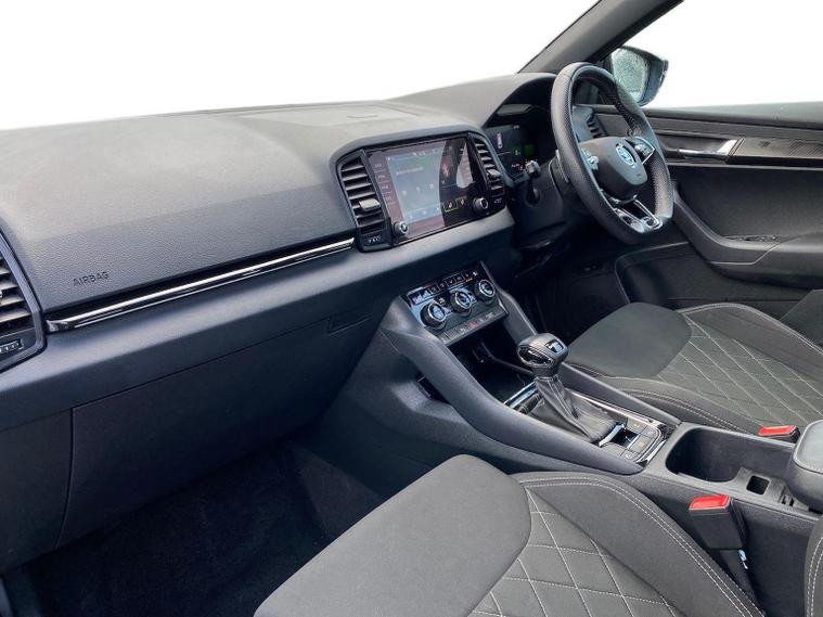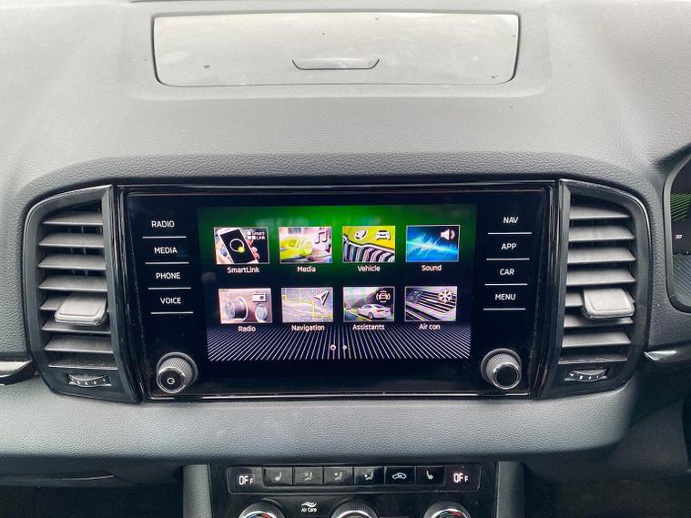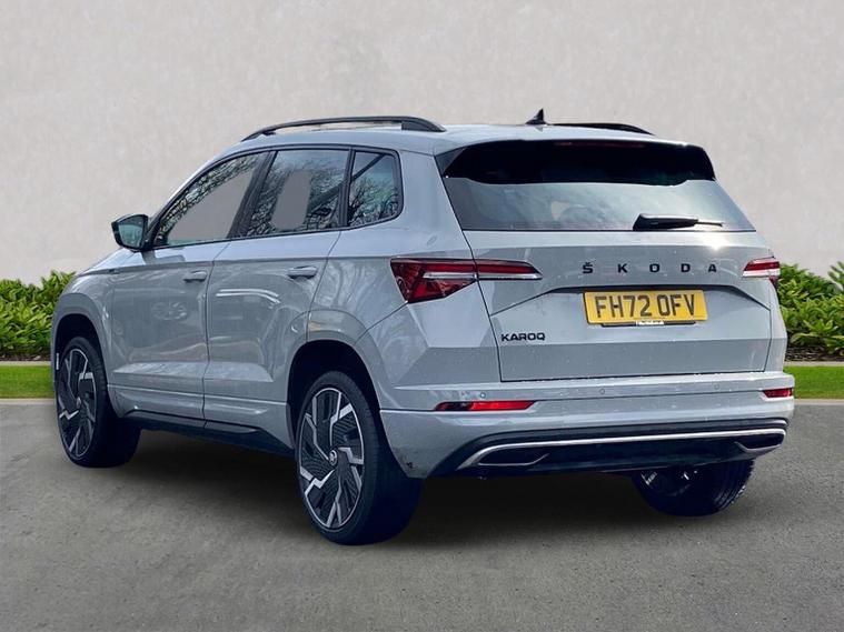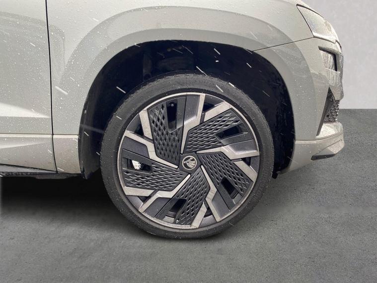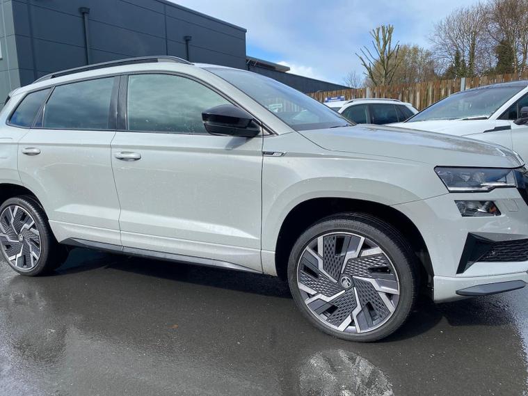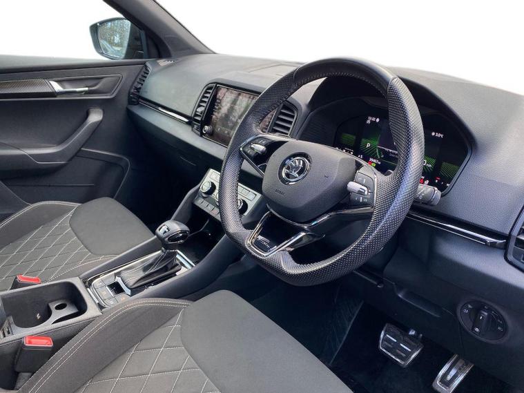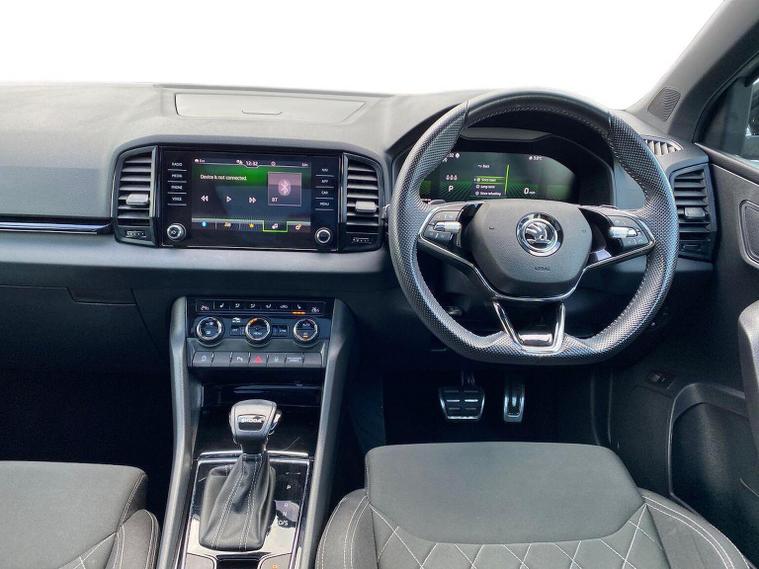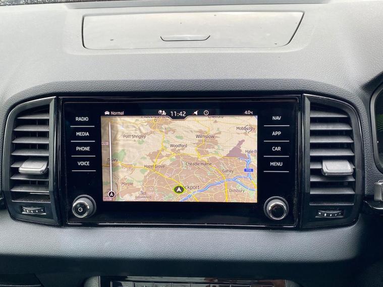 Skoda Karoq SportLine 1.5 TSI 150 PS DSG in Meteor Grey with black upholstery includes Bolero 8 inch touchscreen DAB radio Bluetooth SmartLink USB ports wireless Apple CarPlay CareConnect and emergency call. Driver assistance features include cruise control with speed limiter drive mode selection driver fatigue sensor front and rear parking sensors tyre pressure monitoring and voice control. Exterior equipment includes 17 inch Stratos alloy wheels chrome grille chrome window surrounds body coloured trim electrically adjustable heated folding mirrors with auto dimming on driver side illuminated boarding spots front and rear electric windows silver roof rails heated rear window LED headlights with daytime running lights front fog lights rear LED lights and a tyre repair kit. Inside it offers dual zone climate control height adjustable front seats manual lumbar support virtual cockpit two spoke leather multifunction steering wheel illuminated glovebox front centre armrest rear armrest split folding rear seats illuminated footwells overhead glasses holder reading lights textile floor mats sun visor with illuminated mirror and an umbrella in the drivers door. Safety equipment includes seven airbags including drivers knee airbag passenger airbag deactivation ESC ABS XDS plus hill start assist front assist with predictive pedestrian protection ISOFIX on outer rear seats child locks alarm with interior monitoring tilt sensor SAFE locking remote central locking with two keys and seatbelt reminders. We offer personal video appointments test drives and can arrange finance.