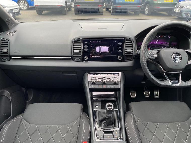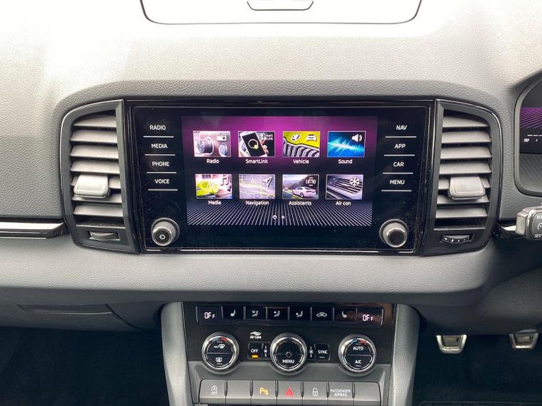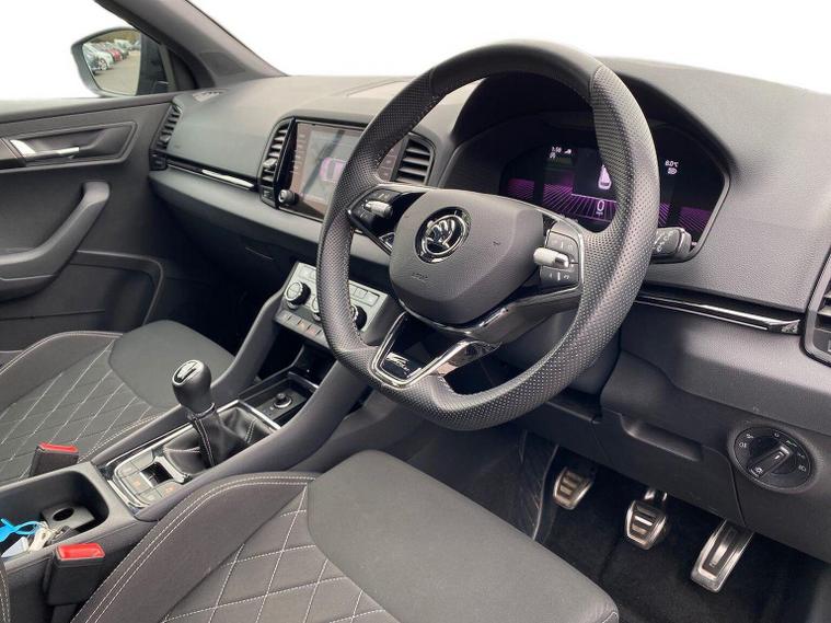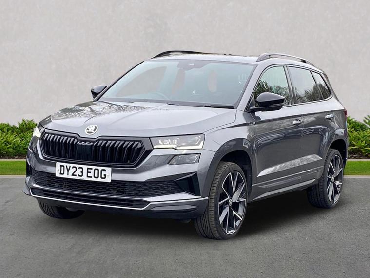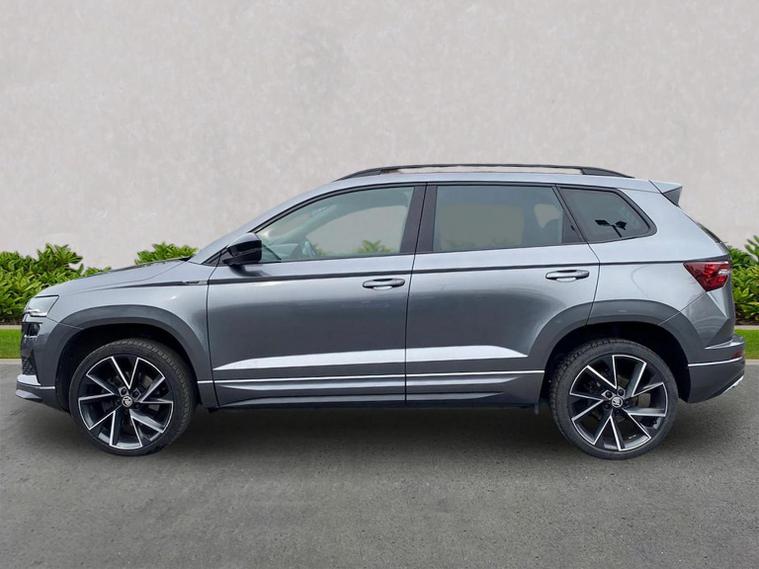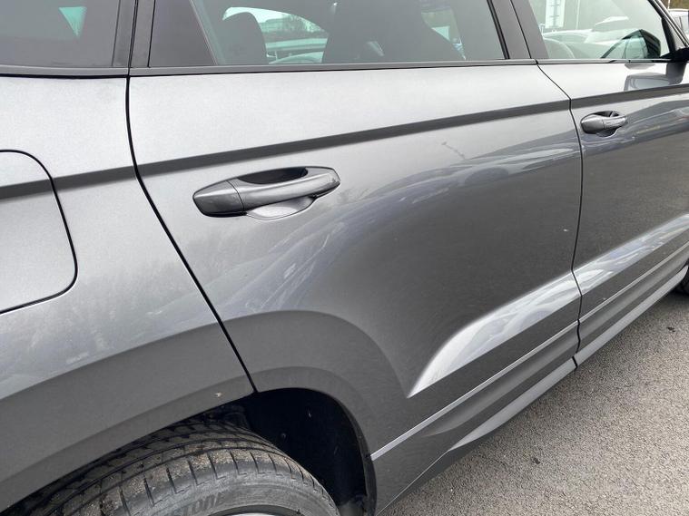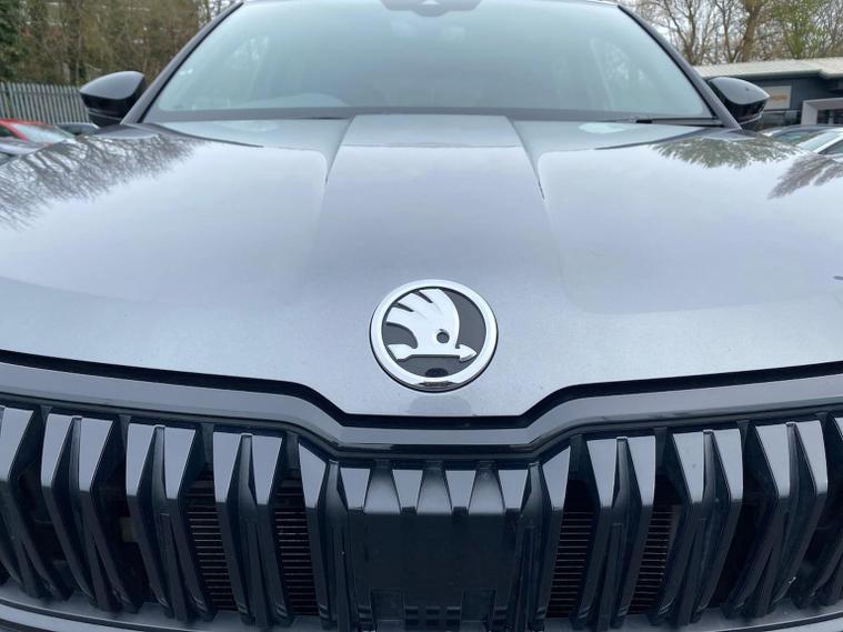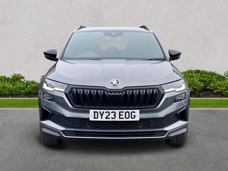 Skoda Karoq SportLine 1.5 TSI 150 PS DSG in Meteor Grey with black upholstery includes Bolero 8 inch touchscreen DAB radio Bluetooth SmartLink USB ports wireless Apple CarPlay CareConnect and emergency call. Driver assistance features include cruise control with speed limiter drive mode selection driver fatigue sensor front and rear parking sensors tyre pressure monitoring and voice control. Exterior equipment includes 17 inch Stratos alloy wheels chrome grille chrome window surrounds body coloured trim electrically adjustable heated folding mirrors with auto dimming on driver side illuminated boarding spots front and rear electric windows silver roof rails heated rear window LED headlights with daytime running lights front fog lights rear LED lights and a tyre repair kit. Inside it offers dual zone climate control height adjustable front seats manual lumbar support virtual cockpit two spoke leather multifunction steering wheel illuminated glovebox front centre armrest rear armrest split folding rear seats illuminated footwells overhead glasses holder reading lights textile floor mats sun visor with illuminated mirror and an umbrella in the drivers door. Safety equipment includes seven airbags including drivers knee airbag passenger airbag deactivation ESC ABS XDS plus hill start assist front assist with predictive pedestrian protection ISOFIX on outer rear seats child locks alarm with interior monitoring tilt sensor SAFE locking remote central locking with two keys and seatbelt reminders. We offer personal video appointments test drives and can arrange finance.