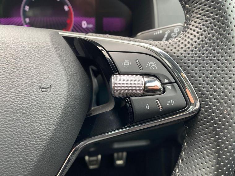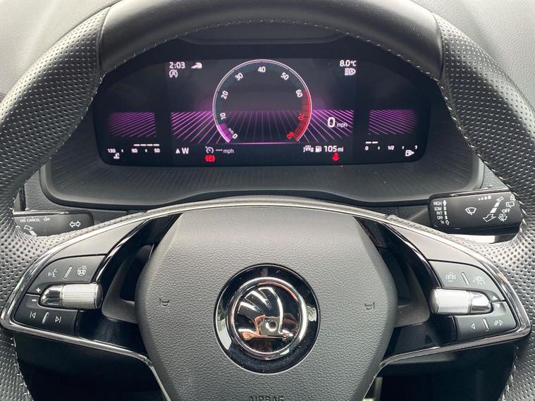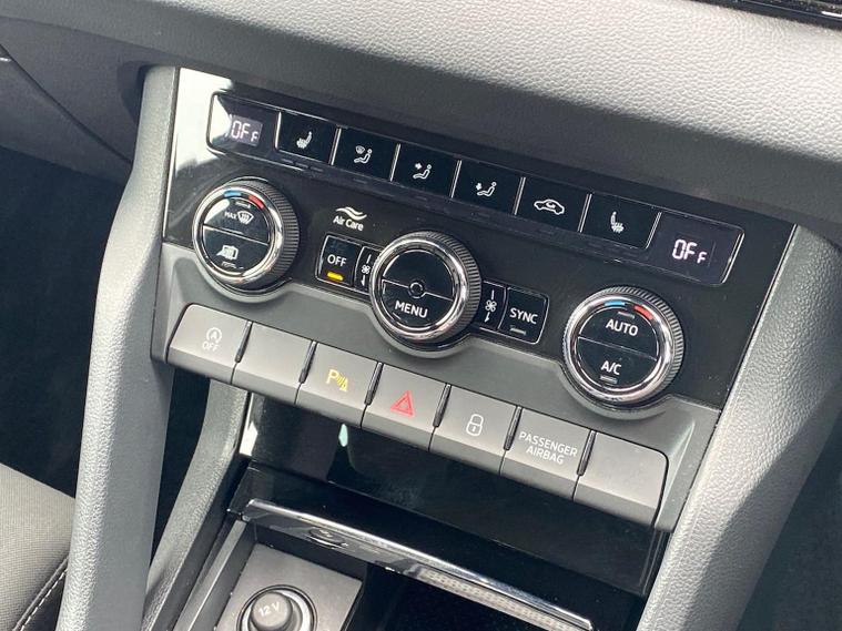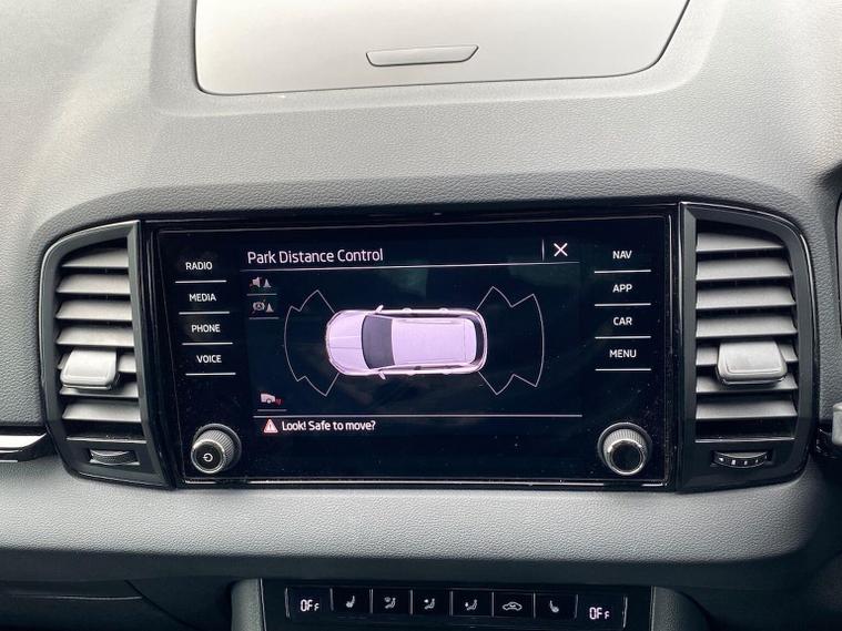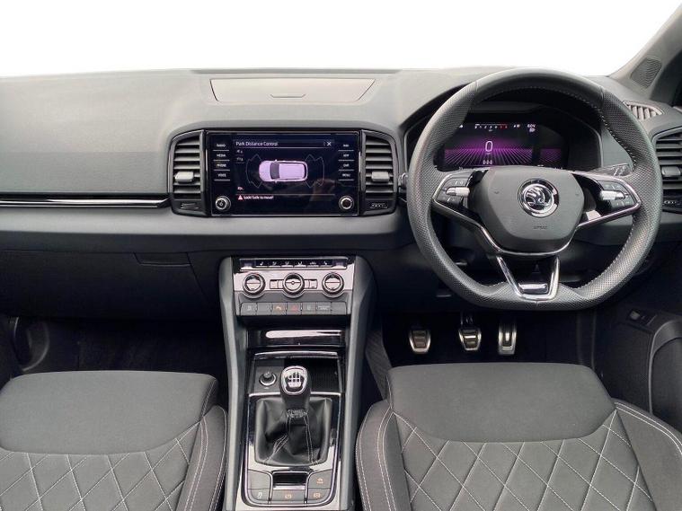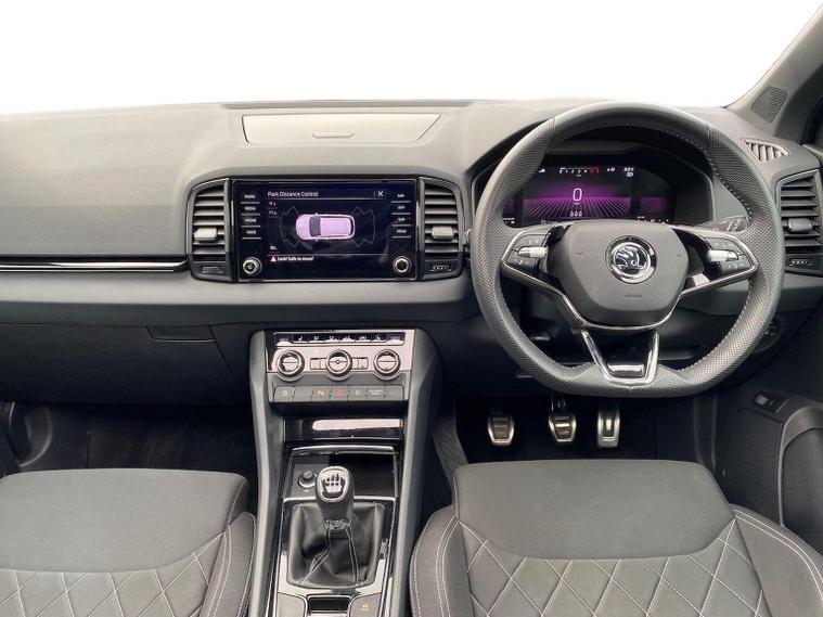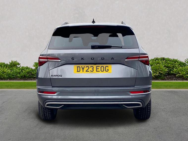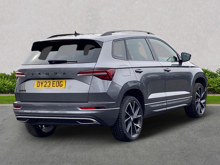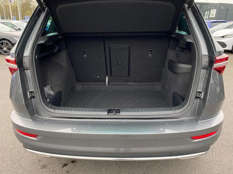 Skoda Karoq SportLine 1.5 TSI 150 PS DSG in Meteor Grey with black upholstery includes Bolero 8 inch touchscreen DAB radio Bluetooth SmartLink USB ports wireless Apple CarPlay CareConnect and emergency call. Driver assistance features include cruise control with speed limiter drive mode selection driver fatigue sensor front and rear parking sensors tyre pressure monitoring and voice control. Exterior equipment includes 17 inch Stratos alloy wheels chrome grille chrome window surrounds body coloured trim electrically adjustable heated folding mirrors with auto dimming on driver side illuminated boarding spots front and rear electric windows silver roof rails heated rear window LED headlights with daytime running lights front fog lights rear LED lights and a tyre repair kit. Inside it offers dual zone climate control height adjustable front seats manual lumbar support virtual cockpit two spoke leather multifunction steering wheel illuminated glovebox front centre armrest rear armrest split folding rear seats illuminated footwells overhead glasses holder reading lights textile floor mats sun visor with illuminated mirror and an umbrella in the drivers door. Safety equipment includes seven airbags including drivers knee airbag passenger airbag deactivation ESC ABS XDS plus hill start assist front assist with predictive pedestrian protection ISOFIX on outer rear seats child locks alarm with interior monitoring tilt sensor SAFE locking remote central locking with two keys and seatbelt reminders. We offer personal video appointments test drives and can arrange finance.