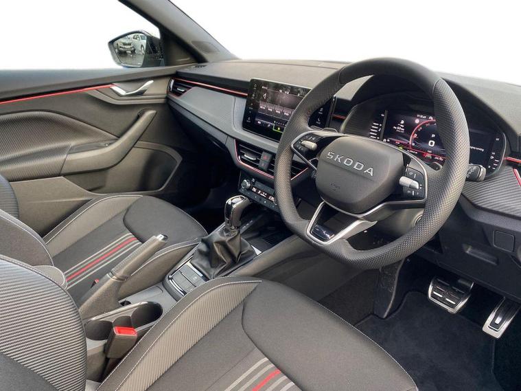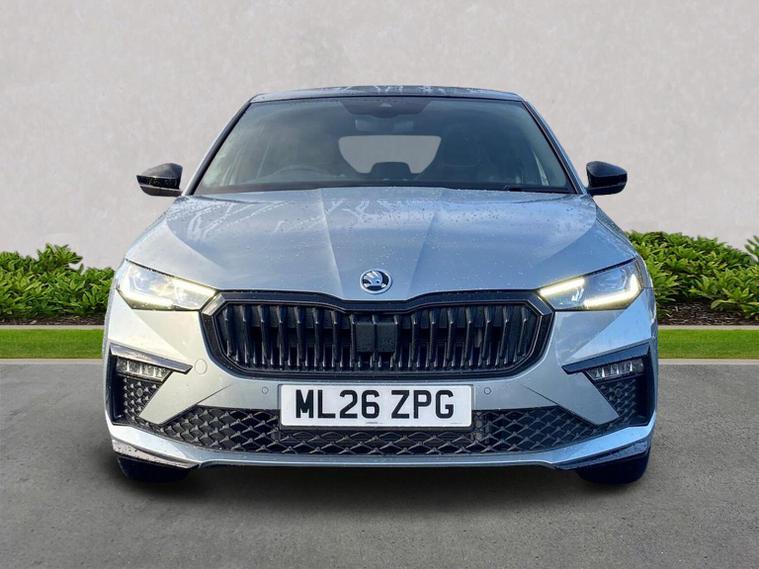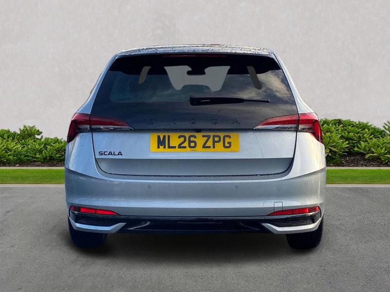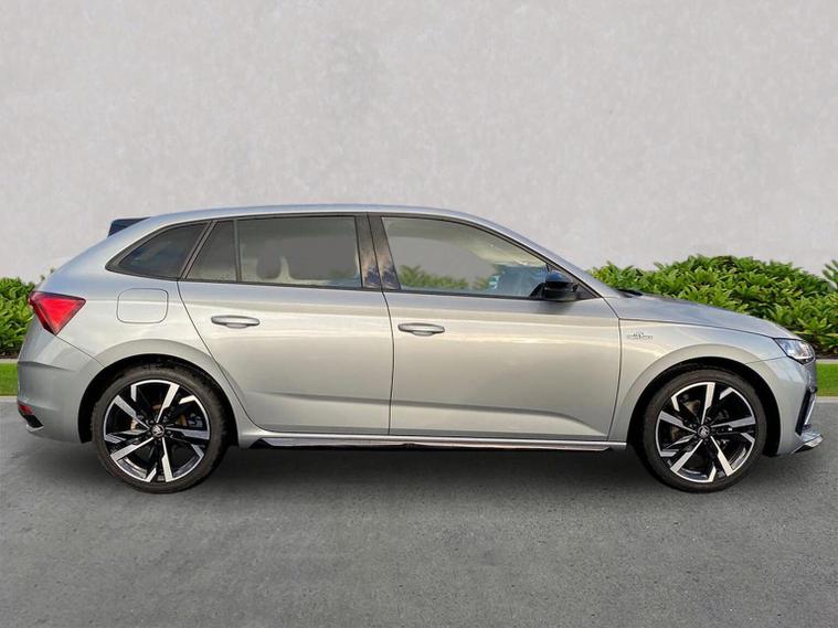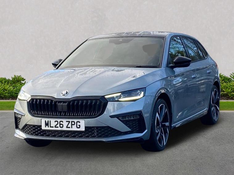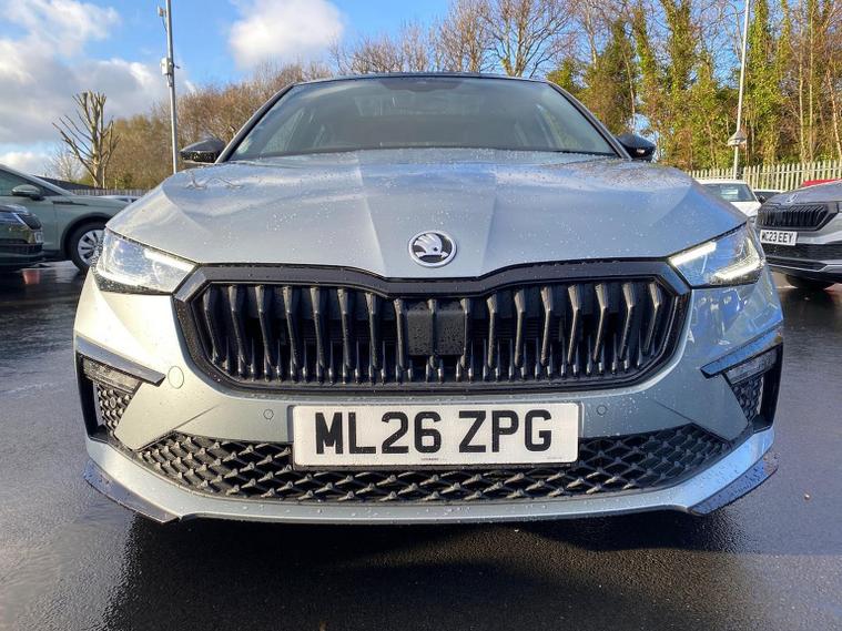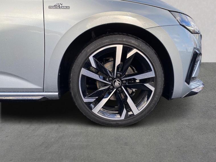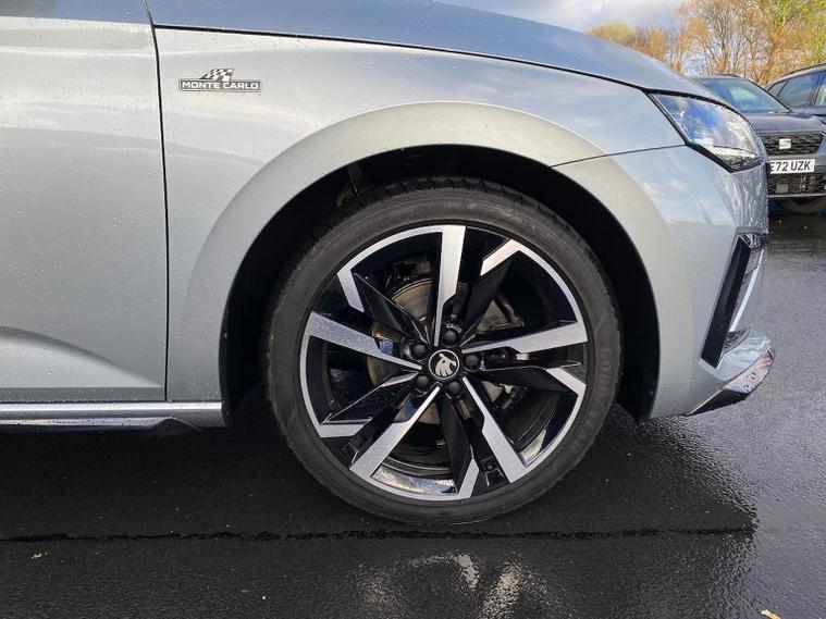 Skoda Scala Monte Carlo Edition 1.5 TSI 150 PS DSG in Smokey Silver Metallic with Monte Carlo interior includes 18 inch Ursa black diamond cut alloy wheels panoramic glass roof black exterior styling extended tailgate glass Monte Carlo plaque privacy glass and black diffuser. Standard equipment includes 9.2 inch Skoda navigation wireless SmartLink DAB radio Bluetooth Care Connect four USB C ports eight speakers emergency call proactive services adaptive cruise control driver alert rear parking sensors rear view camera tyre pressure monitoring traffic sign recognition and voice control. Exterior features include heated rear window black mirrors black grille body coloured bumpers front and rear electric windows and a tyre repair kit. Inside it offers a heated three spoke leather sports multifunction steering wheel with DSG paddles aluminium pedals white red ambient lighting black roof headlining virtual cockpit dual zone climate control front centre armrest illuminated glovebox textile floor mats height adjustable front seats manual lumbar support cargo elements net package net under shelf storage pockets rear centre armrest roof lights sun visors with mirrors ice scraper umbrella in drivers door and the Winter Pack. Safety equipment includes front side and curtain airbags passenger airbag deactivation drive mode select with sport chassis control and ECO mode front assist lane assist hill hold control isofix on front passenger seat and rear seats top tether alarm with SAFE locking disc brakes and seatbelt reminders. We offer personal video appointments test drives and can arrange finance.