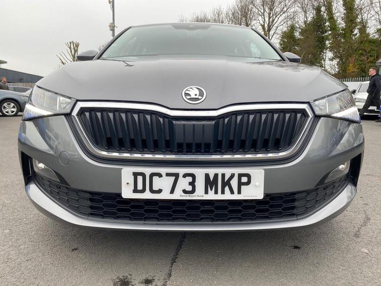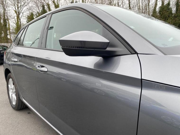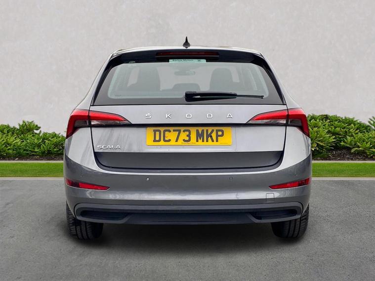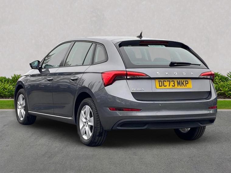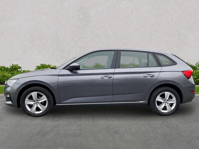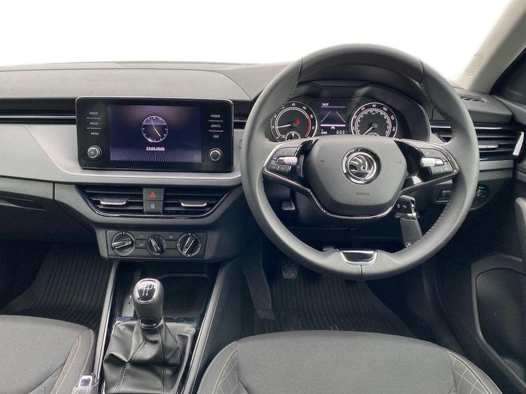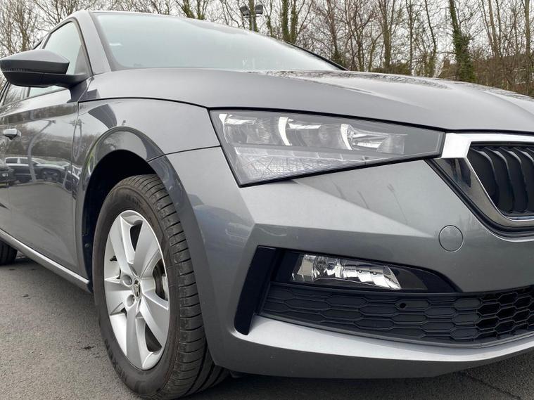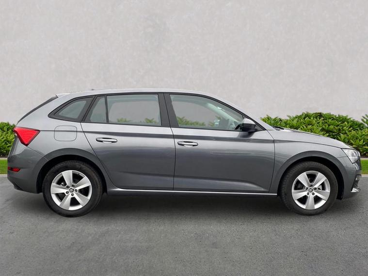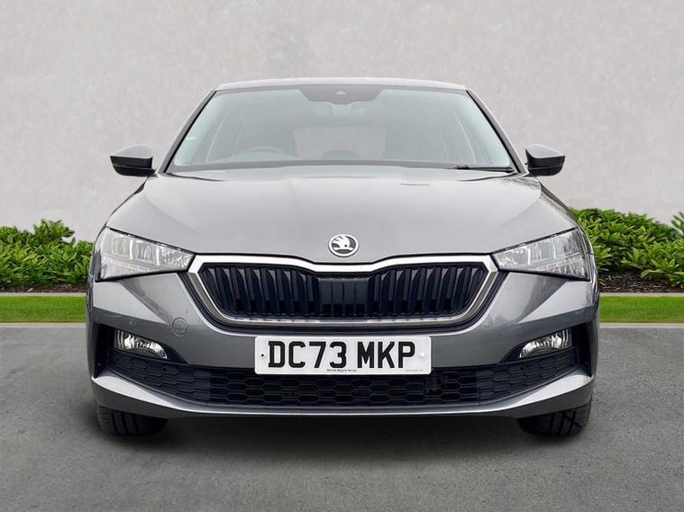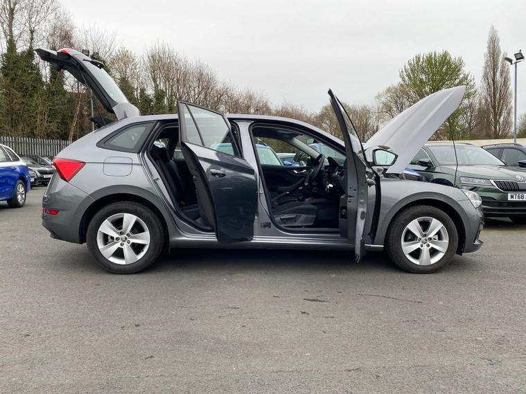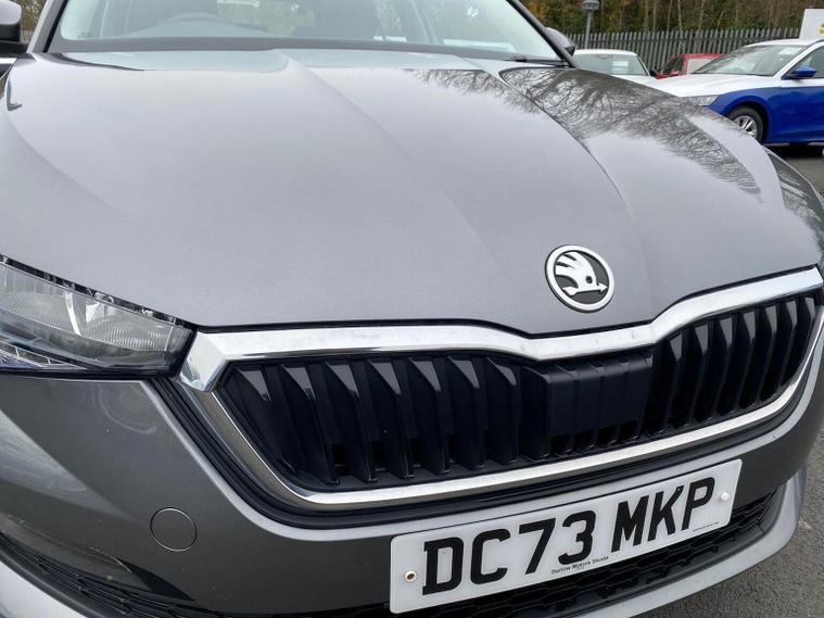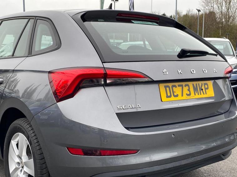 Skoda Scala SE 1.0 TSI 95 PS manual in Graphite Grey Metallic with black interior and grey ceiling includes 16 inch Nyota alloy wheels DAB radio Bluetooth wireless SmartLink four USB C ports eight speakers emergency call proactive services remote access cruise control with speed limiter advanced driver attention and drowsiness monitor rear parking sensors traffic sign recognition tyre pressure monitoring electrically adjustable heated door mirrors front and rear electric windows heated rear screen body coloured trim chrome grille LED headlights LED daytime running lights LED rear lights front fog lights LED rear fog light and a tyre repair kit. Inside it offers dual zone climate control height adjustable driver and passenger seats manual lumbar support two spoke leather multifunction steering wheel 8.25 inch infotainment display 8 inch digital dashboard auto dimming rear view mirror illuminated glovebox front centre armrest overhead glasses holder net package cargo element net under rear shelf textile floor mats three rear headrests sun visor mirrors ice scraper ticket holder and umbrella in drivers door. Safety features include ABS front side and curtain airbags passenger airbag deactivation front assist lane assist hill hold control isofix on front passenger seat and rear seats top tether alarm with SAFE function remote central locking immobiliser and seatbelt reminders. We offer personal video appointments test drives and can arrange finance.