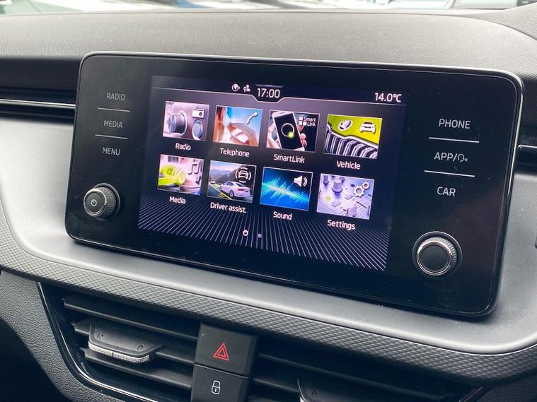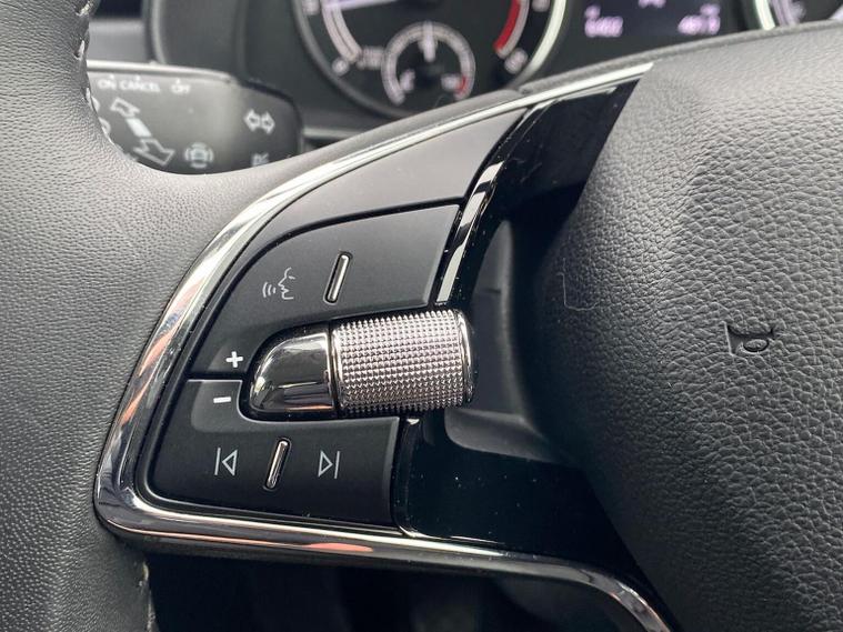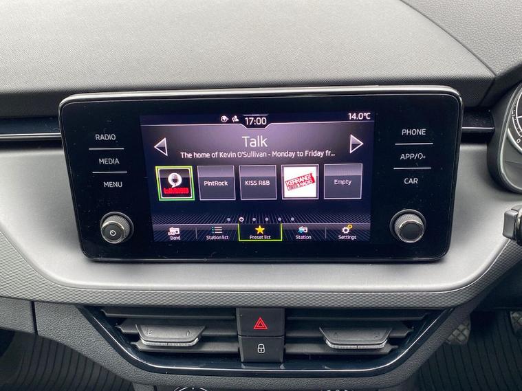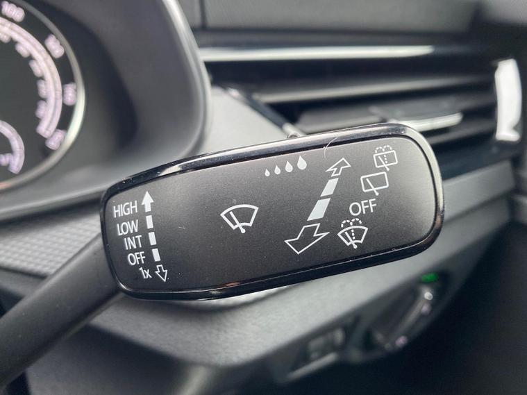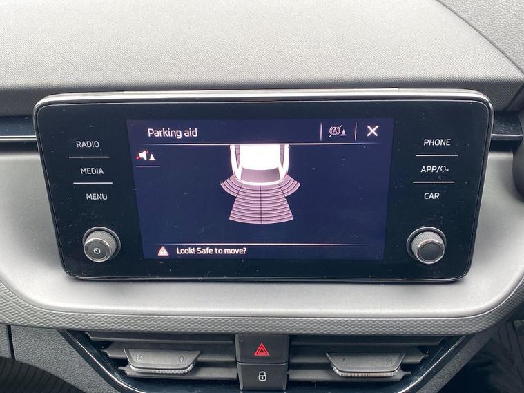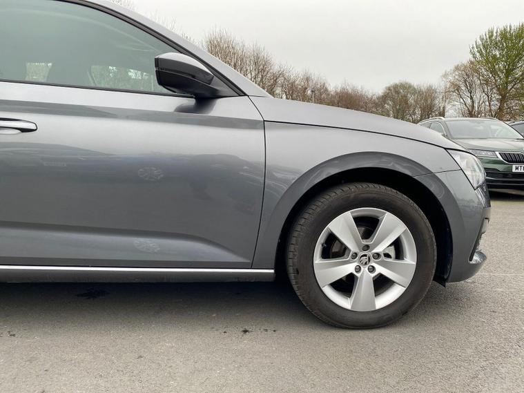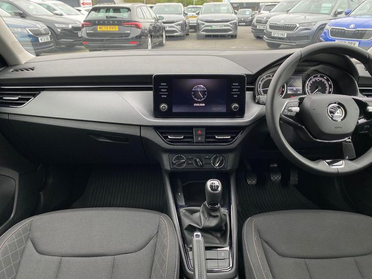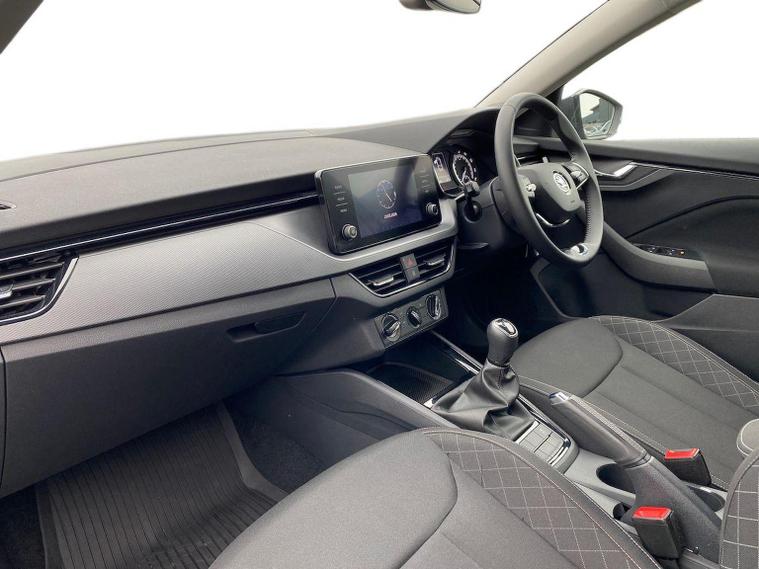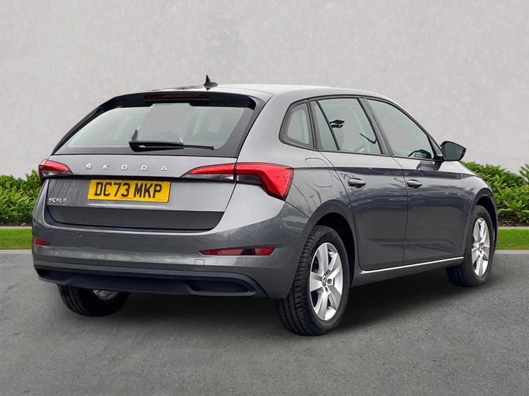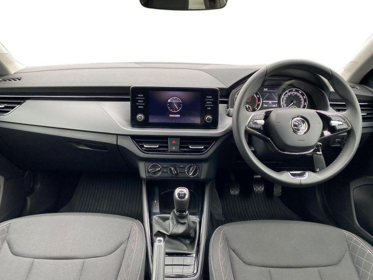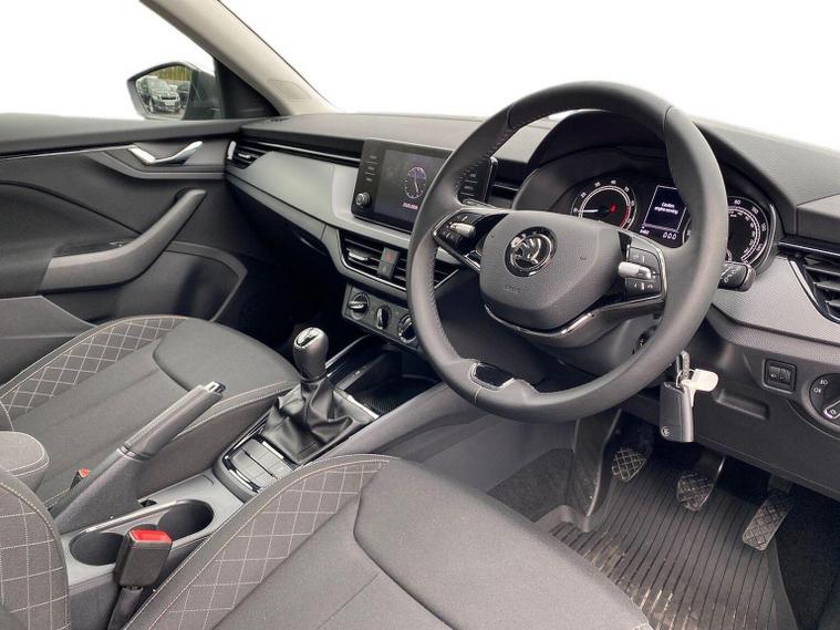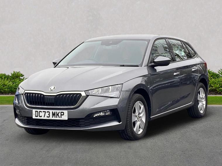 Skoda Scala SE 1.0 TSI 95 PS manual in Graphite Grey Metallic with black interior and grey ceiling includes 16 inch Nyota alloy wheels DAB radio Bluetooth wireless SmartLink four USB C ports eight speakers emergency call proactive services remote access cruise control with speed limiter advanced driver attention and drowsiness monitor rear parking sensors traffic sign recognition tyre pressure monitoring electrically adjustable heated door mirrors front and rear electric windows heated rear screen body coloured trim chrome grille LED headlights LED daytime running lights LED rear lights front fog lights LED rear fog light and a tyre repair kit. Inside it offers dual zone climate control height adjustable driver and passenger seats manual lumbar support two spoke leather multifunction steering wheel 8.25 inch infotainment display 8 inch digital dashboard auto dimming rear view mirror illuminated glovebox front centre armrest overhead glasses holder net package cargo element net under rear shelf textile floor mats three rear headrests sun visor mirrors ice scraper ticket holder and umbrella in drivers door. Safety features include ABS front side and curtain airbags passenger airbag deactivation front assist lane assist hill hold control isofix on front passenger seat and rear seats top tether alarm with SAFE function remote central locking immobiliser and seatbelt reminders. We offer personal video appointments test drives and can arrange finance.