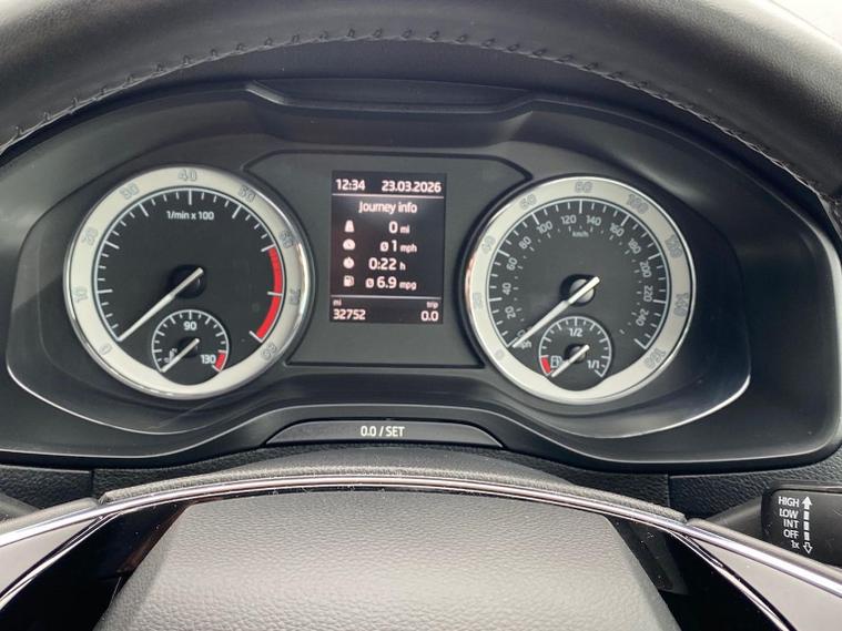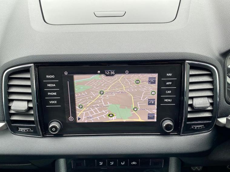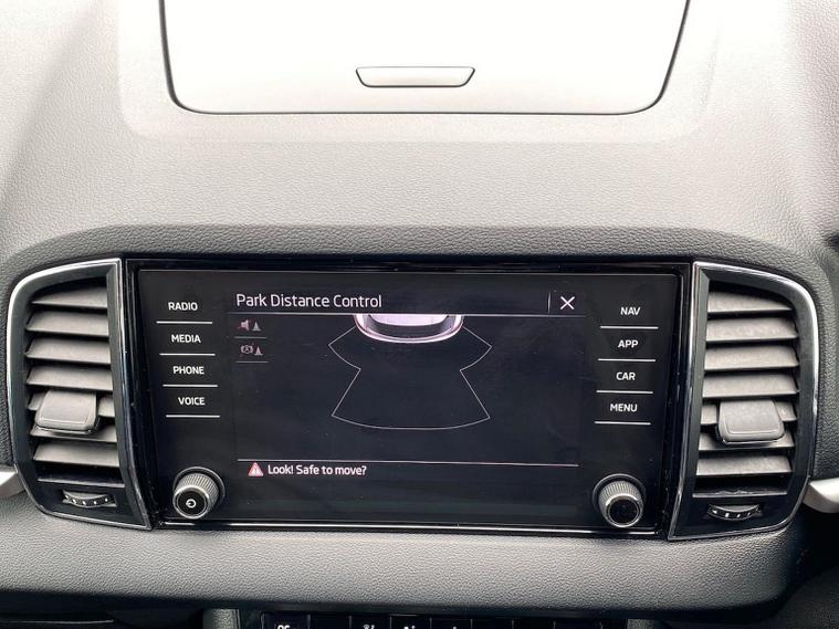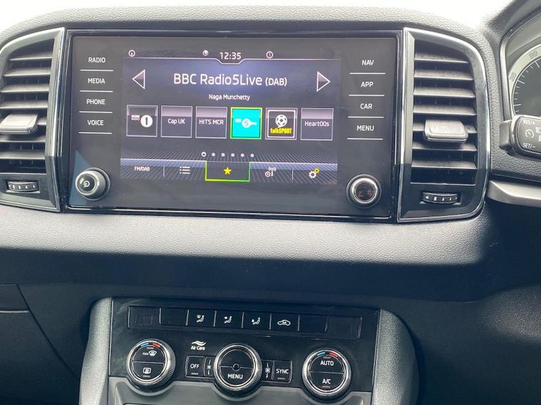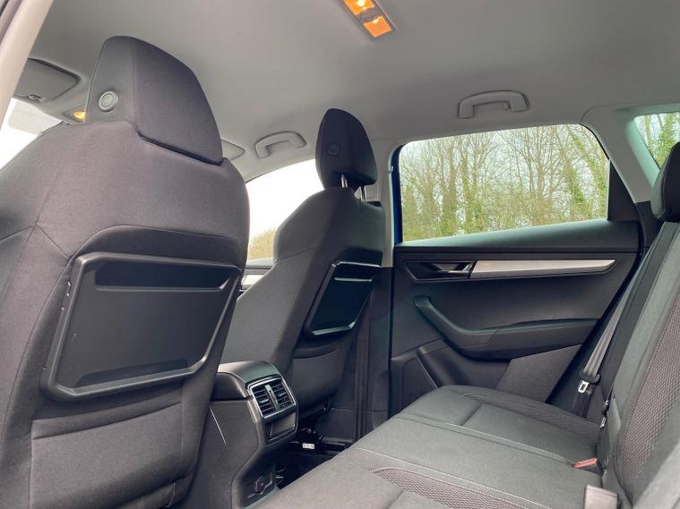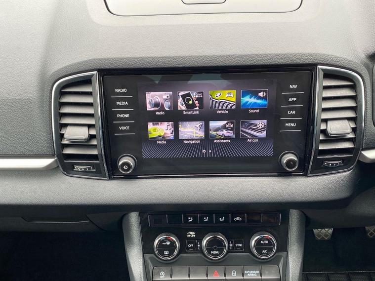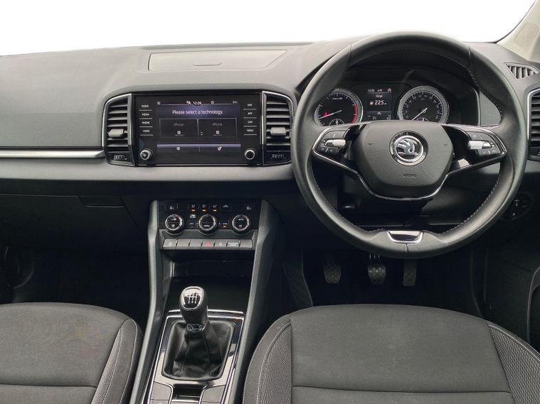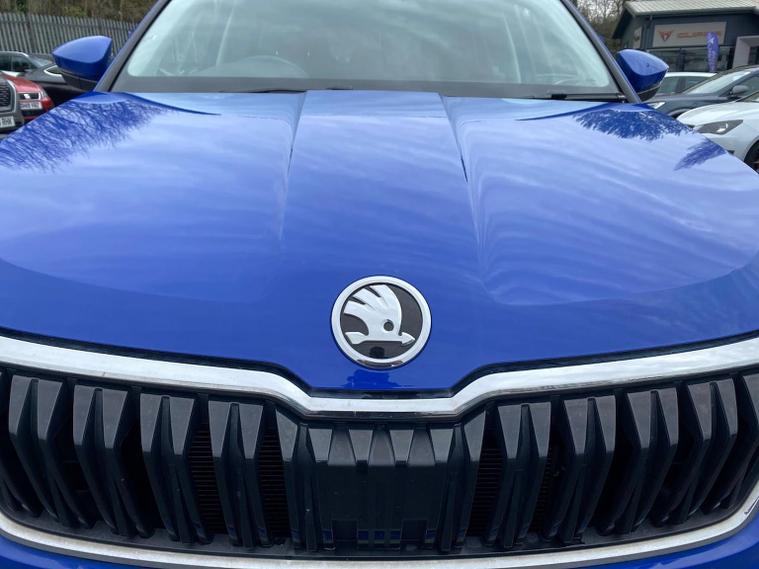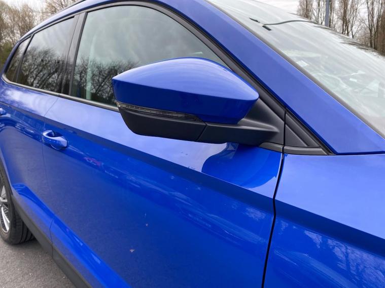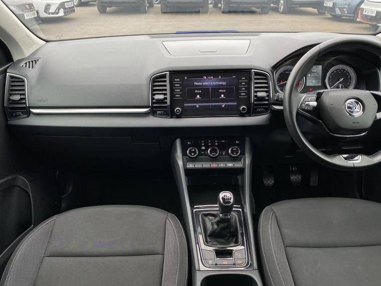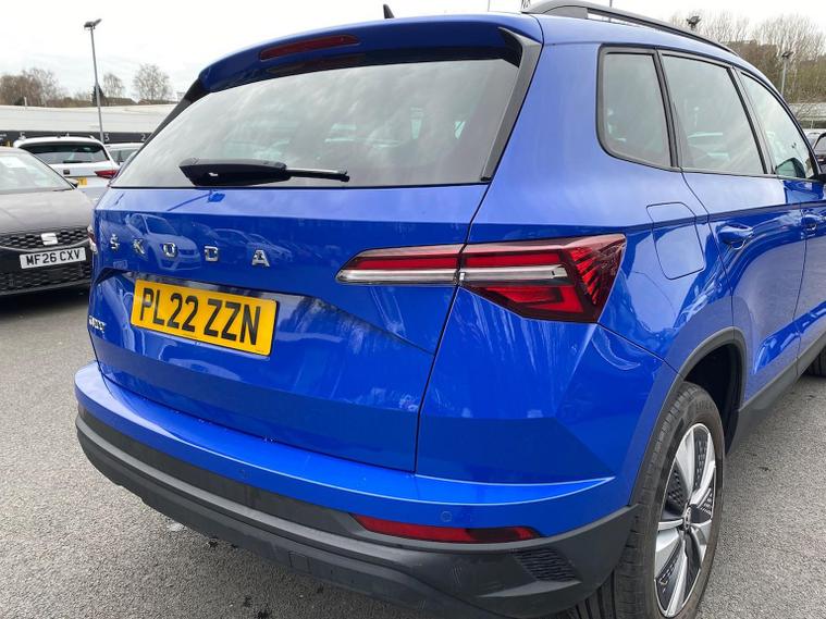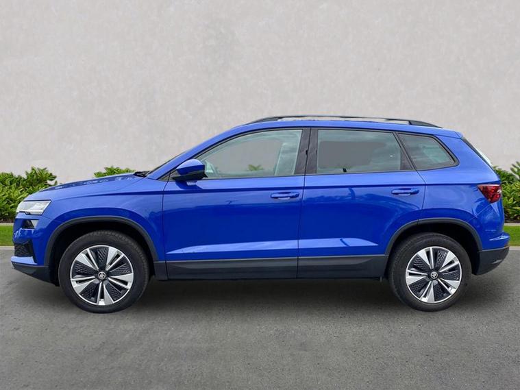 Skoda Karoq SE Drive 1.5 TSI 150 PS manual in Energy Blue with black upholstery includes 17 inch Scutus alloy wheels Amundsen satellite navigation DAB radio Bluetooth SmartLink USB C ports eight speakers Care Connect emergency call proactive services infotainment online remote access cruise control with speed limiter driver fatigue sensor rear parking sensors tyre pressure monitoring and light assistant. Exterior features include black roof rails privacy glass electrically adjustable heated folding auto dimming mirrors front and rear electric windows heated rear screen body coloured trim LED headlights headlight range control front fog lights high functionality rear LED lights with dynamic indicators and a tyre repair kit. Inside it offers dual zone climate control height adjustable front seats manual lumbar support two spoke leather multifunction steering wheel 8 inch digital dashboard foldable rear seats double sided boot floor boot nets cargo element folding tables rear package tray tablet holders illuminated glovebox front centre armrest overhead glasses holder reading lights textile floor mats three rear headrests rubbish bin sun visor with illuminated mirror, under front passenger seat. Safety equipment includes front side head and knee airbags passenger airbag deactivation ESC ABS hill hold control electronic parking brake with auto hold front assist pedestrian monitor isofix on outer rear seats and front passenger seat top tether alarm with SAFE function immobiliser remote central locking with two keys automatic fuel cut off emergency brake signal and rear wash wipe. We offer personal video appointments test drives and can arrange finance.