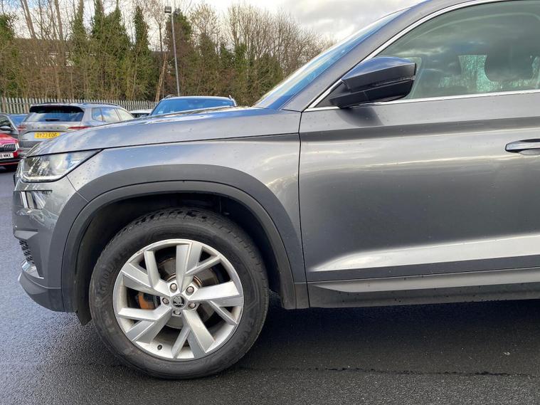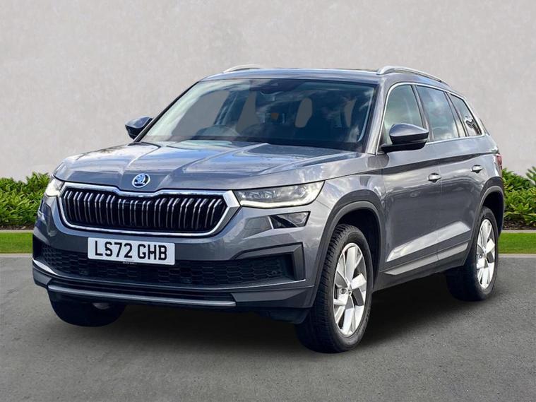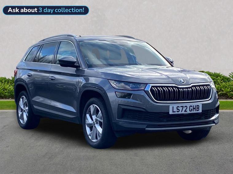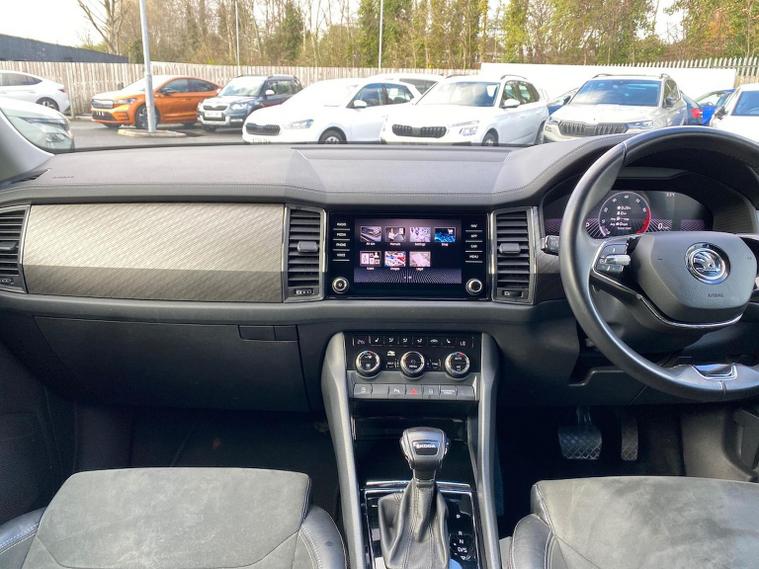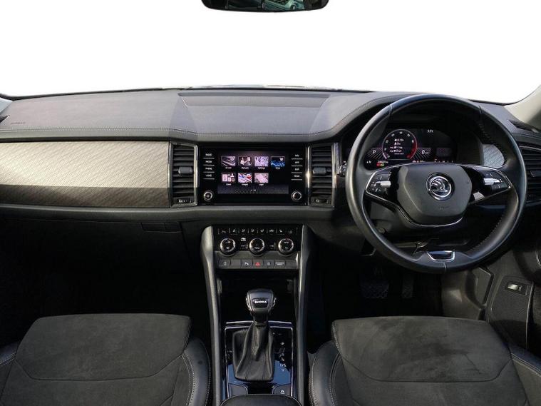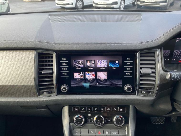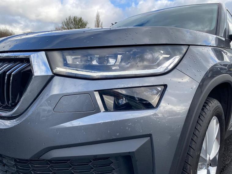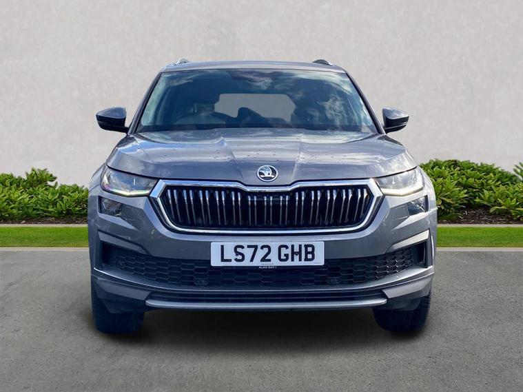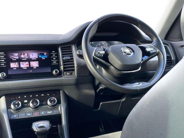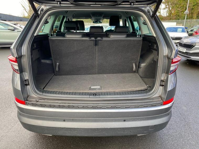 Skoda Kodiaq SE L 1.5 TSI 150 PS DSG 7 seats in Graphite Grey Metallic with black upholstery includes 19 inch Triglav alloy wheels Amundsen navigation DAB radio Bluetooth SmartLink wireless charging USB C ports Care Connect and emergency call. Driver assistance features include cruise control drive mode selection rear and front parking sensors tyre pressure monitoring and a colour multifunction trip computer. Exterior equipment includes chrome styling chrome roof rails electrically adjustable heated folding auto dimming mirrors extended rear spoiler front and rear electric windows heated rear screen invisible tailpipe privacy glass black wheel arch surrounds body coloured trim off road style lower bumper headlights washers full LED matrix headlights LED daytime running lights LED rear fog lights LED rear lights with dynamic indicators and a tyre repair kit. Inside it offers dual zone climate control heated front seats height adjustable front seats manual lumbar support 2 spoke leather multifunction steering wheel decorative inserts drawers under front seats sliding and folding second row seats three rear headrests variable boot floor illuminated glovebox illuminated boot two fixed boot lights net programme cargo storage compartment bottle holders rear centre armrest umbrella overhead glasses holder textile floor mats sun visor with illuminated vanity mirror and ticket holder. Safety features include front side and curtain airbags ESC ABS hill start assist front assist with autonomous emergency braking emergency rear brake signal ISOFIX on outer rear seats top tether alarm with interior monitoring tilt sensor keyless entry and start remote central locking seatbelt reminders rear wiper and fuel cut off in the event of an accident. We offer personal video appointments test drives and can arrange finance.