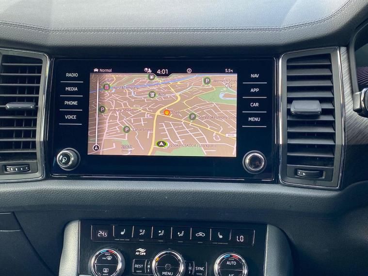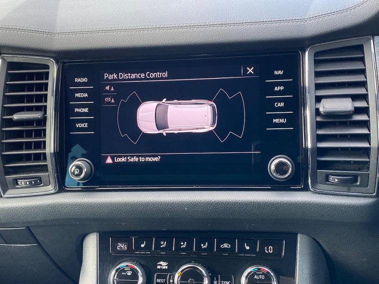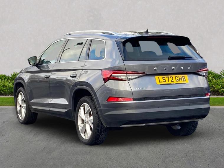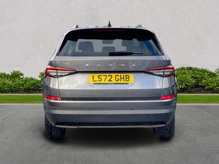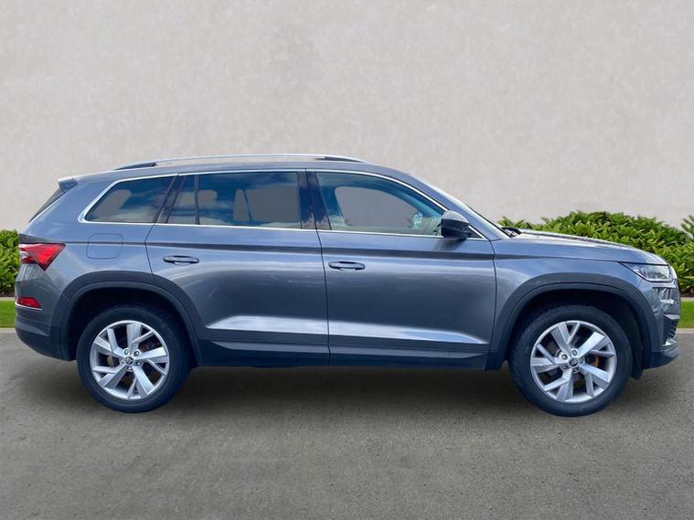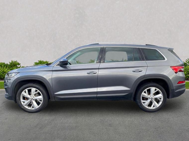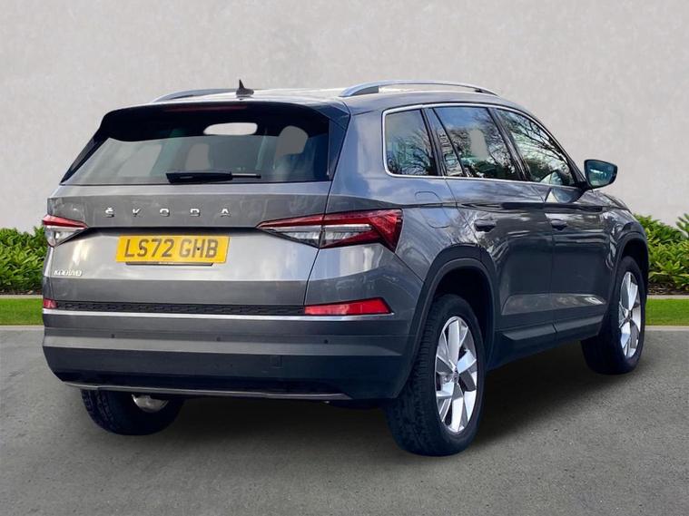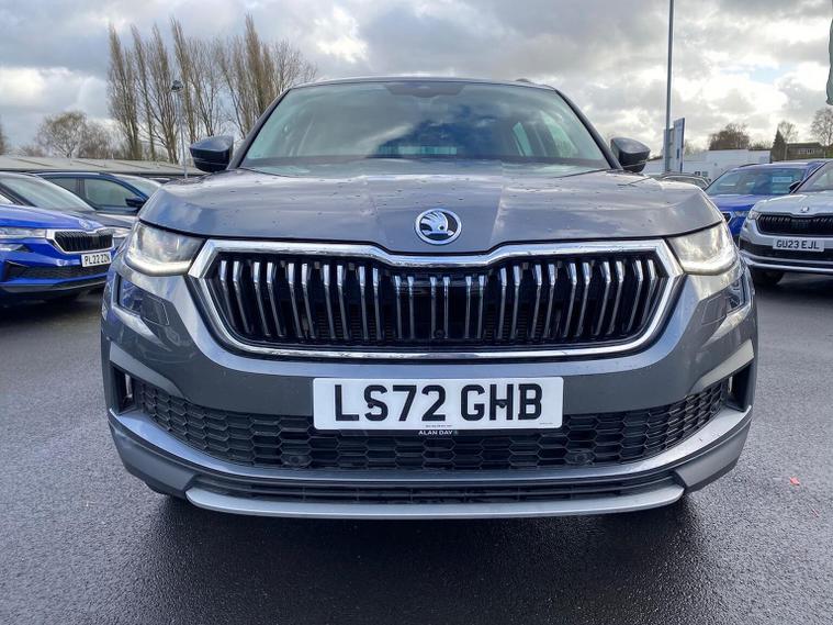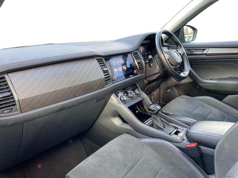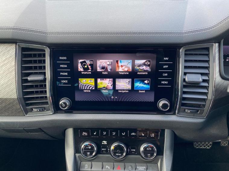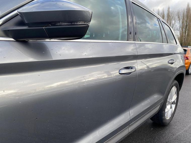 Skoda Kodiaq SE L 1.5 TSI 150 PS DSG 7 seats in Graphite Grey Metallic with black upholstery includes 19 inch Triglav alloy wheels Amundsen navigation DAB radio Bluetooth SmartLink wireless charging USB C ports Care Connect and emergency call. Driver assistance features include cruise control drive mode selection rear and front parking sensors tyre pressure monitoring and a colour multifunction trip computer. Exterior equipment includes chrome styling chrome roof rails electrically adjustable heated folding auto dimming mirrors extended rear spoiler front and rear electric windows heated rear screen invisible tailpipe privacy glass black wheel arch surrounds body coloured trim off road style lower bumper headlights washers full LED matrix headlights LED daytime running lights LED rear fog lights LED rear lights with dynamic indicators and a tyre repair kit. Inside it offers dual zone climate control heated front seats height adjustable front seats manual lumbar support 2 spoke leather multifunction steering wheel decorative inserts drawers under front seats sliding and folding second row seats three rear headrests variable boot floor illuminated glovebox illuminated boot two fixed boot lights net programme cargo storage compartment bottle holders rear centre armrest umbrella overhead glasses holder textile floor mats sun visor with illuminated vanity mirror and ticket holder. Safety features include front side and curtain airbags ESC ABS hill start assist front assist with autonomous emergency braking emergency rear brake signal ISOFIX on outer rear seats top tether alarm with interior monitoring tilt sensor keyless entry and start remote central locking seatbelt reminders rear wiper and fuel cut off in the event of an accident. We offer personal video appointments test drives and can arrange finance.