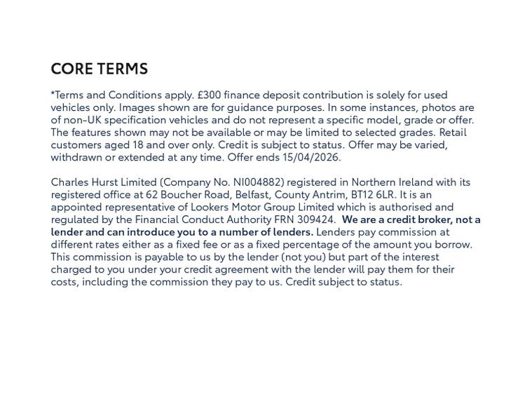 This stylish 2021 Toyota Yaris Cross Dynamic blends compact SUV practicality with Toyota’s advanced hybrid efficiency. Powered by a responsive 1.5-litre petrol-hybrid engine and smooth automatic transmission, it offers excellent fuel economy, low emissions and a refined driving experience, ideal for both city streets and longer journeys. The elevated driving position and compact footprint make manoeuvring effortless. The Dynamic trim adds a sporty and premium feel, featuring striking alloy wheels, roof rails, privacy glass, LED lighting and distinctive exterior detailing. Inside, you’ll find a well-designed cabin with a touchscreen infotainment system including Apple CarPlay, Android Auto and Bluetooth connectivity. Dual-zone climate control, reversing camera and smart entry all enhance everyday convenience. Toyota Safety Sense provides outstanding reassurance with lane assist, adaptive cruise control, road-sign recognition and pre-collision warning. Practical, efficient and full of modern technology, this Yaris Cross Dynamic is a superb compact SUV ready to drive away. For over 100 years, Charles Hurst Toyota has been Northern Ireland’s trusted name for new and used Toyotas. Every car is Toyota Approved, prepared by our expert Toyota trained technicians, and our pre-owned vehicles come with a 12-month Toyota Warranty, ensuring complete peace of mind with every drive.
