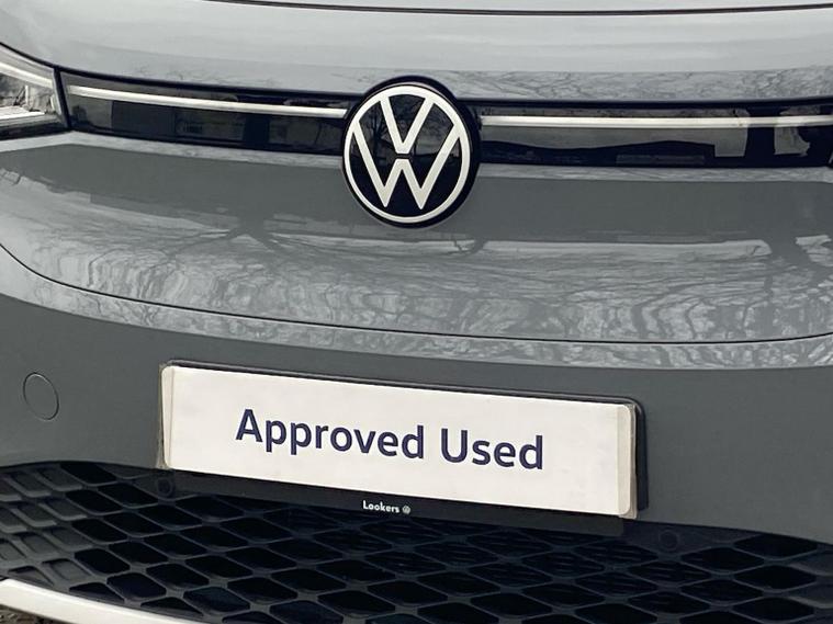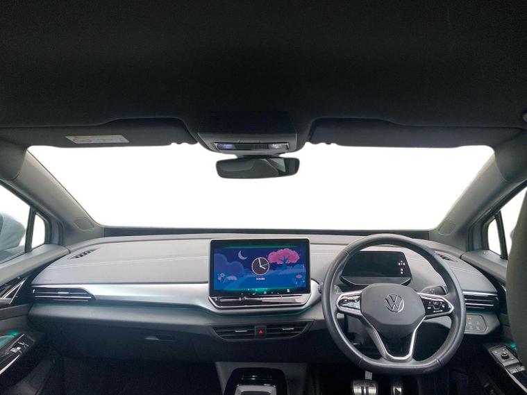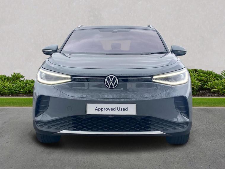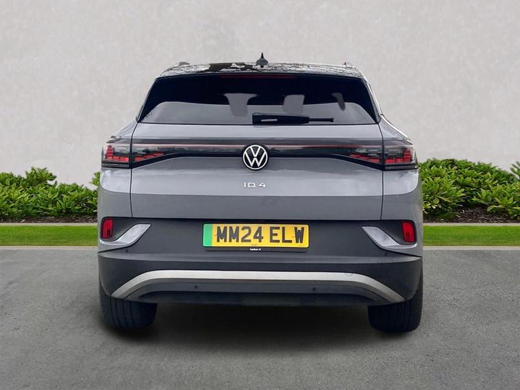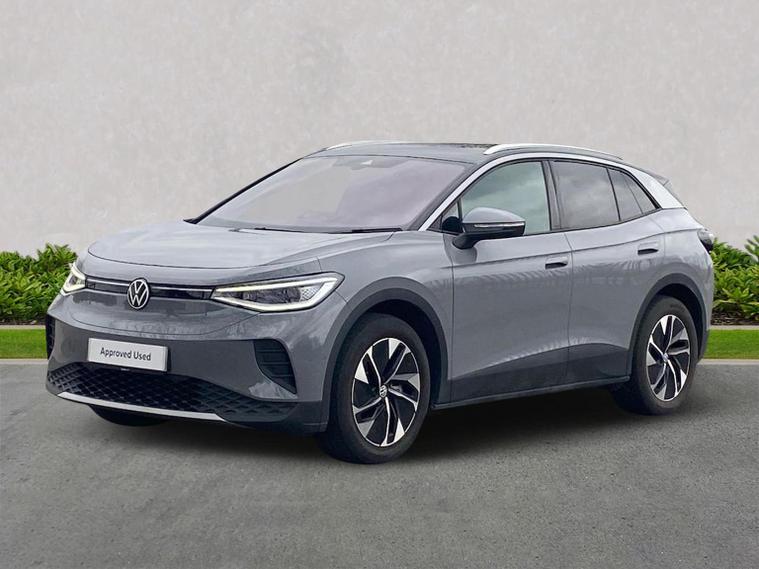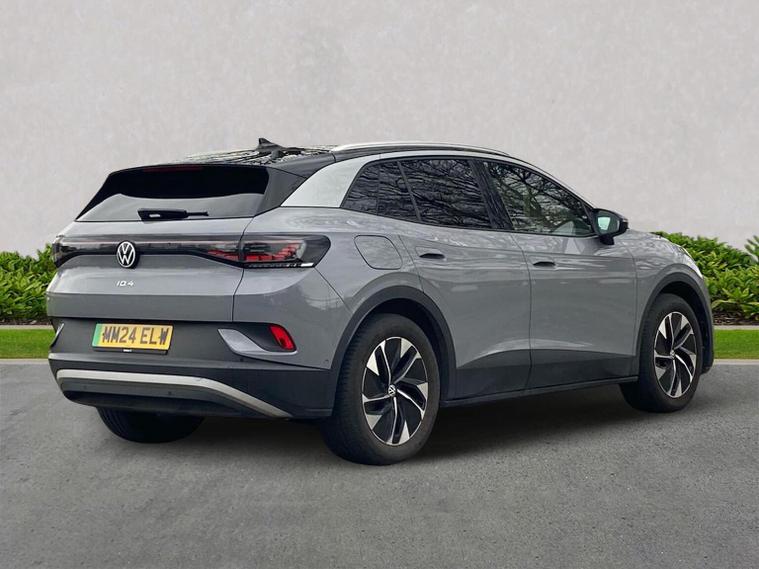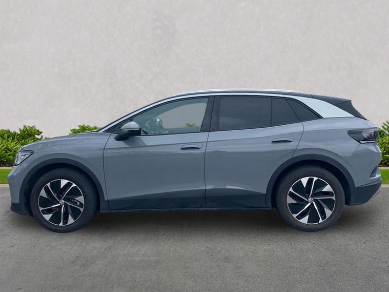 Volkswagen ID.4 Match 77kWh Pro 286PS finished in Moonstone Grey with contrasting Black roof, featuring Soul Black–Platinum Grey interior. This well-specified 5-door automatic offers a refined all-electric driving experience with premium comfort and technology throughout. Exterior styling includes illuminated door handle recesses and grille, Matrix LED headlights with dynamic light assist, LED rear lights with dynamic indicators, tinted rear glass and silver roof rails as part of the bi-colour style pack. Easy Open & Close electric tailgate with virtual pedal adds convenience, while the 19" Hamar Black diamond-turned alloys enhance the overall look. Inside, the Interior Style package provides Art Velours microfleece comfort seats, heated leatherette-wrapped multifunction steering wheel with touch controls, ambient lighting with 30 colour options and a versatile rear bench with split folding backrest and armrest. Comfort is further boosted with heated front seats, Air Care Climatronic dual-zone climate control, climate windscreen, rain sensor and multiple USB-C ports including high-power 45W charging. Technology is comprehensive thanks to the Discover Pro navigation system, wireless smartphone charging, and assistance features including Park Assist Plus with sensors front and rear, rear-view camera, proactive passenger protection, keyless entry and start, alarm with interior protection and exterior ambient elements. With its high-capacity 77kWh battery, smooth 1-speed automatic drivetrain and 286PS output, this ID.4 delivers strong performance, impressive range and a quiet, effortless drive.