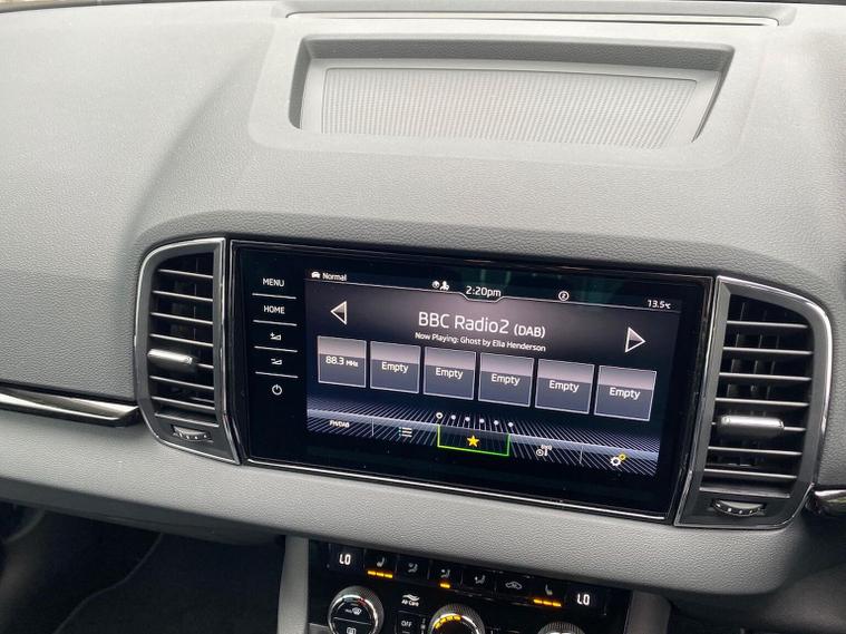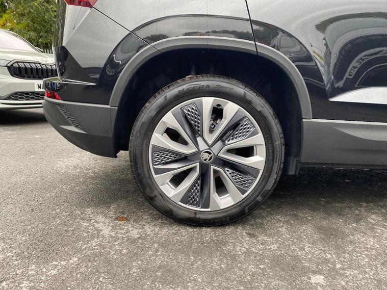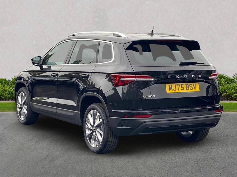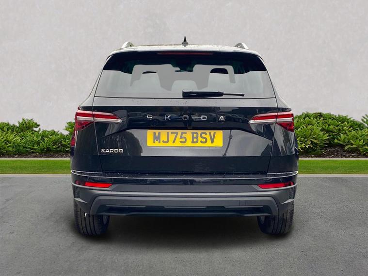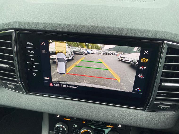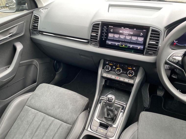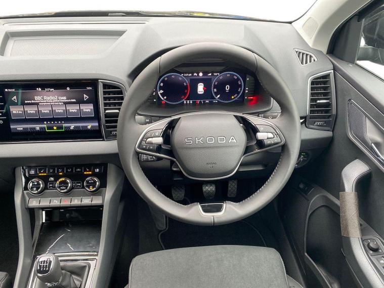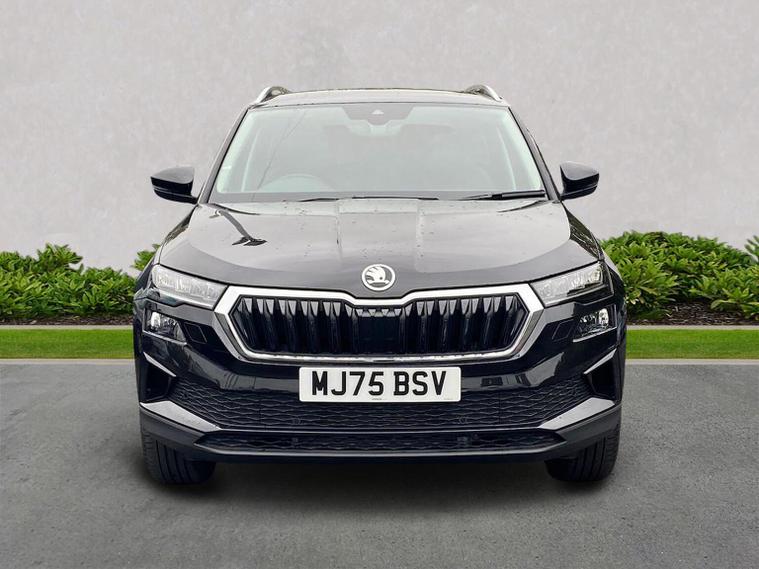 Skoda Karoq SE L Edition 1.0 TSI 116 PS manual in Black Magic Pearl Effect with Lounge interior includes the Lounge interior selection with comfort front seats chrome interior detailing decorative inserts air cleaner ECO function drive mode select and fabric seat trim. It also includes the SE L Edition package with 18 inch Procyon silver alloy wheels anthracite aero inserts adaptive cruise control and speed limiter front assist with emergency braking virtual cockpit wireless charging keyless entry and start electrically operated boot with virtual pedal front and rear parking sensors rear view camera headlight washers heated front seats Columbus navigation with 9.2 inch display WLAN and web radio chrome roof rails Karoq branded door steps rear spoiler alarm with interior monitoring backup horn and tilt sensor and a two spoke heated multifunction leather steering wheel. Standard equipment includes DAB radio Bluetooth SmartLink front and rear electric windows electrically adjustable heated folding mirrors heated rear window tyre repair kit LED daytime running lights LED rear lights halogen headlights privacy glass and body coloured exterior trim. Inside it offers dual zone climate control height adjustable front seats lumbar support textile floor mats front centre armrest overhead glasses holder illuminated glovebox reading lights rear seats with folding function and various storage features. Safety equipment includes front side and curtain airbags passenger airbag deactivation ESC ABS hill hold control lane assist front assist isofix on outer rear seats top tether alarm remote central locking two keys and seatbelt reminders. We offer personal video appointments test drives and can arrange finance.