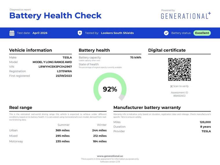 Viewing available 7 days a week at Lookers Birmingham. We have this EXCEPTIONAL Tesla Model Y, drenched in the stunning solid black paintwork and rolling on sleek 19-inch alloy wheels. It comes with 2 keys, and we’ve fully prepared this Model Y to our high standards here at Lookers Birmingham, ensuring it’s ready for its next owner to drive away with complete confidence. All our Electric cars are independently Battery Tested by third party testing company 'Generational-ev' , with battery test certificates provided for transparency and your complete piece of mind. This TESLA has resulted in a 'Excellent' rating so you can be confident in your purchase, the vehicle also benefit from the balance of the TESLA battery warranty. This example comes with an exceptional list of added features that elevate comfort, convenience and cutting-edge tech. It includes a panoramic glass roof, leather interior, and heated seats all round, creating a premium and comfortable environment for every passenger. The electric front seats with memory add extra convenience, while the premium audio system enhances the in-car experience. Technology is a major highlight, with satellite navigation, rear camera with indicator-linked side cameras, surround sensors, and Tesla’s Full Self-Driving Computer 3, offering advanced driver-assistance capability. The heat pump improves efficiency in colder weather, and traffic-aware cruise control provides smooth, intelligent speed management. Practicality is boosted by a powered tailgate, generous storage, and Tesla’s signature frunk, making everyday use effortless. With its strong electric performance, advanced technology and a comprehensive list of premium features, the Tesla Model Y Long Range stands out as a highly capable, modern and future-ready electric SUV. This car is Clean air zone compliant and does not attract any form of charge in Birmingham clean Air Zone. We understand that you rely on your car, so every car we sell is fully prepared to main dealer standard, for your peace of mind. All our vehicles pass a thorough 150 point check, are serviced and MOT’d as required by manufacturer trained technicians and are offered with up to 4 years warranty. Every car we sell is HPI clear so you can have the confidence that by choosing Lookers for your next purchase, you are choosing your perfect car. Competitive finance packages and nationwide delivery available. ESTABLISHED IN 1908, LOOKERS HAVE OVER 100 YEARS EXPERIENCE IN THE TRADE. BOOK YOUR TEST DRIVE NOW.