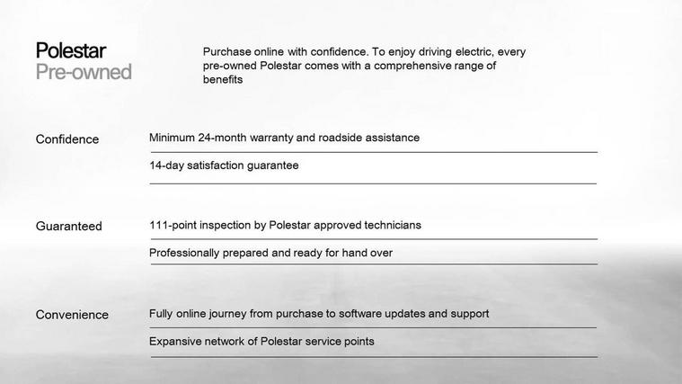 The only place to buy a manufacturer approved - Pre-owned Polestar – A Pre-owned Polestar is a new car to its next owner. That is why the Pre-owned programme follows the same hassle-free buying experience as a new Polestar. Everything from searching & viewing to ordering a Pre-owned Polestar can be done online. Each Polestar is inspected & serviced with the same attention to detail, guaranteeing all cars continue to deliver pure, progressive performance. Benefits of the Pre-owned Programme: Our used cars are covered by a comprehensive 24-month Pre-owned Polestar warranty and roadside assistance package to preserve the thrill of electric driving. To make the transition to sustainable electric performance a comfortable one, every Pre-owned Polestar comes with a comprehensive 14-day satisfaction guarantee so you can drive with confidence. To ensure a used car meets the highest standard of quality, our technicians meticulously inspect the condition of a Pre-owned Polestar using a 111-point checklist. If anything fails to meet Polestar standards during the inspection process, refurbishments are always performed using genuine Polestar parts. Taking ownership of a Pre-owned Polestar is the first step on a fully connected journey. A journey where your Polestar seamlessly integrates into your digital life with regular Over-The-Air (OTA) software updates, a direct connection to Polestar support, and an infotainment system featuring apps that optimise the in-car experience. Feel confident having 8 Years / 100, 000-mile battery warranty, this starts from first registration. Alongside the standard 24-month Preowned Polestar Warranty. *Subject to terms and conditions. LIMITED TIME OFFERS: Receive a Zaptec home charging solution for an exclusive price of £995. For terms and conditions please visit dealer's website