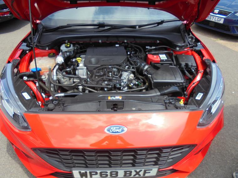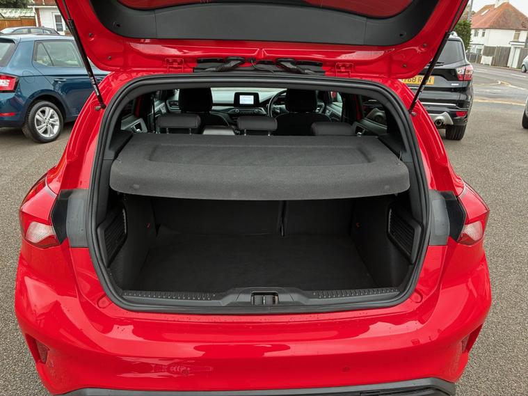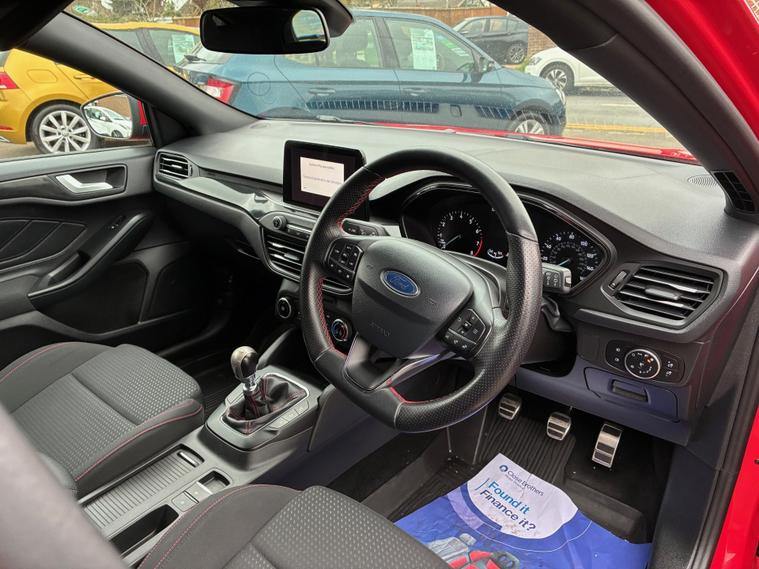 A Ford Focus ST-Line 1.0 EcoBoost [125] 5 Dr [6] with 32, 100 Miles. Finished in the striking colour of Race Red the car presents exactly as you would expect with the low mileage.Upon opening the door of this volcanic Focus, you are instantly greeted with great styling. The sporty theme is continued inside. Every car is kitted out with front Recaro sports seats, contrast piping, carbon fibre trim, extra gauges on the dash, sports steering wheel, metal pedals, metal gear lever & a generous distribution of ST badges as standard. One of the Hot hatches around, this will delight on every level.,