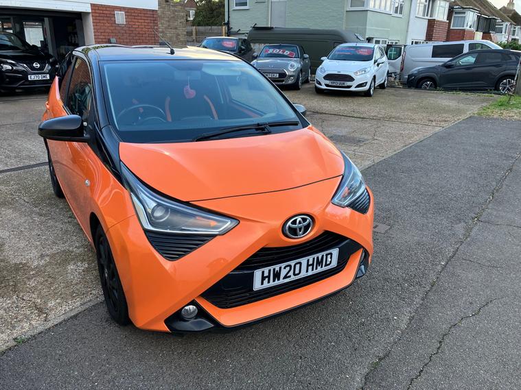 A Striking Toyota Aygo X-Cite 1.0 VVT-i 5 Dr Petrol Euro 6 (71 ps) X-Shift Auto with only 33, 500 Miles from new.Fabulous looking, Bi-Tone paint option metallic orange with gloss black accents on the exterior and interior, and featuring a 1.0-liter petrol engine with 71 horsepower, meeting Euro 6 emissions standards, and equipped with the X-Shift automated manual transmission.Funky fuel efficient car with It is a 5-door hatchback with distinctive X-Cite specific trim level that emphasizes a stylish and customized appearance. styling, including glossy black wheels and mirrors, and comes with modern features like a touchscreen infotainment system with smartphone integration, a reversing camera, and climate control. ,