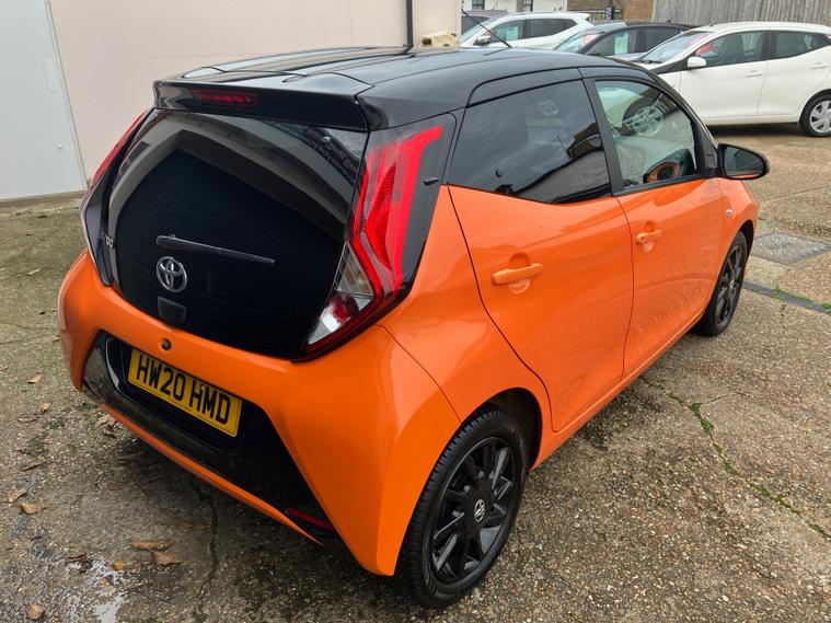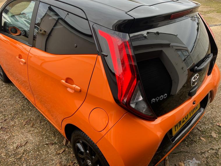 A Striking Toyota Aygo X-Cite 1.0 VVT-i 5 Dr Petrol Euro 6 (71 ps) X-Shift Auto with only 33, 500 Miles from new. Fabulous looking, Bi-Tone paint option metallic orange with gloss black accents on the exterior/interior & featuring a 1.0L petrol engine with 71 horsepower. Funky fuel efficient car with it is a 5 Dr hatchback with distinctive X-Cite specific trim level that emphasizes a stylish & customized appearance. Styling including glossy black wheels & mirrors & comes with modern features like a touchscreen infotainment system with smartphone integration, a reversing camera & climate control,