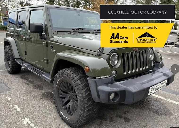 Cuckfield Motor Company are delighted to offer for sale this Iconic Jeep Wrangler 75th Anniversary Edition. Finished in Sarge Green with 1/2 Black Leather this stunning vehicle has recorded service visits at 12164, 19067, 29328, 38566 and 50937 miles. In addition it had New Rear Discs and Pads in 2024. Specification includes Removable Roof---Sat Nav---Bluetooth Phone & Audio Connectivity---4 Wheel Drive---Full Size Spare Wheel---Heated Front Seats---USB & AUX---Air Conditioning---17'' Black Alloy Wheels---Privacy Glass---Tow Bar---Alpine Sound System---Electric Mirrors---Cruise Control---Electric Windows and more.Every car we offer comes with a comprehensive provenance check certificate, Minimum 6 month warranty and new MOT and service where applicable. All part exchanges welcome.We offer extremely competitive finance packages to help you fund your new car.Cuckfield Motor Company Ltd is a family run business FCA approved dealer established for over 20 years, With 30 years experience in the motor trade.We are located in the village of Cuckfield just off the A23, 15 minutes from Gatwick airport and only 5 minutes from Haywards Heath train station.Please contact us via phone/email to view this car today. email us on: dealer's website