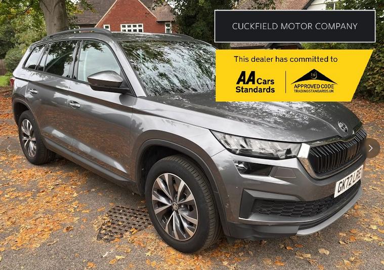 Cuckfield Motor Company are delighted to offer for sale this well presented 7 Seat, Skoda Kodiaq SE TSi Automatic. Finished in Metallic Grey with Black Interior, this car has excellent specification including Sat Nav---Bluetooth Phone & Audio---Front & Rear Parking Sensors---Rear View Camera---7 Seats---Rear Spoiler---Privacy Glass---USBC---18'' Alloys---Air Con---Keyless Entry & Start---Cruise Control---Park Assist---Virtual Pedal to operate boot and moreEvery car we offer comes with a comprehensive provenance check certificate, Minimum 6 month warranty and new MOT and service where applicable. All part exchanges welcome.We offer extremely competitive finance packages to help you fund your new car.Cuckfield Motor Company Ltd is a family run business FCA approved dealer established for over 20 years, With 30 years experience in the motor trade.We are located in the village of Cuckfield just off the A23, 15 minutes from Gatwick airport and only 5 minutes from Haywards Heath train station.Please contact us via phone/email to view this car today. email us on: dealer's website