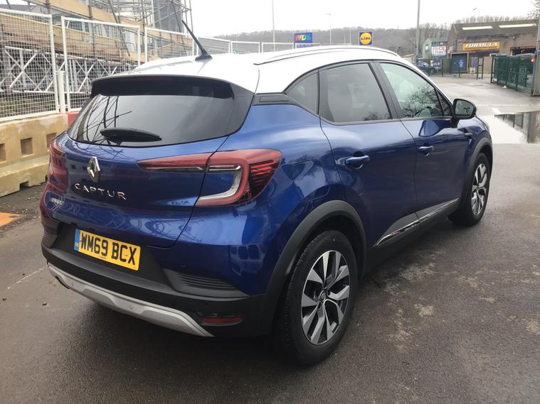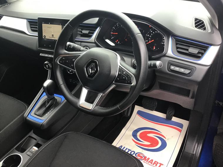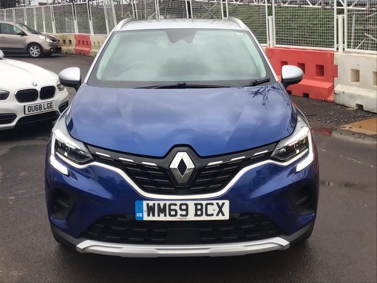 ** MAIN DEALER SERVICE HISTORY ** This 2019 Renault Captur 1.3 TCe Iconic SUV has done 45595 miles and runs on Petrol. It is ULEZ compliant and comes with an MOT that expires on 30/12/2026. This 5-door, 5-seater SUV is equipped with features including Emergency Spare Wheel - Space Saver, 17in Alloy Wheels - Bahamas, and Black Gloss Side Door Protection with Chrome Insert. Its Iron Blue with Highland Grey Roof exterior and Blue Interior Colour Pack make for a sleek and stylish look on the road. With a powerful 130 ps engine and EDC Euro 6 (s/s) technology, this Captur is ready to take on any adventure.