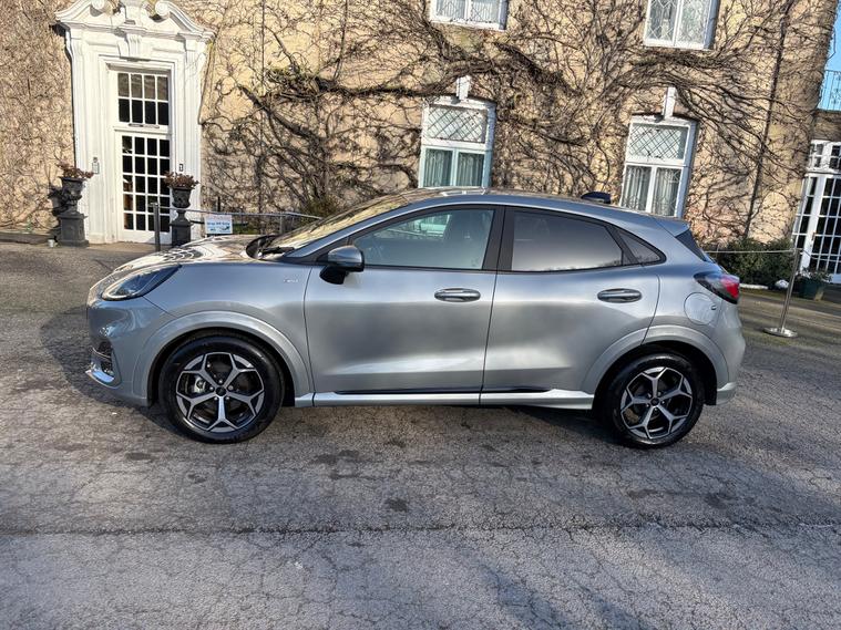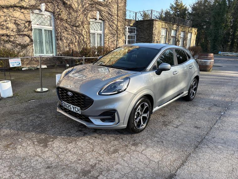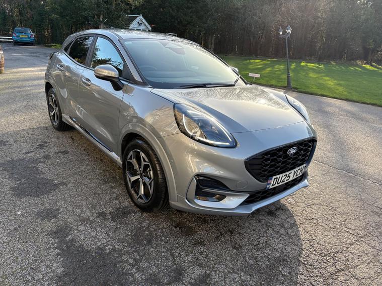V CAR CAT S. Introducing the 2025 Ford Puma 1.0T EcoBoost MHEV ST-Line SUV, a powerful and efficient petrol hybrid vehicle with only 1800 miles on the clock. This stylish SUV boasts 5 seats and 5 doors, making it perfect for family adventures. Not only is it ULEZ compliant, but it also features a range of impressive extras including Solar Silver exterior, Cloth interior in Black with Red Stitching, Winter Pack, and 17in Alloy Wheels with a Black Machined Finish. Inside, you'll find a 12in Landscape Touchscreen Display, Wireless Apple CarPlay and Android Auto, Ford SYNC Navigation, FordPass Connect, and Emergency Assist. With 6 speakers, you'll enjoy a superior sound experience. The 125 ps engine delivers a dynamic driving experience, and the manual transmission gives you full control on the road. Get ready to experience the ultimate blend of power and efficiency with the Ford Puma SUV.,
