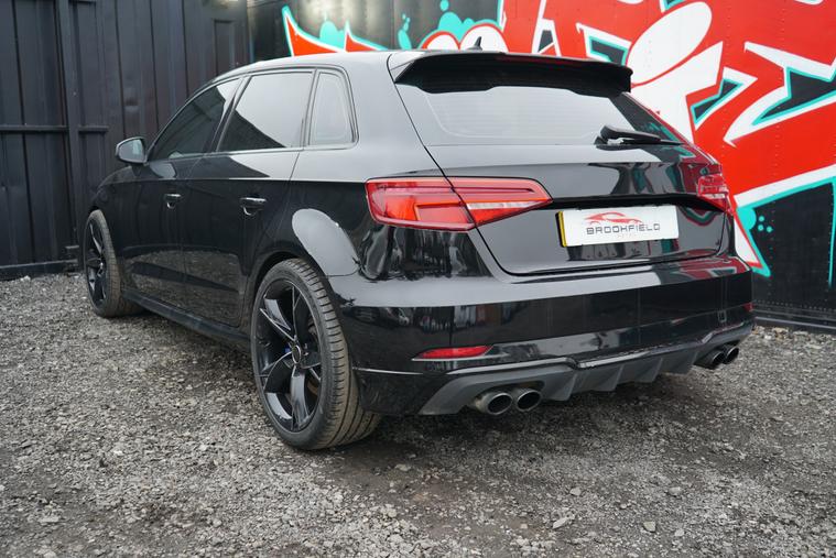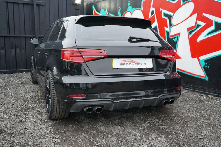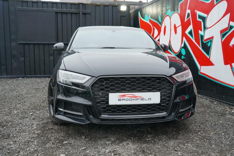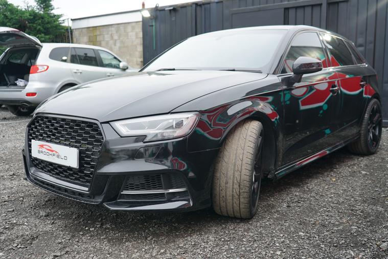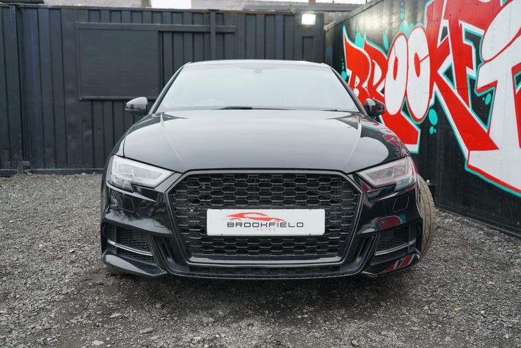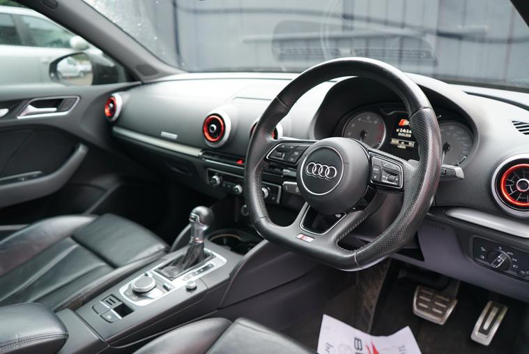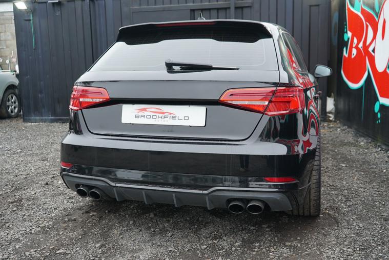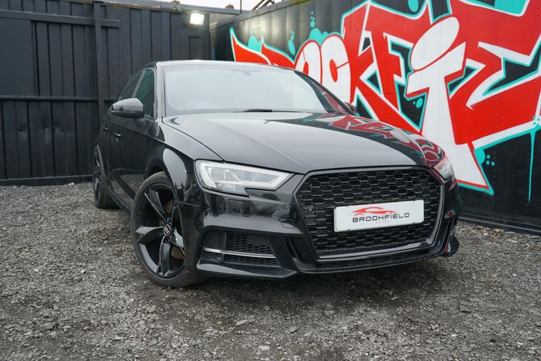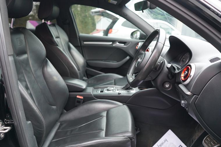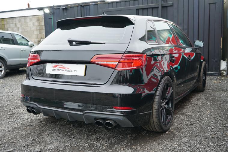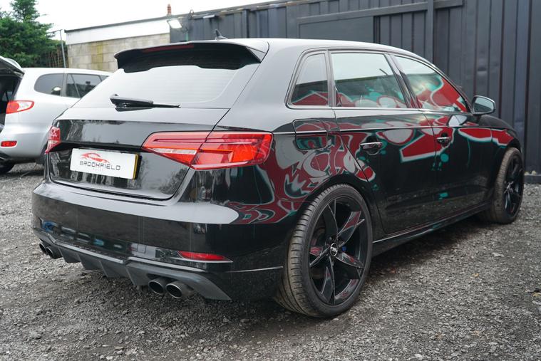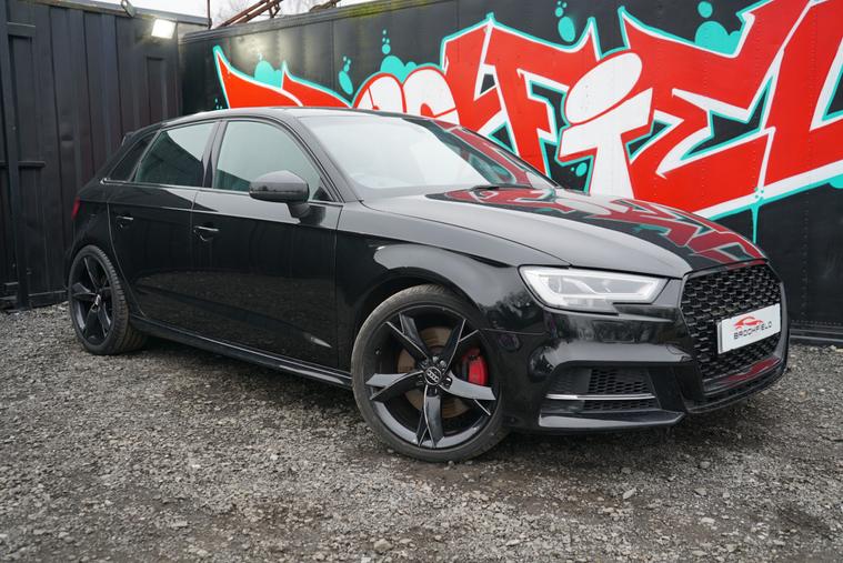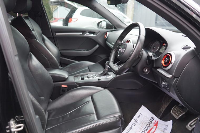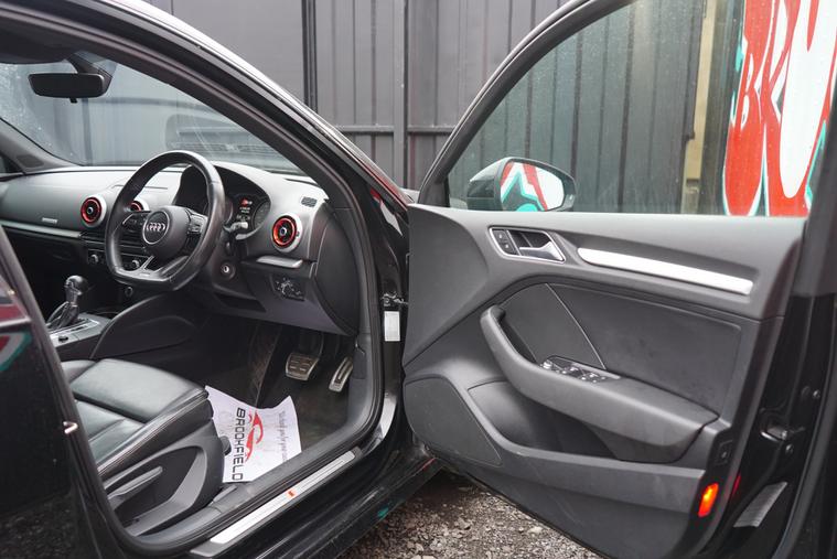 Brookfield Autos are proud to present to market our lovely 2017 Audi S3. Supplied in Black, and complimented by a black nappa leather and alcantara interior, it presents beautifully. Black Alloys, privacy glass and trademark S3 quad exhaust and matte chrome wing mirror covers complete the look. On the interior, it has a flat bottomed multifunction steering wheel, Black Styling Pack, Heated Seats, satellite navigation, DAB digital radio. Only 3 owners from new, with a superb service history record. An absolute credit to its previous keepers, we think you will struggle to find a better cared for example in better condition. Comfortable and sedate when it needs to be, with the legendary Quattro all-wheel drive system always on hand should conditions deteriorate and 306 horsepower under your right foot, this is the perfect all round vehicle.
