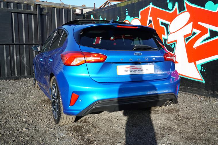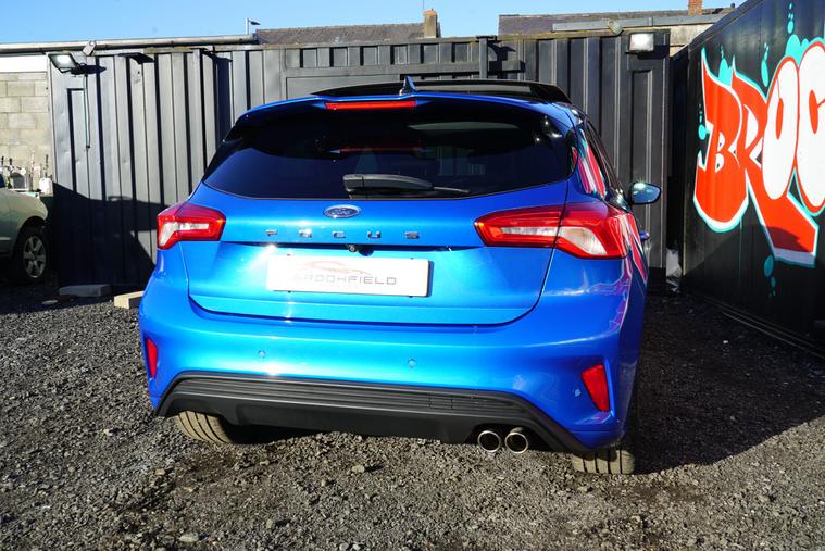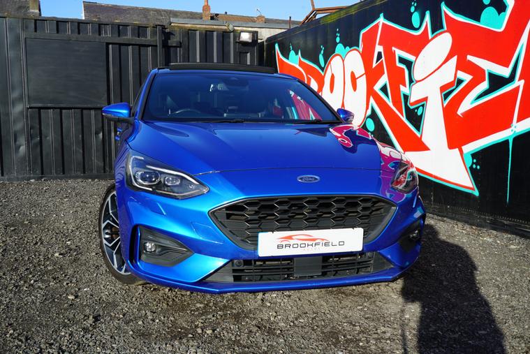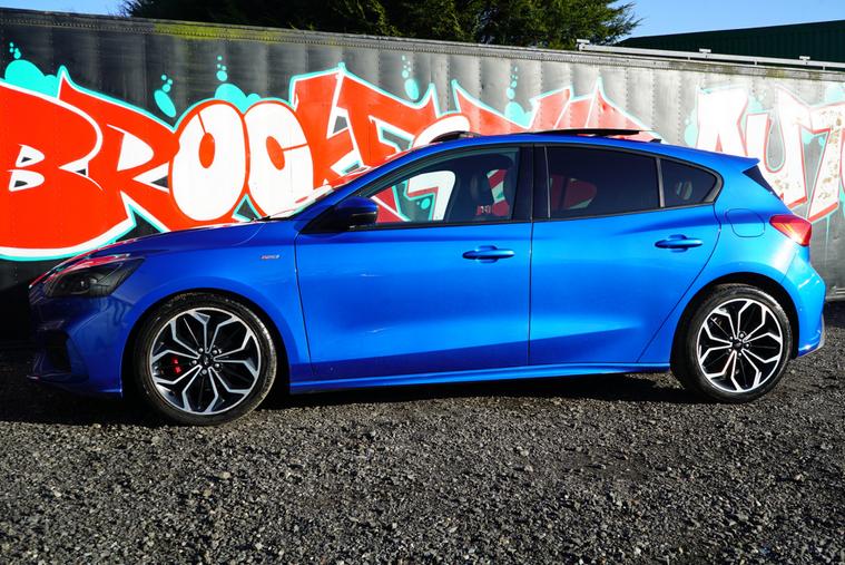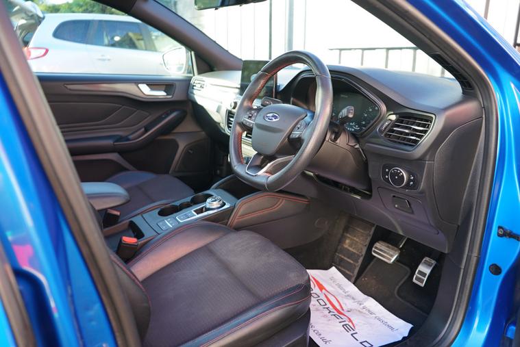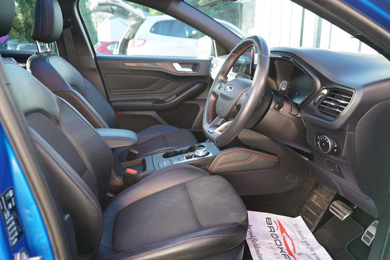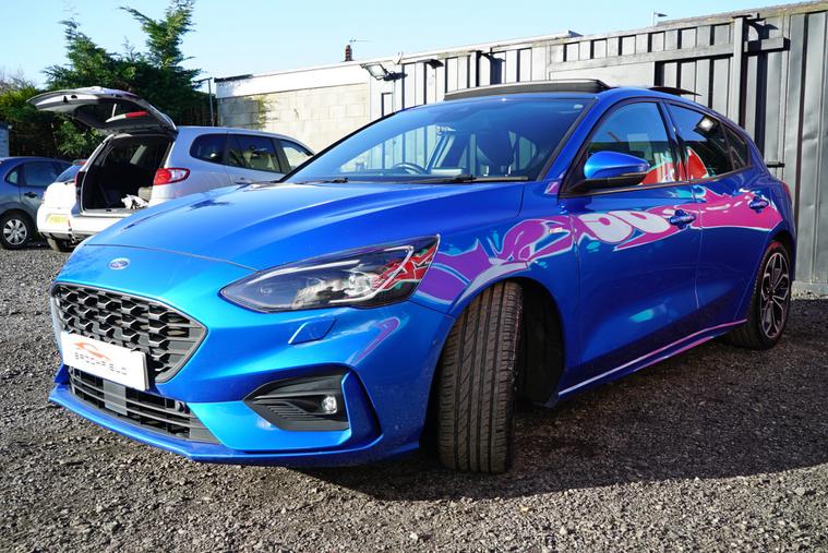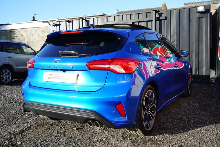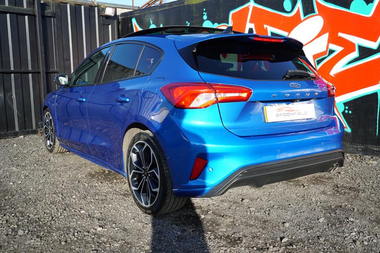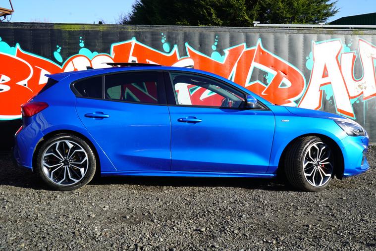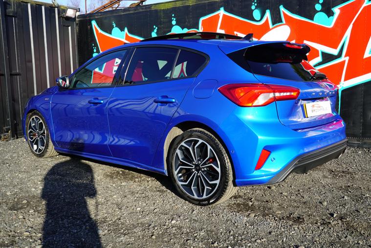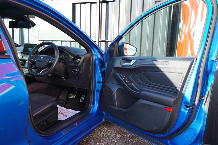 This 2018 Ford Focus 1.5 EcoBlue ST-Line X Hatchback with 77300 miles on the clock is a Diesel car that is ULEZ compliant, with MOT expiring on 01/01/2027. It features a spacious 5-seater, 5-door hatchback design, making it ideal for families or those needing extra space. In addition to its reliable and efficient diesel engine, this car includes desirable features such as a panoramic openable roof, B&O PLAY Premium Audio System, heated steering wheel, and 18in alloy wheels with a stylish ST-Line Matt Black Machined Black finish, all packaged in a sleek Desert Island Blue exterior, making it an attractive and well-equipped vehicle for any driver.