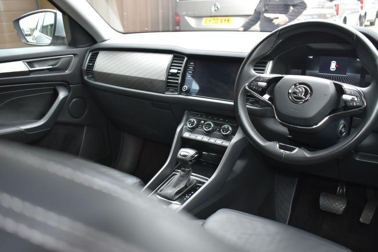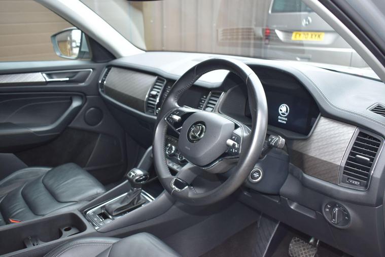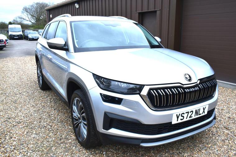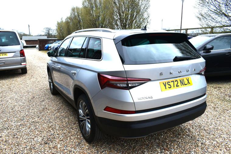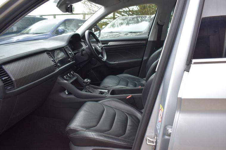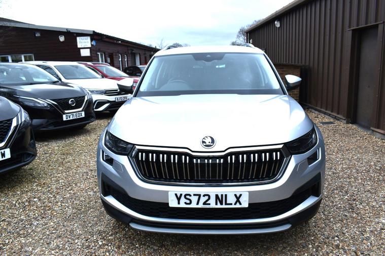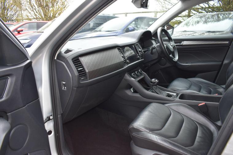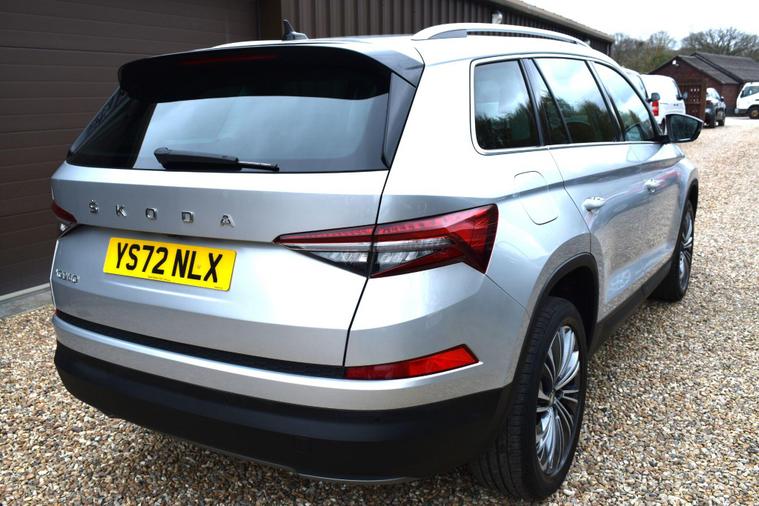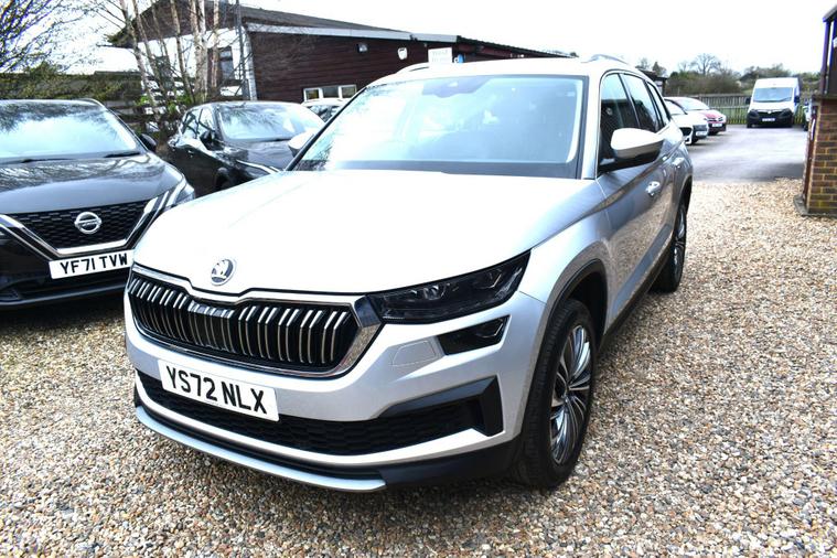 Finished in Silver with black leather interior. Finished in Silver with black leather interior, privacy glass, chrome roof rails, front and rear parking sensors, 19'' alloys, keyless entry, automatic, Bluetooth, DAB radio, electric seats and mmory, keyless start, air con, heated front seats, 7 seats, traction control, electric folding mirrors, reverse camera with guidelines, DAB radio, sat nav, electric boot, HPI clear, one owner from new, Skoda service history.... for further information please contact us on 01483334205. This 2022 Skoda Kodiaq TSI SE L Executive is a superb example, having had only one owner since new. This seven seat SUV boasts a 1.5 litre petrol engine and meets Euro 6 emissions standards. Inside, you'll find a wealth of technology designed for comfort and convenience, including wireless charging for your devices, dual zone climate control with a humidity sensor, and SmartLink which seamlessly integrates Android Auto and Apple CarPlay. The SE L Executive trim also features impressive Full LED Matrix headlights with an adaptive front light system, including cornering and all weather lighting functions, and an electrically adjustable driver's seat with a memory function.The Kodiaq TSI SE L Executive offers a compelling driving experience, with its 0-60mph acceleration achieved in just 9.5 seconds. These features collectively demonstrate how this particular Kodiaq provides a superior offering compared to other vehicles in its class. The combination of its spacious seven seat layout, efficient 1.5 litre petrol engine, and advanced technology makes it a practical and well equipped choice for families and individuals alike.