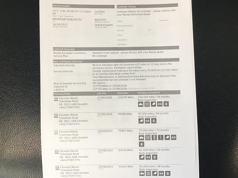 ** FULL MAZDA SERVICE HISTORY AND 1 OWNER FROM NEW** This 2017 Mazda CX-3 2.0 SKYACTIV-G SE-L Nav SUV with 123471 miles on the clock is a reliable SUV perfect for family outings, with 5 seats and 5 doors. Running on petrol and Euro 6 compliant, this vehicle comes with a manual transmission and will not let you down with its 121 ps power. With an MOT valid until 15/09/2026, you can drive with peace of mind. This car is ULEZ compliant and includes features such as 16in Alloy Wheels, Electrically Adjustable-Heated-Folding-Turning Signal Door Mirrors, Dual Exhaust System, Electric Windows, and an Emergency Tyre Repair Kit. Whether you're cruising around town or heading off on a road trip, this Mazda CX-3 is ready for any adventure.