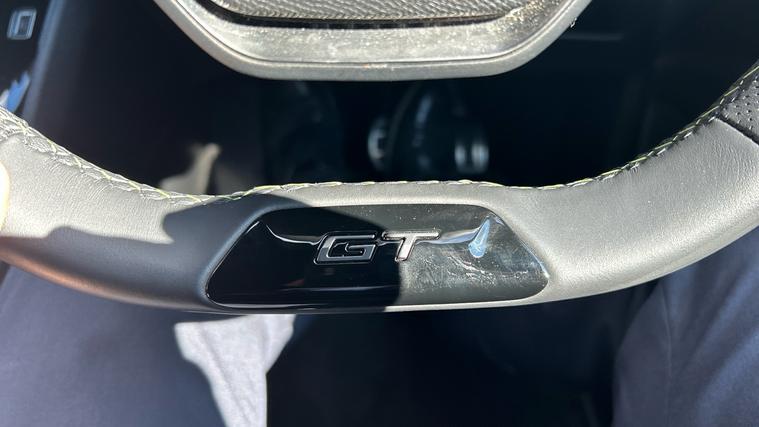 - Multifunction Full Grain Perforated Leather Steering Wheel with Adamite Green Stitching and GT Emblem