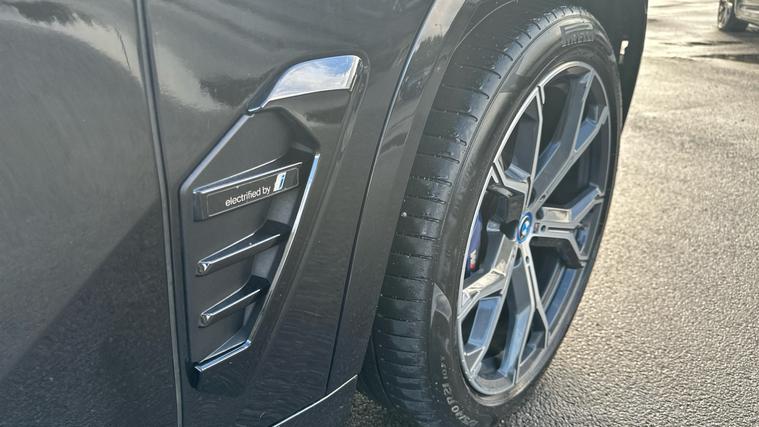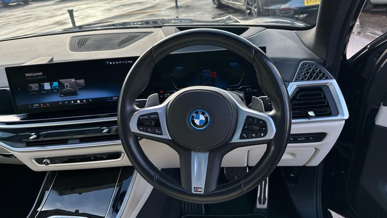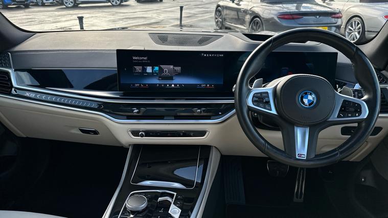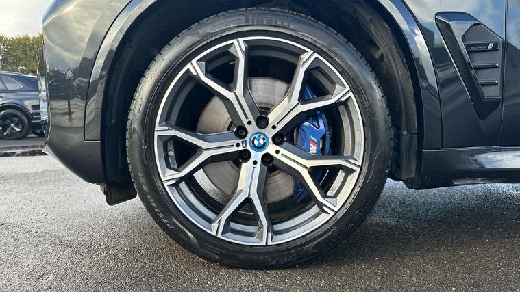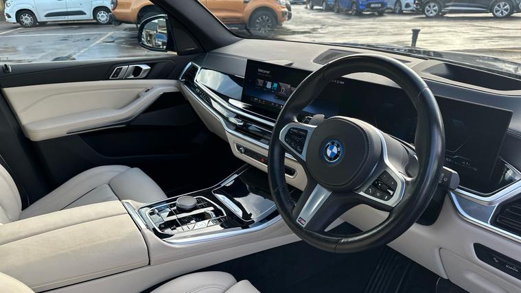 VAT Qaulifying BMW X5 50e M Sport Finished in Black Sappire with Individual Extended Marino Leather in Black. Pro Pack, Acoustic glass, Sun protection glass, Sky Lounge panoramic glass sunroof, Travel and comfort system pack, BMW Individual piano black interior trim, 21 Y spoke light alloy with mixed tyre in bicolour finish -style 741 M with runflat, Comfort plus pack without comfort access system, Technology plus pack with digital live cockpit pro.