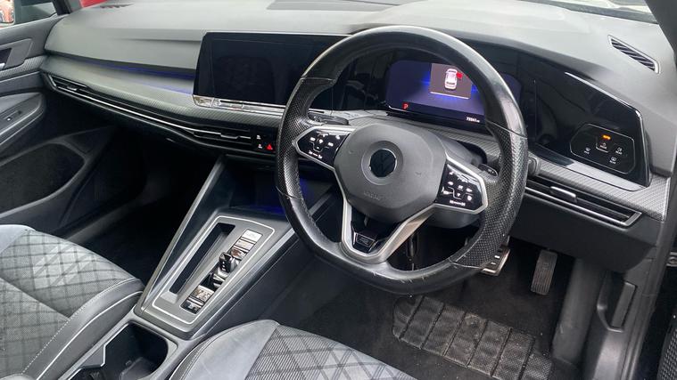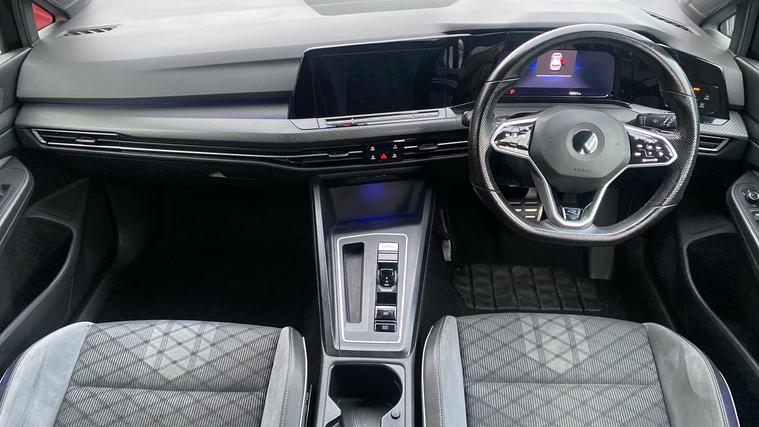 The 2021 Golf R-Line blends premium style, advanced tech and comfort in one sleek package luxurious in detail, confident in drive. The 2021 Golf 1.5 eTSI 150 R-Line DSG offers a refined hatchback cabin loaded with premium touches. It includes a digital cockpit display, ambient lighting (30 selectable colours), automatic LED headlights with Coming Home / Leaving Home functionality, a leather-wrapped R-Line multifunction sports steering wheel, front + rear parking sensors with camera, heat-insulated glass, rain-sensing wipers, privacy tinted rear windows from the B-pillar back, and body-colour R-Line styling (bumpers, mirrors, spoiler). Inside, you'll also get heated front seats, dual-zone climate control, wireless charging pad, rear USB-C/USB sockets, and sophisticated infotainment with dictation/navigation, Apple CarPlay/Android Auto. The R-Line seat trims, alloy wheels, and high-quality materials give it an upscale feel beyond what many expect from a standard hatch.